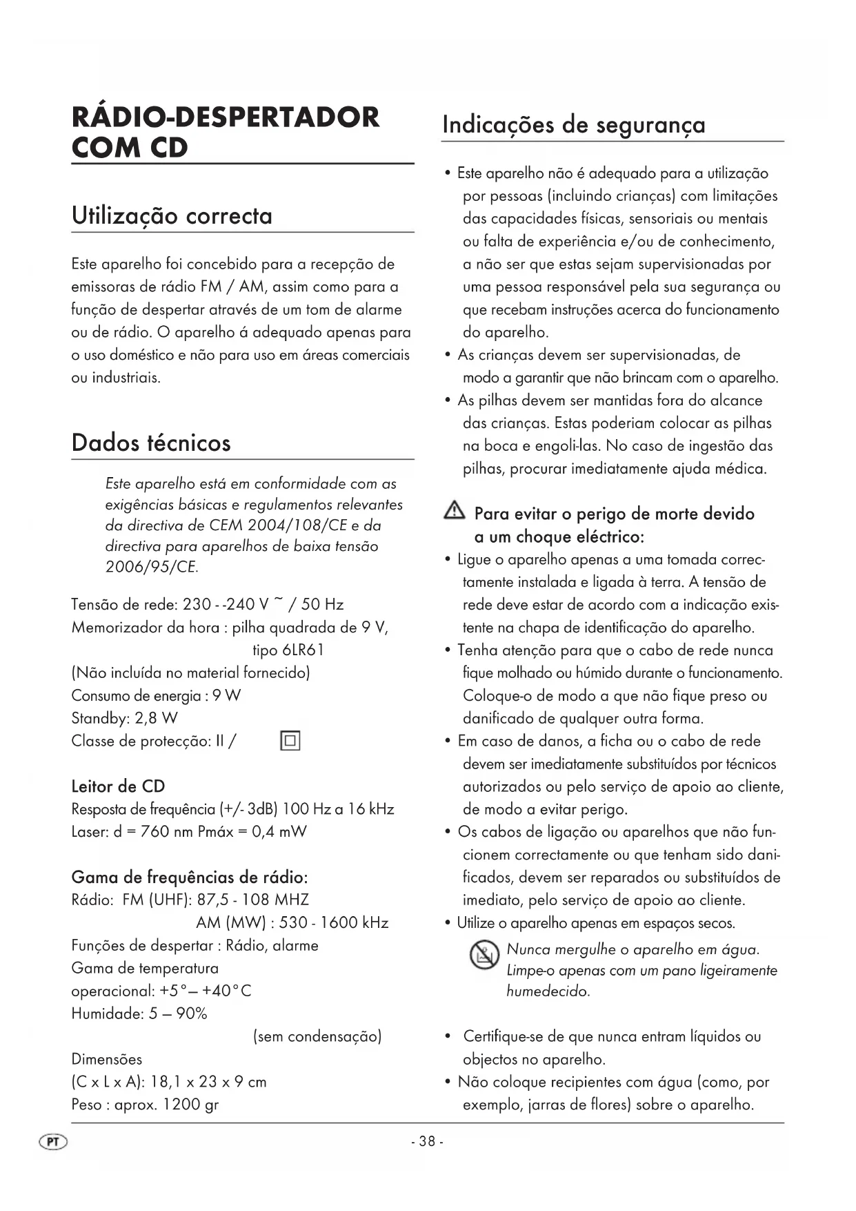 - Sleep Limpeza 44 Eliminação 44 Garantia e assistência técnica 44 Importador 45 Leia atentamente o manual de instruções antes da primeira utilização e conserve-o para consulta posterior. Ao entregar o aparelho a terceiros, entregue também o manual. IB_KH2254_AR4141_LB1_PT.qxd 28.02.2008 11:04 Uhr Seite 37- 38 - RÁDIO-DESPERTADOR COM CD Utilização correcta Este aparelho foi concebido para a recepção de emissoras de rádio FM / AM, assim como para a função de despertar através de um tom de alarme ou de rádio. O aparelho á adequado apenas para o uso doméstico e não para uso em áreas comerciais ou industriais. Dados técnicos Este aparelho está em conformidade com as exigências básicas e regulamentos relevantes da directiva de CEM 2004/108/CE e da directiva para aparelhos de baixa tensão 2006/95/CE. Tensão de rede: 230 - -240 V ~ / 50 Hz Memorizador da hora : pilha quadrada de 9 V, tipo 6LR61 (Não incluída no material fornecido) Consumo de energia : 9 W Standby: 2,8 W Classe de protecção: II / Leitor de CD Resposta de frequência (+/- 3dB) 100 Hz a 16 kHz Laser: d = 760 nm Pmáx = 0,4 mW Gama de frequências de rádio: Rádio: FM (UHF): 87,5 - 108 MHZ AM (MW) : 530 - 1600 kHz Funções de despertar : Rádio, alarme Gama de temperatura operacional: +5°— +40°C Humidade: 5 — 90% (sem condensação) Dimensões (C x L x A): 18,1 x 23 x 9 cm Peso : aprox. 1200 gr Indicações de segurança p. 44