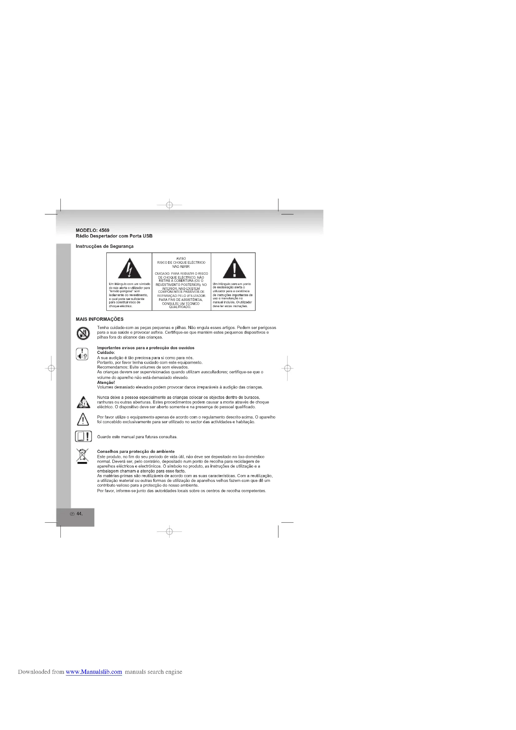 Downloaded from www.Manualslib.com manuals search engine44. MODELO: 4569 Rádio Despertador com Porta USB Instrucções de Segurança Um triângulo com um ponto de exclamação alerta o utilizador para a existência de instruções importantes de uso e manutenção no manual incluído. O utilizador deve ler estas instruções.Um triângulo com um símbolo de raio alerta o utilizador para "tensão perigosa" sem isolamento do revestimento, a qual pode ser suficiente para constituir risco de choque eléctrico.Tenha cuidado com as peças pequenas e pilhas. Não engula esses artigos. Podem ser perigosos para a sua saúde e provocar asfixia. Certifique-se que mantém estes pequenos dispositivos e pilhas fora do alcance das crianças.Importantes avisos para a protecção dos ouvidosCuidado:A sua audição é tão preciosa para si como para nós.Portanto, por favor tenha cuidado com este equipamento.Recomendamos: Evite volumes de som elevados.As crianças devem ser supervisionadas quando utilizam auscultadores; certifique-se que o volume do aparelho não está demasiado elevado.Atenção!Volumes demasiado elevados podem provocar danos irreparáveis à audição das crianças.Nunca deixe a pessoa especialmente as crianças colocar os objectos dentro de buracos, ranhuras ou outras aberturas. Estes procedimentos podem causar a morte através de choque eléctrico. O dispositivo deve ser aberto somente e na presença do pessoal qualificado.Por favor utilize o equipamento apenas de acordo com o regulamento descrito acima. O aparelho foi concebido exclusivamente para ser utilizado no sector das actividades e habitação.Guarde este manual para futuras consultas.Conselhos para protecção do ambienteEste produto, no fim do seu período de vida útil, não deve ser depositado no lixo doméstico normal. Deverá ser, pelo contrário, depositado num ponto de recolha para reciclagem de aparelhos eléctricos e electrónicos. O símbolo no produto, as instruções de utilização e a embalagem chamam a atenção para esse facto.As matérias-primas são reutilizáveis de acordo com as suas características. Com a reutilização, a utilização material ou outras formas de utilização de aparelhos velhos fazem com que dê um contributo valioso para a protecção do nosso ambiente.Por favor, informe-se junto das autoridades locais sobre os centros de recolha competentes.