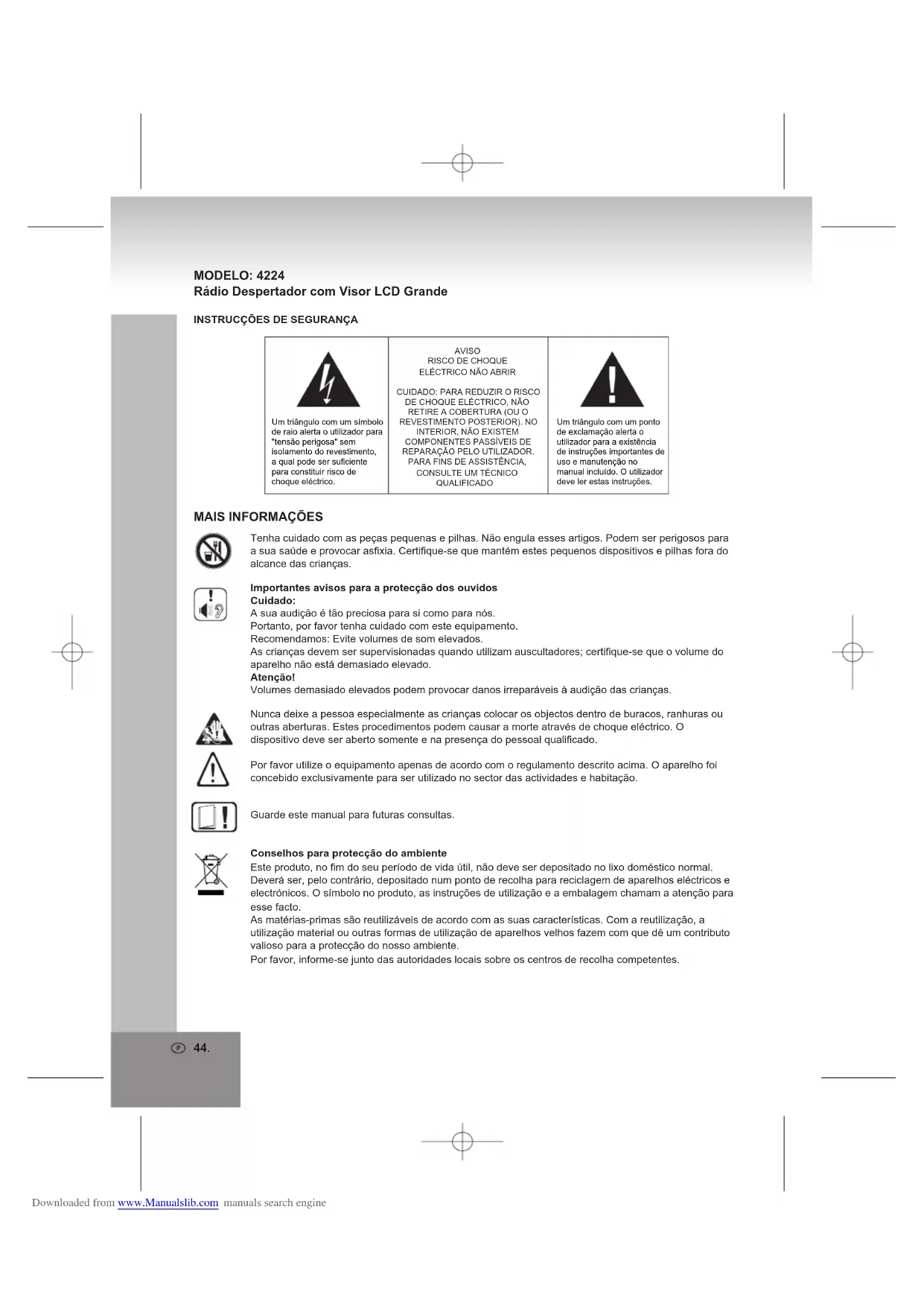 AVISORISCO DE CHOQUEELÉCTRICO NÃO ABRIRCUIDADO: PARA REDUZIR O RISCO DE CHOQUE ELÉCTRICO, NÃO RETIRE A COBERTURA (OU O REVESTIMENTO POSTERIOR). NO INTERIOR, NÃO EXISTEM COMPONENTES PASSÍVEIS DE REPARAÇÃO PELO UTILIZADOR. PARA FINS DE ASSISTÊNCIA, CONSULTE UM TÉCNICO QUALIFICADO Downloaded from www.Manualslib.com manuals search engine45. Não impedir a ventilação dos dispositivos. Tenha a certeza que as curtinhas, os jornais, panos de cobrir os mobiliários não impedir a ventilação das aberturas de aparelhos. A ventilação deve manter-se a qualquer momento. Aquecer-se demais pode provocar sério dano no dispositivo e reduzir o seu desempenho por toda a vida.CalorNão expor o aparelho directamente à luz solar. Tenha atenção para não expor o aparelho a fontes de calor como aquecedores ou fontes de chama descoberta. Tenha atenção para que as fendas de arejamento do aparelho não estejam cobertas.Humidade e LimpezaEste aparelho não é à prova de água. Não mergulhe o aparelho em água. Não deixe que este entre em contacto com água. Se entrar água no aparelho, pode provocar sérios danos. Não use agentes de limpeza que contenham álcool, amoníaco, benzeno ou abrasivos, pois podem danificar o aparelho. Utilize um pano macio e húmido para limpar o aparelho.Reciclagem ProfissionalPilhas e materiais de embalagem não pertencem ao lixo doméstico. As pilhas devem ser colocadas num ponto de recolha para pilhas usadas. A separação dos materiais de embalagem preserva o ambiente.