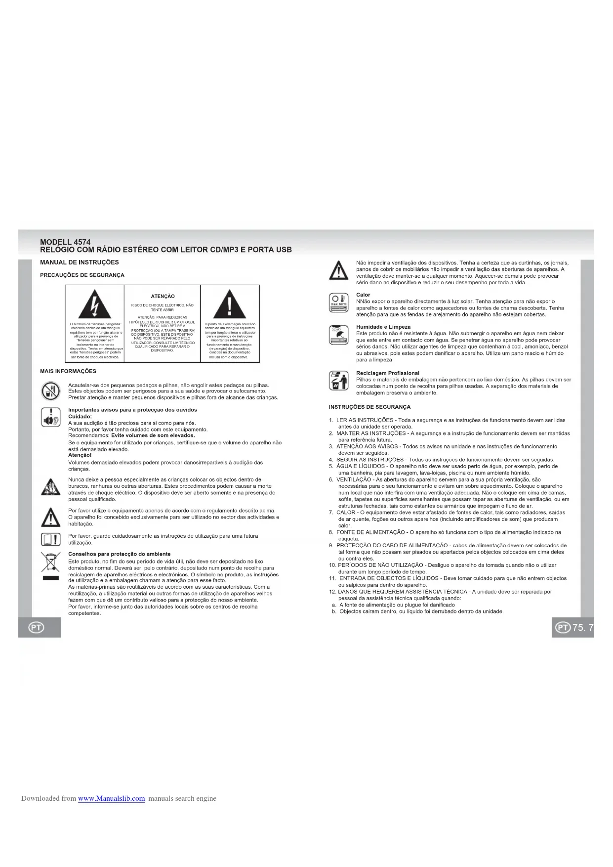 - No toque la lente lectora. Downloaded from www.Manualslib.com manuals search engine75. 74. O símbolo de “tensões perigosas” colocado dentro de um triângulo equilátero tem por função alterar o utilizador para a presença de “tensões perigosas” sem isolamento no interior do dispositivo. Tenha em atenção que estas “tensões perigosas” podem ser fonte de choques eléctricos.O ponto de exclamação colocado dentro de um triângulo equilátero tem por função alterar o utilizador para a presença de instruções importantes relativas ao funcionamento e manutenção (reparação) do dispositivo, contidas na documentação inclusa com o dispositivo.ATENÇÃORISCO DE CHOQUE ELÉCTRICO, NÃO TENTE ABRIRATENÇÃO: PARA REDUZIR AS HIPÓTESES DE OCORRER UM CHOQUE ELÉCTRICO, NÃO RETIRE A PROTECÇÃO (OU A TAMPA TRASEIRA) DO DISPOSITIVO. ESTE DISPOSITIVO NÃO PODE SER REPARADO PELO UTILIZADOR. CONSULTE UM TÉCNICO QUALIFICADO PARA REPARAR O DISPOSITIVO. MODELL 4574 RELÓGIO COM RÁDIO ESTÉREO COM LEITOR CD/MP3 E PORTA USB Por favor utilize o equipamento apenas de acordo com o regulamento descrito acima.O aparelho foi concebido exclusivamente para ser utilizado no sector das actividades e habitação.Por favor, guarde cuidadosamente as instruções de utilização para uma futurautilização.Conselhos para protecção do ambienteEste produto, no fim do seu período de vida útil, não deve ser depositado no lixo doméstico normal. Deverá ser, pelo contrário, depositado num ponto de recolha para reciclagem de aparelhos eléctricos e electrónicos. O símbolo no produto, as instruções de utilização e a embalagem chamam a atenção para esse facto.As matérias-primas são reutilizáveis de acordo com as suas características. Com a reutilização, a utilização material ou outras formas de utilização de aparelhos velhos fazem com que dê um contributo valioso para a protecção do nosso ambiente.Por favor, informe-se junto das autoridades locais sobre os centros de recolha competentes.Nunca deixe a pessoa especialmente as crianças colocar os objectos dentro de buracos, ranhuras ou outras aberturas. Estes procedimentos podem causar a morte através de choque eléctrico. O dispositivo deve ser aberto somente e na presença do pessoal qualificado.Acautelar-se dos pequenos pedaços e pilhas, não engolir estes pedaços ou pilhas. Estes objectos podem ser perigosos para a sua saúde e provocar o sufocamento. Prestar atenção e manter pequenos dispositivos e pilhas fora de alcance das crianças.Importantes avisos para a protecção dos ouvidosCuidado:A sua audição é tão preciosa para si como para nós.Portanto, por favor tenha cuidado com este equipamento.Recomendamos: Evite volumes de som elevados.Se o equipamento for utilizado por crianças, certifique-se que o volume do aparelho não está demasiado elevado.Atenção!Volumes demasiado elevados podem provocar danosirreparáveis à audição das crianças.MANUAL DE INSTRUÇÕESPRECAUÇÕES DE SEGURANÇAMAIS INFORMAÇÕESINSTRUÇÕES DE SEGURANÇA1. LER AS INSTRUÇÕES - Toda a segurança e as instruções de funcionamento devem ser lidas antes da unidade ser operada. 2. MANTER AS INSTRUÇÕES - A segurança e a instrução de funcionamento devem ser mantidas para referência futura.3. ATENÇÃO AOS AVISOS - Todos os avisos na unidade e nas instruções de funcionamento devem ser seguidos. 4. SEGUIR AS INSTRUÇÕES - Todas as instruções de funcionamento devem ser seguidas. 5. ÁGUA E LÍQUIDOS - O aparelho não deve ser usado perto de água, por exemplo, perto de uma banheira, pia para lavagem, lava-loiças, piscina ou num ambiente húmido.6. VENTILAÇÃO - As aberturas do aparelho servem para a sua própria ventilação, são necessárias para o seu funcionamento e evitam um sobre aquecimento. Coloque o aparelho num local que não interfira com uma ventilação adequada. Não o coloque em cima de camas, sofás, tapetes ou superficies semelhantes que possam tapar as aberturas de ventilação, ou em estruturas fechadas, tais como estantes ou armários que impeçam o fluxo de ar.7. CALOR - O equipamento deve estar afastado de fontes de calor, tais como radiadores, saídas de ar quente, fogões ou outros aparelhos (incluindo amplificadores de som) que produzam calor. 8. FONTE DE ALIMENTAÇÃO - O aparelho só funciona com o tipo de alimentação indicado na etiqueta. 9. PROTECÇÃO DO CABO DE ALIMENTAÇÃO - cabos de alimentação devem ser colocados de tal forma que não possam ser pisados ou apertados pelos objectos colocados em cima deles ou contra eles. 10. PERÍODOS DE NÃO UTILIZAÇÃO - Desligue o aparelho da tomada quando não o utilizar durante um longo período de tempo.11. ENTRADA DE OBJECTOS E LÍQUIDOS - Deve tomar cuidado para que não entrem objectos ou salpicos para dentro do aparelho.12. DANOS QUE REQUEREM ASSISTÊNCIA TÉCNICA - A unidade deve ser reparada por pessoal da assistência técnica qualificada quando: a. A fonte de alimentação ou plugue foi danificado b. Objectos cairam dentro, ou líquido foi derrubado dentro da unidade. Não impedir a ventilação dos dispositivos. Tenha a certeza que as curtinhas, os jornais, panos de cobrir os mobiliários não impedir a ventilação das aberturas de aparelhos. A ventilação deve manter-se a qualquer momento. Aquecer-se demais pode provocar sério dano no dispositivo e reduzir o seu desempenho por toda a vida.Calor NNão expor o aparelho directamente à luz solar. Tenha atenção para não expor o aparelho a fontes de calor como aquecedores ou fontes de chama descoberta. Tenha atenção para que as fendas de arejamento do aparelho não estejam cobertas.Humidade e LimpezaEste produto não é resistente à água. Não submergir o aparelho em água nem deixar que este entre em contacto com água. Se penetrar água no aparelho pode provocar sérios danos. Não utilizar agentes de limpeza que contenham álcool, amoníaco, benzol ou abrasivos, pois estes pode