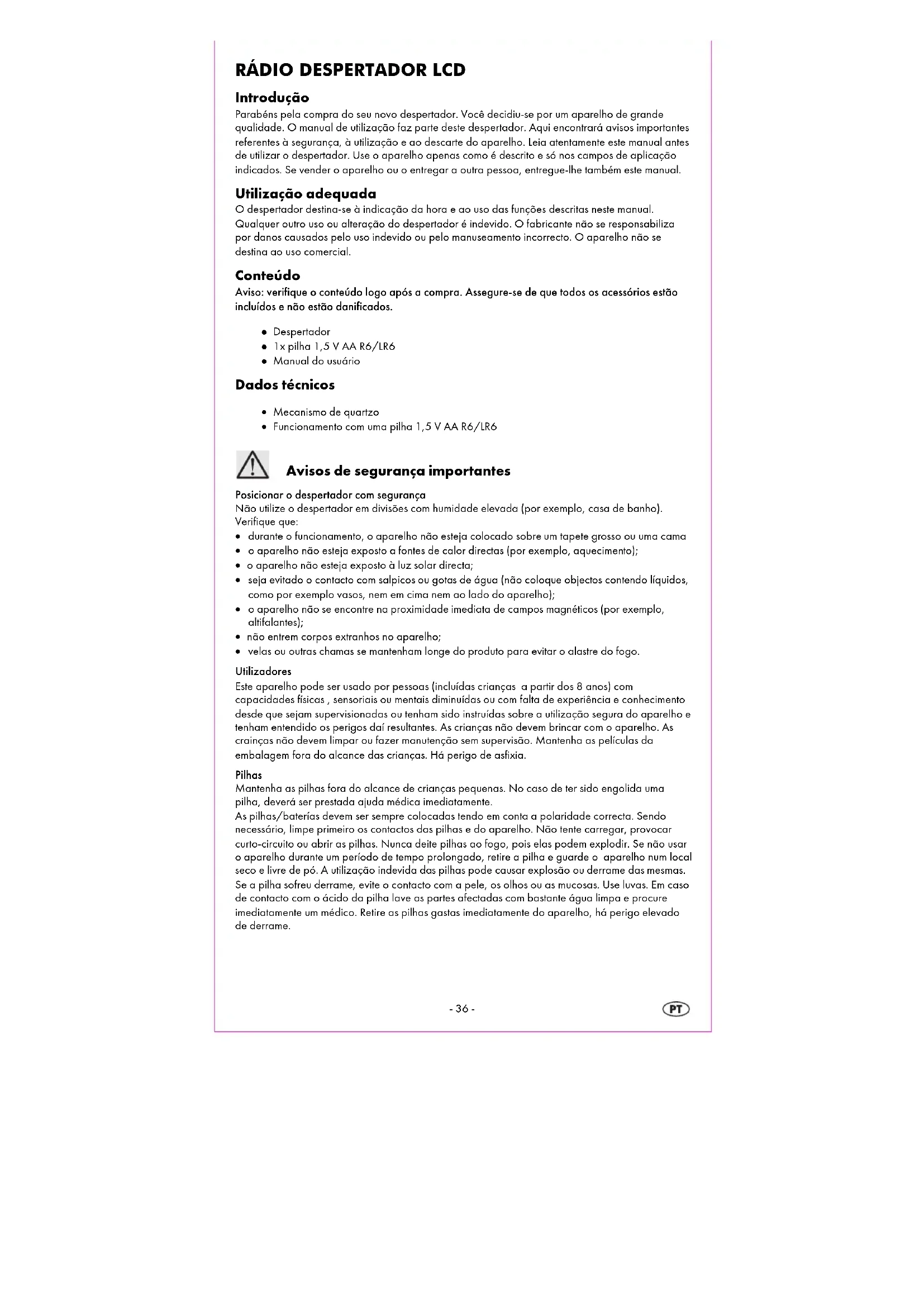 - Funcionamento com uma pilha 1,5 V AA R6/LR6 Posicionar o despertador com segurança Não utilize o despertador em divisões com humidade elevada (por exemplo, casa de banho). Verifique que: