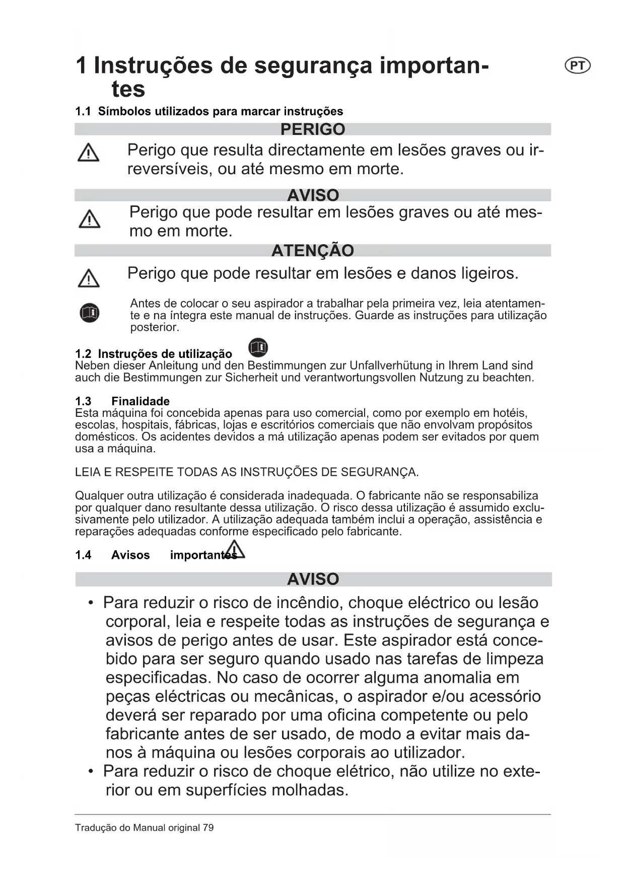 Esta máquina foi concebida apenas para uso comercial, como por exemplo em hotéis, escolas, hospitais, fábricas, lojas e escritórios comerciais que não envolvam propósitos domésticos. Os acidentes devidos a má utilização apenas podem ser evitados por quem usa a máquina. LEIA E RESPEITE TODAS AS INSTRUÇÕES DE SEGURANÇA. Qualquer outra utilização é considerada inadequada. O fabricante não se responsabiliza por qualquer dano resultante dessa utilização. O risco dessa utilização é assumido exclu- sivamente pelo utilizador. A utilização adequada também inclui a operação, assistência e reparações adequadas conforme especificado pelo fabricante.