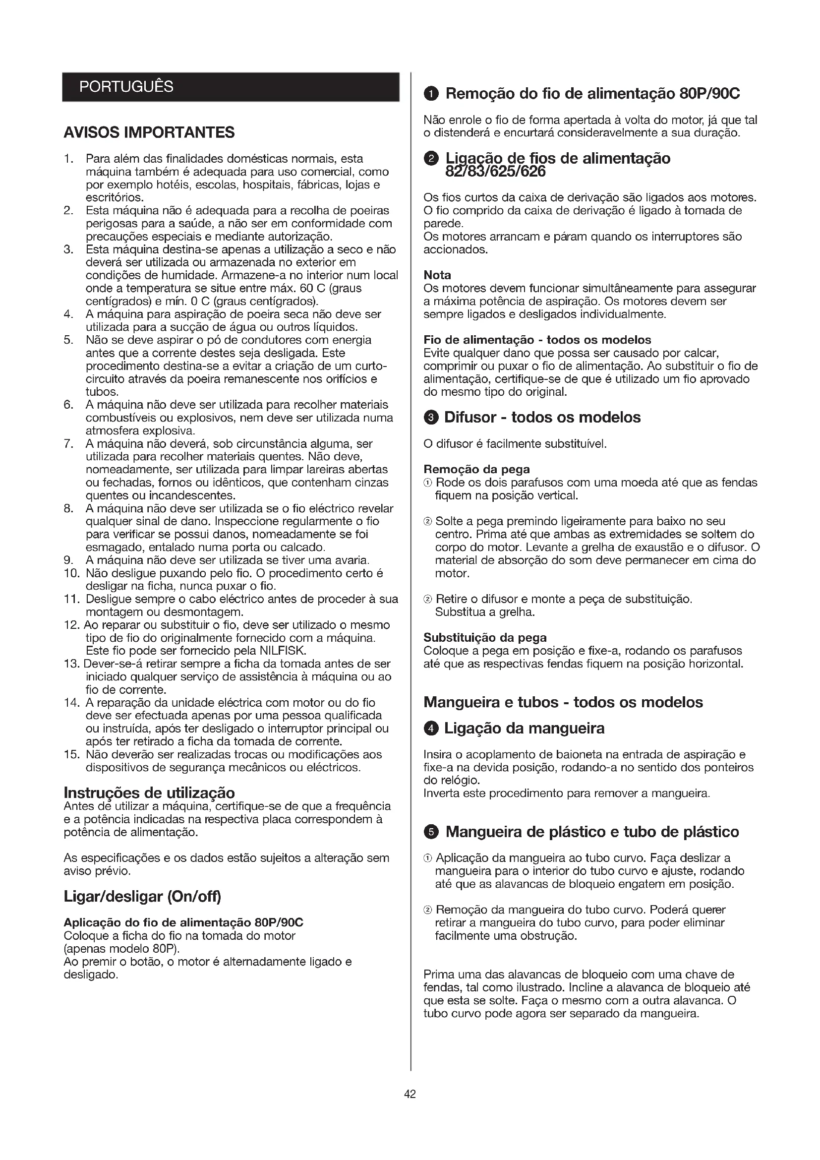 dispositivos de segurança mecânicos ou eléctricos. Instruções de utilização Antes de utilizar a máquina, certifique-se de que a frequência e a potência indicadas na respectiva placa correspondem à potência de alimentação. As especificações e os dados estão sujeitos a alteração sem aviso prévio. Ligar/desligar (On/off) Aplicação do fio de alimentação 80P/90C Coloque a ficha do fio na tomada do motor (apenas modelo 80P). Ao premir o botão, o motor é alternadamente ligado e desligado. Q Remoção do fio de alimentação 80P/90C Não enrole o fio de forma apertada à volta do motor, já que tal o distenderá e encurtará consideravelmente a sua duração. W Ligação de fios de alimentação 82/83/625/626 Os fios curtos da caixa de derivação são ligados aos motores. O fio comprido da caixa de derivação é ligado à tomada de parede. Os motores arrancam e páram quando os interruptores são accionados. Nota Os motores devem funcionar simultâneamente para assegurar a máxima potência de aspiração. Os motores devem ser sempre ligados e desligados individualmente. Fio de alimentação - todos os modelos Evite qualquer dano que possa ser causado por calcar, comprimir ou puxar o fio de alimentação. Ao substituir o fio de alimentação, certifique-se de que é utilizado um fio aprovado do mesmo tipo do original. E Difusor - todos os modelos O difusor é facilmente substituível. Remoção da pega ! Rode os dois parafusos com uma moeda até que as fendas fiquem na posição vertical. @ Solte a pega premindo ligeiramente para baixo no seu centro. Prima até que ambas as extremidades se soltem do corpo do motor. Levante a grelha de exaustão e o difusor. O material de absorção do som deve permanecer em cima do motor. @ Retire o difusor e monte a peça de substituição. Substitua a grelha. Substituição da pega Coloque a pega em posição e fixe-a, rodando os parafusos até que as respectivas fendas fiquem na posição horizontal. Mangueira e tubos - todos os modelos R Ligação da mangueira Insira o acoplamento de baioneta na entrada de aspiração e fixe-a na devida posição, rodando-a no sentido dos ponteiros do relógio. Inverta este procedimento para remover a mangueira. T Mangueira de plástico e tubo de plástico ! Aplicação da mangueira ao tubo curvo. Faça deslizar a mangueira para o interior do tubo curvo e ajuste, rodando até que as alavancas de bloqueio engatem em posição. @ Remoção da mangueira do tubo curvo. Poderá querer retirar a mangueira do tubo curvo, para poder eliminar facilmente uma obstrução. Prima uma das alavancas de bloqueio com uma chave de fendas, tal como ilustrado. Incline a alavanca de bloqueio até que esta se solte. Faça o mesmo com a outra alavanca. O tubo curvo pode agora ser separado da mangueira.43 Y Regulação da potência de aspiração no tubo plástico curvo ! A potência de aspiração do bocal pode ser regulada pela válvula corrediça no tubo curvo. A aspiração é mais potente, quando se faz deslizar a válvula para a frente, para fechar a entrada. @ Para a limpeza de, por exemplo, tampas soltas e cortinas, a potência de aspiração pode ser reduzida, fazendo deslizar a válvula para trás. U Mangueira de borracha ou de plástico com tubo curvo em aço Se a mangueira ou o tubo curvo estiverem obstruídos, o tubo curvo pode ser retirado da mangueira de modo a eliminar a obstrução. Desmontagem Mantenha o anel o mais perto possível do tubo curvo e passe-o pela vara, puxando e rodando simultâneamente. Montagem O acoplamento de borracha torna a tarefa mais fácil e prolonga a duração da mangueira. (Se o acoplamento se tornar apertado, deve ser retirado e polvilhado com pó de talco no interior). ! Coloque o acoplamento de borracha numa superfície plana e faça passar um anel pelo rebordo, até encaixar na ranhura da luva de engate de borracha. @ Faça passar o tubo curvo através da junção e puxe-o até onde este possa ir. # Aperte o tubo curvo com a mão esquerda contra a luva de engate de borracha e empurre o encaixe da junta de rótula o mais possível para dentro. $ Rode ou empurre o segundo anel para a devida posição na ranhura do acoplamento de borracha. % Puxe nos sentidos indicados pelas setas e a mangueira fica montada. I Montagem dos tubos 82/83/625/626 de Ø50mm ! Antes de os tubos e o bocal serem montados, desaperta-se o anel de bloqueio no sentido contrário ao dos ponteiros do relógio. @ Depois, o tubo e o bocal são montados e aperta-se o anel de bloqueio no sentido dos ponteiros do relógio até engatar. Acessórios A NILFISK fornece uma ampla variedade de tubos e bocais para uma limpeza normal, limpeza geral, e para as tarefas de limpeza específicas. Consulte os folhetos especiais para conhecer os acessórios. O Sacudir o filtro - apenas modelo 80P O aspirador também pode ser utilizado sem o saco do pó. Neste caso, a poeira é recolhida na parte inferior do recipiente, o qual é esvaziado conforme fôr necessário. Para manter a potência de aspiração a um nível constante, o filtro deve ser mantido tão limpo quanto possível, sendo sacudido em intervalos regulares ou aspirado. O filtro não deve ser lavado ou escovado. Remoção e substituição do motor no modelo 80P ! Segure a pega do motor e abra os fechos de cima. Levante o motor. @ Retire o filtro pela placa inferior azul e sacuda-o ligeiramente num movimento oscilante. A mangueira deve permanecer fixa ao recipiente durante este procedimento. Ao montar o motor, certifique-se de que o interruptor se encontra posicionado sobre a entrada de aspiração do recipiente e que a ficha está posicionada para trás. Remoção e substituição do motor no modelo 90C ! Retire o motor, rodando a respectiva pega no sentido contrário ao dos ponteiros do relógio. Levante o motor. O filtro pode ser limpo, aspirando-o. @ Substitua o motor, de forma a que o interruptor de ligar/desligar (on/off) se encontre alinhado com o interruptor 
