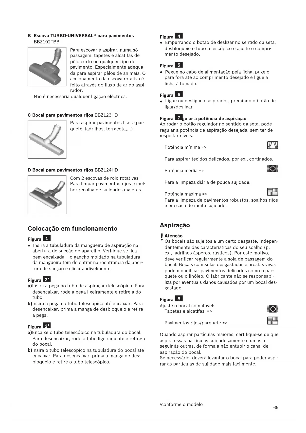 ão é necessária qualquer ligação eléctrica. C Bocal para pavimentos rijos BBZ123HD Para aspirar pavimentos lisos (par- quete, ladrilhos, terracota,...) D Bocal para pavimentos rijos BBZ124HD Com 2 escovas de rolo rotativas Para limpar pavimentos rijos e mel- hor recolha de sujidades maiores Colocação em funcionamento Figura ● Insira a tubuladura da mangueira de aspiração na abertura de sucção do aparelho. Verifique se fica bem encaixada – o gancho moldado na tubuladura da mangueira tem de entrar na reentrância da aber- tura de sucção e clicar audivelmente. Figura a)Insira a pega no tubo de aspiração/telescópico. Para desencaixar, rode a pega ligeiramente e retire-a do tubo. b)Insira a pega no tubo telescópico até encaixar. Para desencaixar, prima a manga de desbloqueio e retire a pega. Figura a)Encaixe o tubo telescópico na tubuladura do bocal. Para desencaixar, rode o tubo ligeiramente e retire-o do bocal. b)Insira o tubo telescópico na tubuladura do bocal até encaixar. Para desencaixar, prima a manga de des- bloqueio e retire o tubo telescópico.