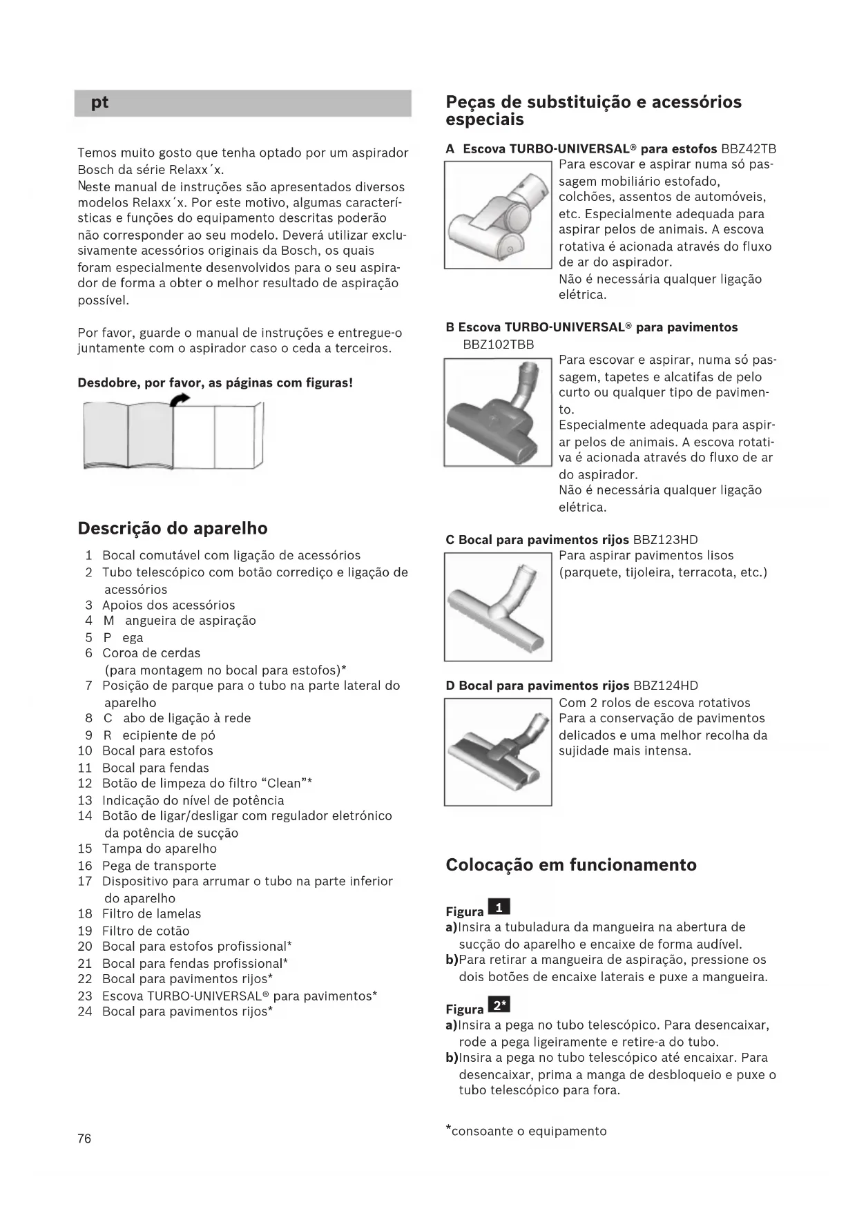 ara escovar e aspirar, numa só pas- sagem, tapetes e alcatifas de pelo curto ou qualquer tipo de pavimen- to. Especialmente adequada para aspir- ar pelos de animais. A escova rotati- va é acionada através do fluxo de ar do aspirador. Não é necessária qualquer ligação elétrica. C Bocal para pavimentos rijos BBZ123HD Para aspirar pavimentos lisos (parquete, tijoleira, terracota, etc.) D Bocal para pavimentos rijos BBZ124HD Com 2 rolos de escova rotativos Para a conservação de pavimentos delicados e uma melhor recolha da sujidade mais intensa. Colocação em funcionamento Figura a)Insira a tubuladura da mangueira na abertura de sucção do aparelho e encaixe de forma audível. b)Para retirar a mangueira de aspiração, pressione os dois botões de encaixe laterais e puxe a mangueira. Figura a)Insira a pega no tubo telescópico. Para desencaixar, rode a pega ligeiramente e retire-a do tubo. b)Insira a pega no tubo telescópico até encaixar. Para desencaixar, prima a manga de desbloqueio e puxe o tubo telescópico para fora.