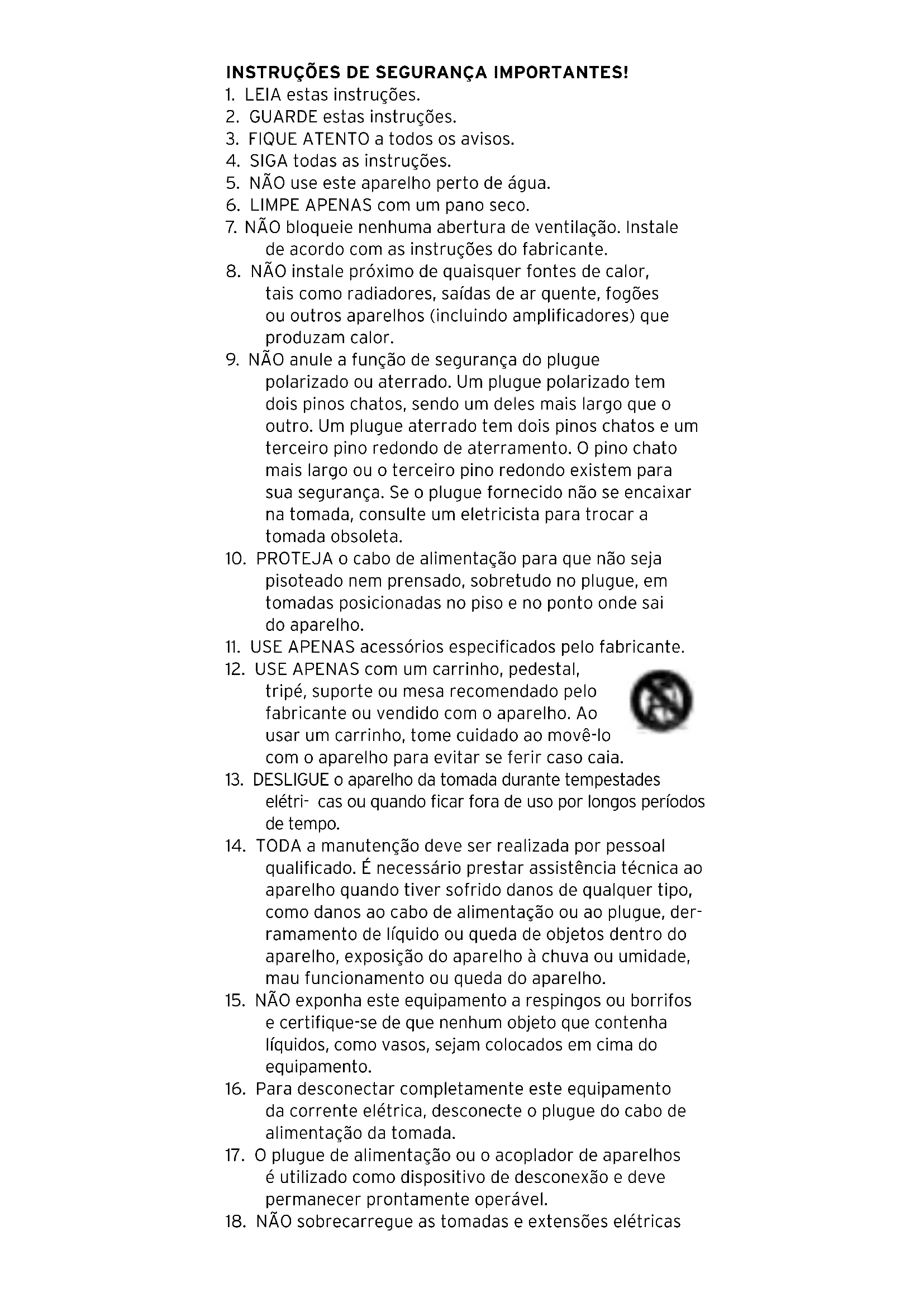 qualificado. É necessário prestar assistência técnica ao aparelho quando tiver sofrido danos de qualquer tipo, como danos ao cabo de alimentação ou ao plugue, der- ramamento de líquido ou queda de objetos dentro do aparelho, exposição do aparelho à chuva ou umidade, mau funcionamento ou queda do aparelho.