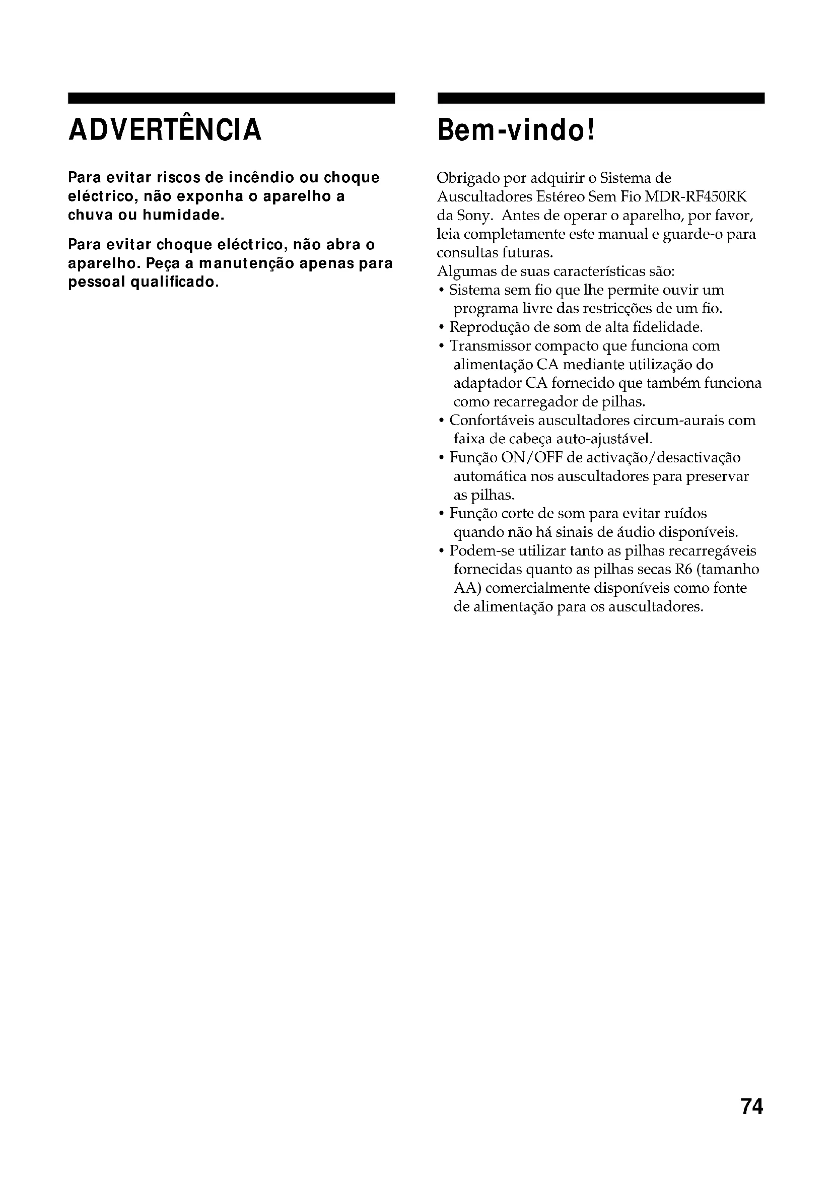 - Inserire le pile ricaricabili NC-AA-HJ. Alzare moderatamente il volume e quindi sintonizzare la frequenza. Problema Non è possibile caricare le pile. La sintonia non è possibile.74 ADVERTÊNCIA Para evitar riscos de incêndio ou choque eléctrico, não exponha o aparelho a chuva ou humidade. Para evitar choque eléctrico, não abra o aparelho. Peça a manutenção apenas para pessoal qualificado. Bem-vindo! Obrigado por adquirir o Sistema de Auscultadores Estéreo Sem Fio MDR-RF450RK da Sony. Antes de operar o aparelho, por favor, leia completamente este manual e guarde-o para consultas futuras. Algumas de suas características são: