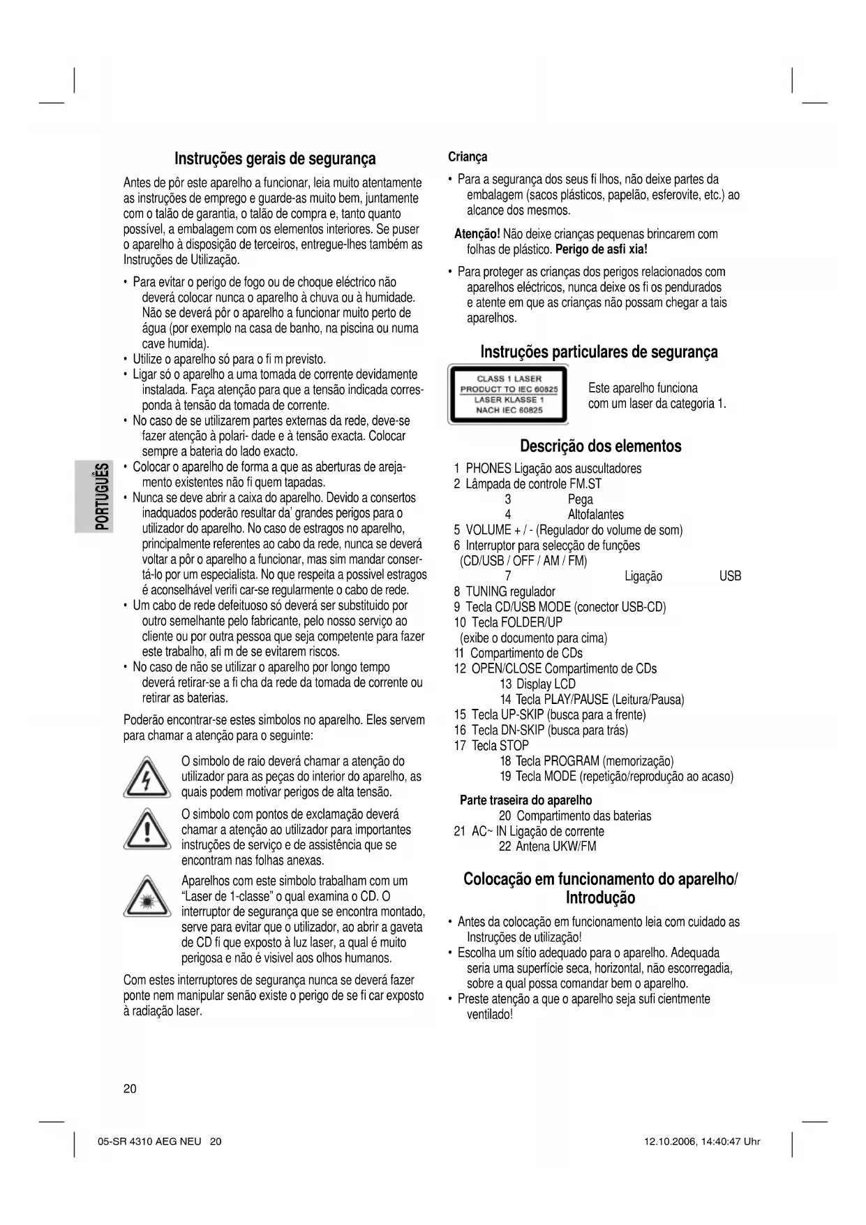 - Para proteger as crianças dos perigos relacionados com aparelhos eléctricos, nunca deixe os fi os pendurados e atente em que as crianças não possam chegar a tais aparelhos. Instruções particulares de segurança Este aparelho funciona com um laser da categoria 1. Descrição dos elementos 1 PHONES Ligação aos auscultadores 2 Lâmpada de controle FM.ST 3 Pega 4 Altofalantes 5 VOLUME + / - (Regulador do volume de som) 6 Interruptor para selecção de funções (CD/USB / OFF / AM / FM) 7 Ligação USB 8 TUNING regulador 9 Tecla CD/USB MODE (conector USB-CD) 10 Tecla FOLDER/UP (exibe o documento para cima) 11 Compartimento de CDs 12 OPEN/CLOSE Compartimento de CDs 13 Display LCD 14 Tecla PLAY/PAUSE (Leitura/Pausa) 15 Tecla UP-SKIP (busca para a frente) 16 Tecla DN-SKIP (busca para trás) 17 Tecla STOP 18 Tecla PROGRAM (memorização) 19 Tecla MODE (repetição/reprodução ao acaso) Parte traseira do aparelho 20 Compartimento das baterias 21 AC~ IN Ligação de corrente 22 Antena UKW/FM Colocação em funcionamento do aparelho/ Introdução