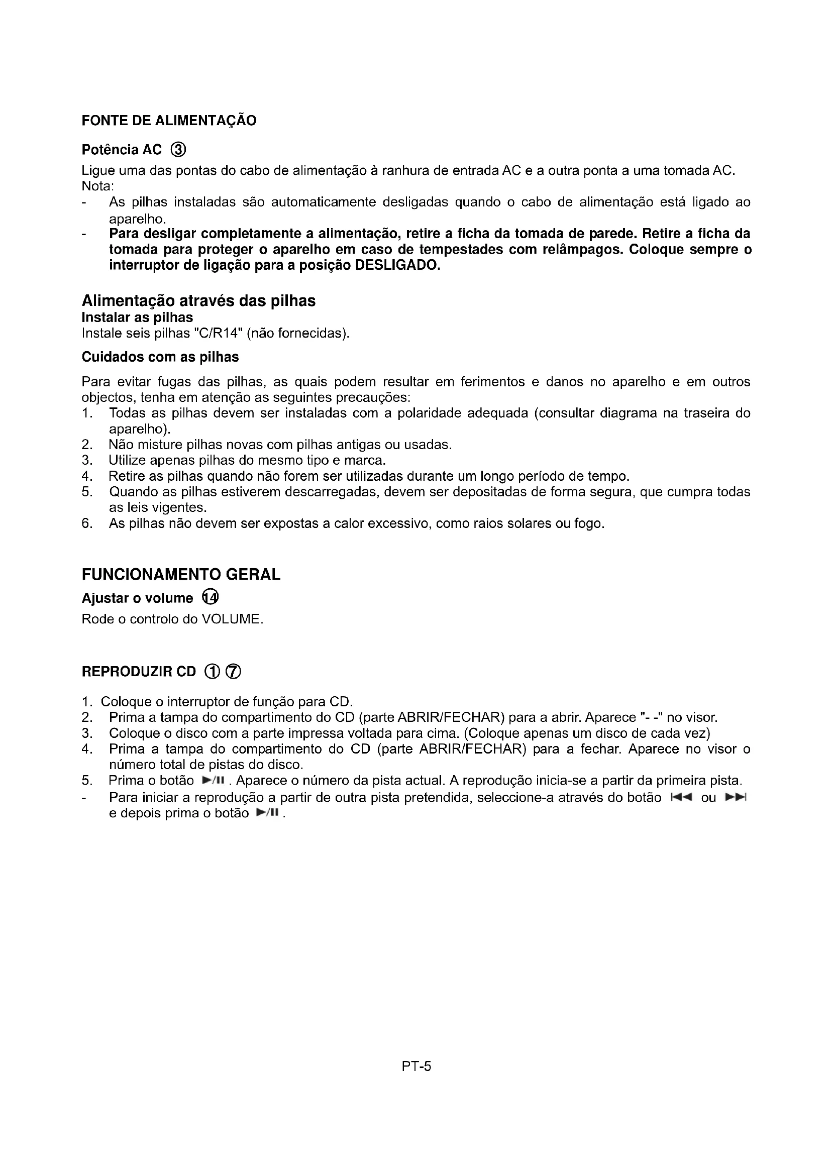 As pilhas devem ser introduzidas de acordo com as polaridades apresentadas. Assegure-se de que os terminais (+) e (-) são colocados na direcção correcta. Nunca utilize pilhas que apresentem sinais de estarem a verter ou fendas. Nunca deposite pilhas usadas numa fogueira. Mantenha as pilhas fora do alcance das crianças. Nunca recarregue pilhas descartáveis. Nunca provoque curto-circuitos nos terminais das pilhas. Retire sempre as pilhas usadas do interior do aparelho. Não tente abrir as pilhas. Não misture tipos diferentes de pilhas, nem pilhas novas e usadas. Utilize apenas pilhas do tipo recomendado ou equivalente. Retire as pilhas do aparelho antes de o depositar no final do seu tempo de vida útil.