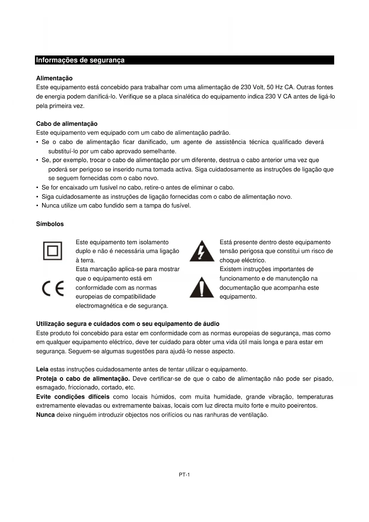 Existem instruções importantes de funcionamento e de manutenção na documentação que acompanha este equipamento. Utilização segura e cuidados com o seu equipamento de áudio Este produto foi concebido para estar em conformidade com as normas europeias de segurança, mas como em qualquer equipamento eléctrico, deve ter cuidado para obter uma vida útil mais longa e para estar em segurança. Seguem-se algumas sugestões para ajudá-lo nesse aspecto. Leia estas instruções cuidadosamente antes de tentar utilizar o equipamento. Proteja o cabo de alimentação. Deve certificar-se de que o cabo de alimentação não pode ser pisado, esmagado, friccionado, cortado, etc. Evite condições difíceis como locais húmidos, com muita humidade, grande vibração, temperaturas extremamente elevadas ou extremamente baixas, locais com luz directa muito forte e muito poeirentos. Nunca deixe ninguém introduzir objectos nos orifícios ou nas ranhuras de ventilação.PT-2 Informações de segurança Para poupar energia, desligue a alimentação ou retire o cabo de alimentação quando não estiver a utilizar o equipamento, a não ser que a função do equipamento exija uma alimentação contínua. Não continue a utilizar este equipamento se tiver derramado líquidos nele, se estiver danificado de qualquer forma ou se não funcionar normalmente. Desligue imediatamente o equipamento e obtenha aconselhamento especializado. Retire o cabo de alimentação da tomada durante trovoadas. Este produto está concebido apenas para utilização doméstica. Qualquer outra utilização pode invalidar a garantia e ser perigosa. Ventilação Coloque o equipamento numa superfície plana e sólida longe da luz directa e de fontes de calor. Se estiver num armário, deixe pelo menos 10 cm à volta. Não obstrua as ranhuras de ventilação, incluindo os que se encontram na zona inferior, com mobílias moles. Sobreaquecimento diminuirá a vida útil do equipamento e aumentará o risco de incêndio. Limpeza Desligue a alimentação e utilize apenas um pano macio ligeiramente húmido. Não utilize solventes químicos ou detergentes agressivos uma vez que podem danificar o acabamento estético. Pilhas Retire as pilhas quando o equipamento não for utilizado durante muito tempo. Se deixar pilhas no equipamento pode causar danos através de deterioração e fugas corrosivas, invalidando a garantia. Para proteger o ambiente, utilize as instalações de reciclagem locais para eliminar pilhas. Eliminação Os resíduos de produtos eléctricos e electrónicos não devem ser eliminados com os resíduos domésticos. Consulte o revendedor a quem comprou este equipamento para instruções de eliminação. As baterias e os materiais da embalagem podem ser reciclados utilizando as suas instalações de recolha locais. Avisos de Segurança Importantes Para evitar choque eléctrico, não retire nenhuma tampa. Se algo correr mal, não tente repará-lo sozinho, peça a um agente de assistência técnica para fazê-lo. Não exponha este equipamento a gotejamento ou salpicos nem coloque objectos com líquidos, como jarras, em cima do equipamento. Nunca coloque uma fonte de chama a descoberto em cima ou próxima do equipamento. Peças pequenas. Não deixe crianças pequenas brincarem com o equipamento. Nunca utilize o equipamento e tente ver vídeos enquanto conduz um veículo.