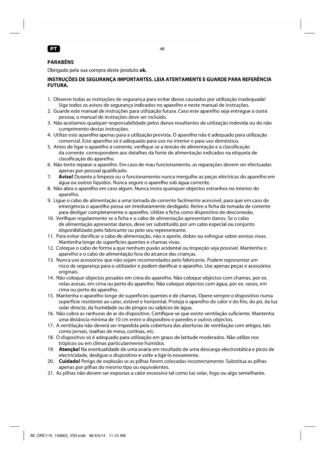 ELIMINAÇÃO O logótipo do caixote do lixo com uma cruz indica a necessidade da recolha em separado do equipamento eléctrico e electrónico (WEEE). Os equipamentos eléctricos e electrónicos podem conter substâncias perigosas e prejudiciais. Não elimine este aparelho como lixo urbano indiferenciado. Entregue-o num ponto de recolha designado para a reciclagem de WEEE. Ao fazer isso, vai ajudar a conservar os recursos naturais e a proteger a natureza. Contacte o seu vendedor ou as autoridades locais para obter mais informações. IM_ORC110_140605_V03.indb 52 6/5/14 11:15 AM53