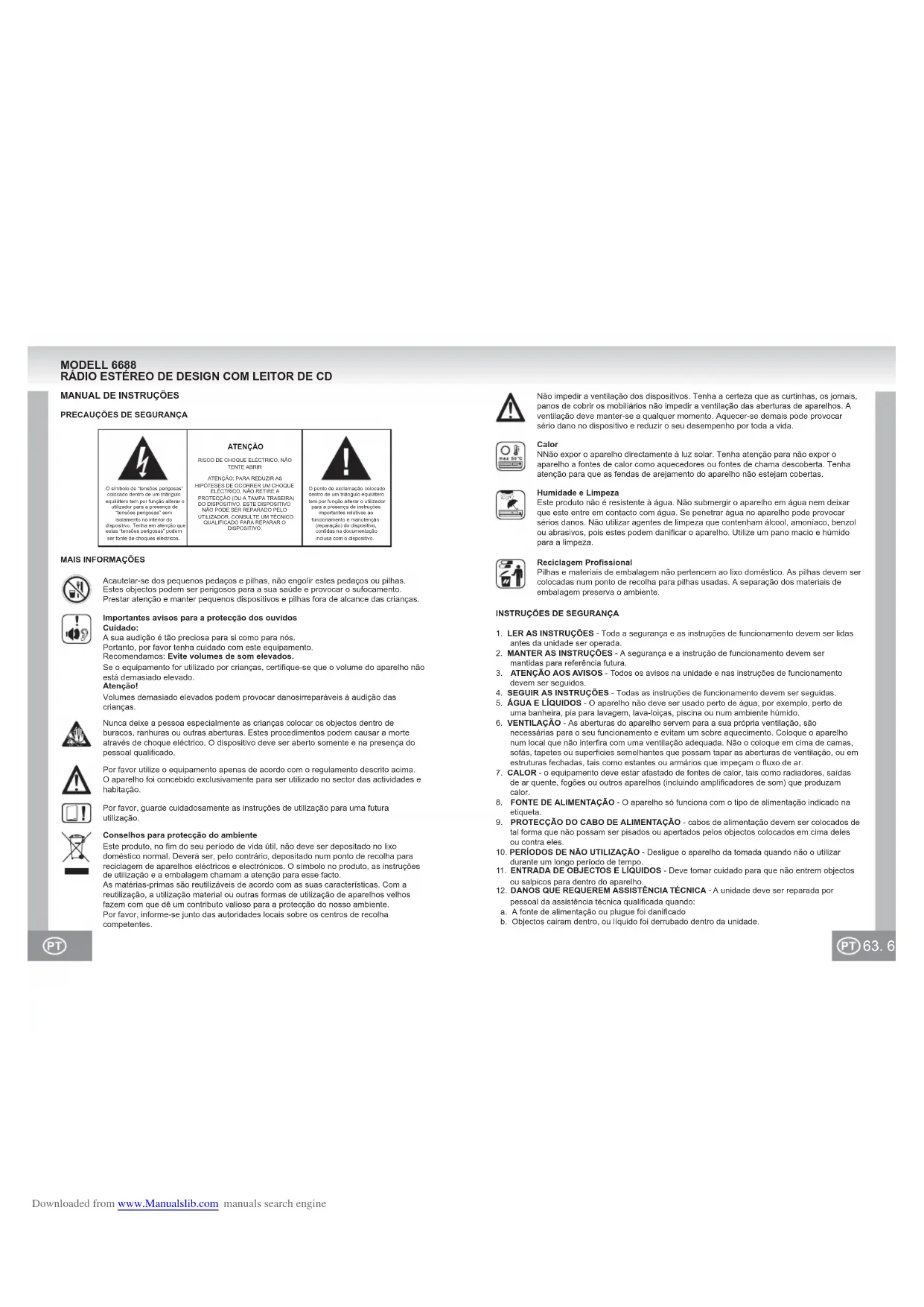 El CD salta Pantalla El CD está sucio o averiado. No se ha insertado ningún CD. El CD está sucio o averiado. Condensación en el lente del láser. CD-R / RW está vacío o no se finalizó. Limpie o reemplace el disco. Inserte un CD, CD-R o CD-RW. Limpie o reemplace el CD. Espere hasta que la lente del láser esté completamente seca (aproximadamente 1 hora). Finalice el CD-R / RW. Downloaded from www.Manualslib.com manuals search engine63. 62. O símbolo de “tensões perigosas” colocado dentro de um triângulo equilátero tem por função alterar o utilizador para a presença de “tensões perigosas” sem isolamento no interior do dispositivo. Tenha em atenção que estas “tensões perigosas” podem ser fonte de choques eléctricos.O ponto de exclamação colocado dentro de um triângulo equilátero tem por função alterar o utilizador para a presença de instruções importantes relativas ao funcionamento e manutenção (reparação) do dispositivo, contidas na documentação inclusa com o dispositivo.ATENÇÃORISCO DE CHOQUE ELÉCTRICO, NÃO TENTE ABRIRATENÇÃO: PARA REDUZIR AS HIPÓTESES DE OCORRER UM CHOQUE ELÉCTRICO, NÃO RETIRE A PROTECÇÃO (OU A TAMPA TRASEIRA) DO DISPOSITIVO. ESTE DISPOSITIVO NÃO PODE SER REPARADO PELO UTILIZADOR. CONSULTE UM TÉCNICO QUALIFICADO PARA REPARAR O DISPOSITIVO. MODELL 6688 RÁDIO ESTÉREO DE DESIGN COM LEITOR DE CD Por favor utilize o equipamento apenas de acordo com o regulamento descrito acima.O aparelho foi concebido exclusivamente para ser utilizado no sector das actividades e habitação.Por favor, guarde cuidadosamente as instruções de utilização para uma futurautilização.Conselhos para protecção do ambienteEste produto, no fim do seu período de vida útil, não deve ser depositado no lixo doméstico normal. Deverá ser, pelo contrário, depositado num ponto de recolha para reciclagem de aparelhos eléctricos e electrónicos. O símbolo no produto, as instruções de utilização e a embalagem chamam a atenção para esse facto.As matérias-primas são reutilizáveis de acordo com as suas características. Com a reutilização, a utilização material ou outras formas de utilização de aparelhos velhos fazem com que dê um contributo valioso para a protecção do nosso ambiente.Por favor, informe-se junto das autoridades locais sobre os centros de recolha competentes.Nunca deixe a pessoa especialmente as crianças colocar os objectos dentro de buracos, ranhuras ou outras aberturas. Estes procedimentos podem causar a morte através de choque eléctrico. O dispositivo deve ser aberto somente e na presença do pessoal qualificado.Acautelar-se dos pequenos pedaços e pilhas, não engolir estes pedaços ou pilhas. Estes objectos podem ser perigosos para a sua saúde e provocar o sufocamento. Prestar atenção e manter pequenos dispositivos e pilhas fora de alcance das crianças.Importantes avisos para a protecção dos ouvidosCuidado:A sua audição é tão preciosa para si como para nós.Portanto, por favor tenha cuidado com este equipamento.Recomendamos: Evite volumes de som elevados.Se o equipamento for utilizado por crianças, certifique-se que o volume do aparelho não está demasiado elevado.Atenção!Volumes demasiado elevados podem provocar danosirreparáveis à audição das crianças.MANUAL DE INSTRUÇÕESPRECAUÇÕES DE SEGURANÇAMAIS INFORMAÇÕESINSTRUÇÕES DE SEGURANÇA1. LER AS INSTRUÇÕES - Toda a segurança e as instruções de funcionamento devem ser lidas antes da unidade ser operada. 2. MANTER AS INSTRUÇÕES - A segurança e a instrução de funcionamento devem ser mantidas para referência futura.