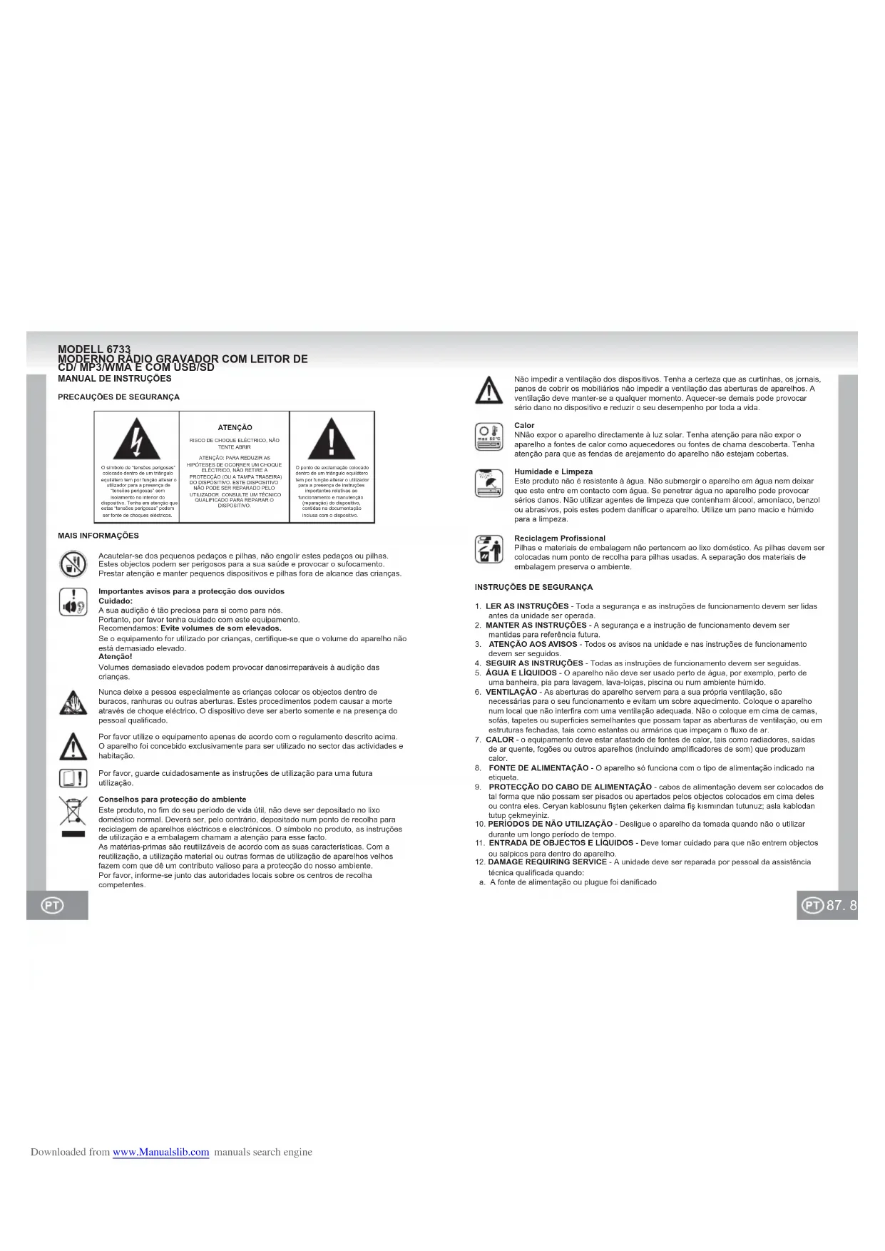 Sonido de baja calidad La grabadora no funciona CD/MP3 El CD salta de pista En la pantalla aparece: NO PROBLEMA SOLUCIÓN POSIBLE CAUSA El volumen está demasiado bajo. Hay unos auriculares conectados. Las pilas se han gastado. Las pilas están mal colocadas. El cable de alimentación no está conectado. La señal es débil. Hay interferencias de otros aparatos (equipos de TV, VCR, ordenadores, etc.). El cabezal, los rodillos o el cabrestante están sucios La pestaña de la cinta se ha roto. El CD / MP3 está roto o dañado. No ha insertado ningún CD. El CD está roto o dañado. Hay condensación en las lentes láser. El CD-R / RW está vacío o no ha finalizado. Ajuste el volumen. Desconecte los auriculares. Cambie las pilas. Preste atención a la polaridad. Conecte el cable de alimentación correctamente. Ajuste la antena: FM: antena telescópica. AM: ajuste la unidad. Mantenga la unidad alejada de otros aparatos. Limpie el cabezal, los rodillos y el cabrestante. Cúbrala con celo. Cambie o limpie el disco. Inserte un CD, CD-R o CD-RW. Cambie o limpie el CD. Espere a que la lente se seque por completo (1 hora aprox.). Finalice el CD-R / RW. ESPECIFICACIONES General Suministro de corriente: AC 230V ~ 50Hz DC 12V (6 pilas LR14 / UM-2 / C, 1.5V) (Pilas no incluidas) Rango de frecuencia: AM (MW) 525 - 1615 kHz. FM (UKW) 87.5 - 108MHz. Audio Impedancia del altavoz: 8 Ohm Dimensiones: 290 x 275 x 380 mm Peso: 2 kg Sujeto a cambios sin previo aviso. Downloaded from www.Manualslib.com manuals search engine87. 86. O símbolo de “tensões perigosas” colocado dentro de um triângulo equilátero tem por função alterar o utilizador para a presença de “tensões perigosas” sem isolamento no interior do dispositivo. Tenha em atenção que estas “tensões perigosas” podem ser fonte de choques eléctricos.O ponto de exclamação colocado dentro de um triângulo equilátero tem por função alterar o utilizador para a presença de instruções importantes relativas ao funcionamento e manutenção (reparação) do dispositivo, contidas na documentação inclusa com o dispositivo.ATENÇÃORISCO DE CHOQUE ELÉCTRICO, NÃO TENTE ABRIRATENÇÃO: PARA REDUZIR AS HIPÓTESES DE OCORRER UM CHOQUE ELÉCTRICO, NÃO RETIRE A PROTECÇÃO (OU A TAMPA TRASEIRA) DO DISPOSITIVO. ESTE DISPOSITIVO NÃO PODE SER REPARADO PELO UTILIZADOR. CONSULTE UM TÉCNICO QUALIFICADO PARA REPARAR O DISPOSITIVO. MODELL 6733 MODERNO RÁDIO GRAVADOR COM LEITOR DE CD/ MP3/WMA E COM USB/SD Por favor utilize o equipamento apenas de acordo com o regulamento descrito acima.O aparelho foi concebido exclusivamente para ser utilizado no sector das actividades e habitação.Por favor, guarde cuidadosamente as instruções de utilização para uma futurautilização.Conselhos para protecção do ambienteEste produto, no fim do seu período de vida útil, não deve ser depositado no lixo doméstico normal. Deverá ser, pelo contrário, depositado num ponto de recolha para reciclagem de aparelhos eléctricos e electrónicos. O símbolo no produto, as instruções de utilização e a embalagem chamam a atenção para esse facto.As matérias-primas são reutilizáveis de acordo com as suas características. Com a reutilização, a utilização material ou outras formas de utilização de aparelhos velhos fazem com que dê um contributo valioso para a protecção do nosso ambiente.Por favor, informe-se junto das autoridades locais sobre os centros de recolha competentes.Nunca deixe a pessoa especialmente as crianças colocar os objectos dentro de buracos, ranhuras ou outras aberturas. Estes procedimentos podem causar a morte através de choque eléctrico. O dispositivo deve ser aberto somente e na presença do pessoal qualificado.Acautelar-se dos pequenos pedaços e pilhas, não engolir estes pedaços ou pilhas. Estes objectos podem ser perigosos para a sua saúde e provocar o sufocamento. Prestar atenção e manter pequenos dispositivos e pilhas fora de alcance das crianças.Importantes avisos para a protecção dos ouvidosCuidado:A sua audição é tão preciosa para si como para nós.Portanto, por favor tenha cuidado com este equipamento.Recomendamos: Evite volumes de som elevados.Se o equipamento for utilizado por crianças, certifique-se que o volume do aparelho não está demasiado elevado.Atenção!Volumes demasiado elevados podem provocar danosirreparáveis à audição das crianças.MANUAL DE INSTRUÇÕESPRECAUÇÕES DE SEGURANÇAMAIS INFORMAÇÕESINSTRUÇÕES DE SEGURANÇA1. LER AS INSTRUÇÕES - Toda a segurança e as instruções de funcionamento devem ser lidas antes da unidade ser operada. 2. MANTER AS INSTRUÇÕES - A segurança e a instrução de funcionamento devem ser mantidas para referência futura.