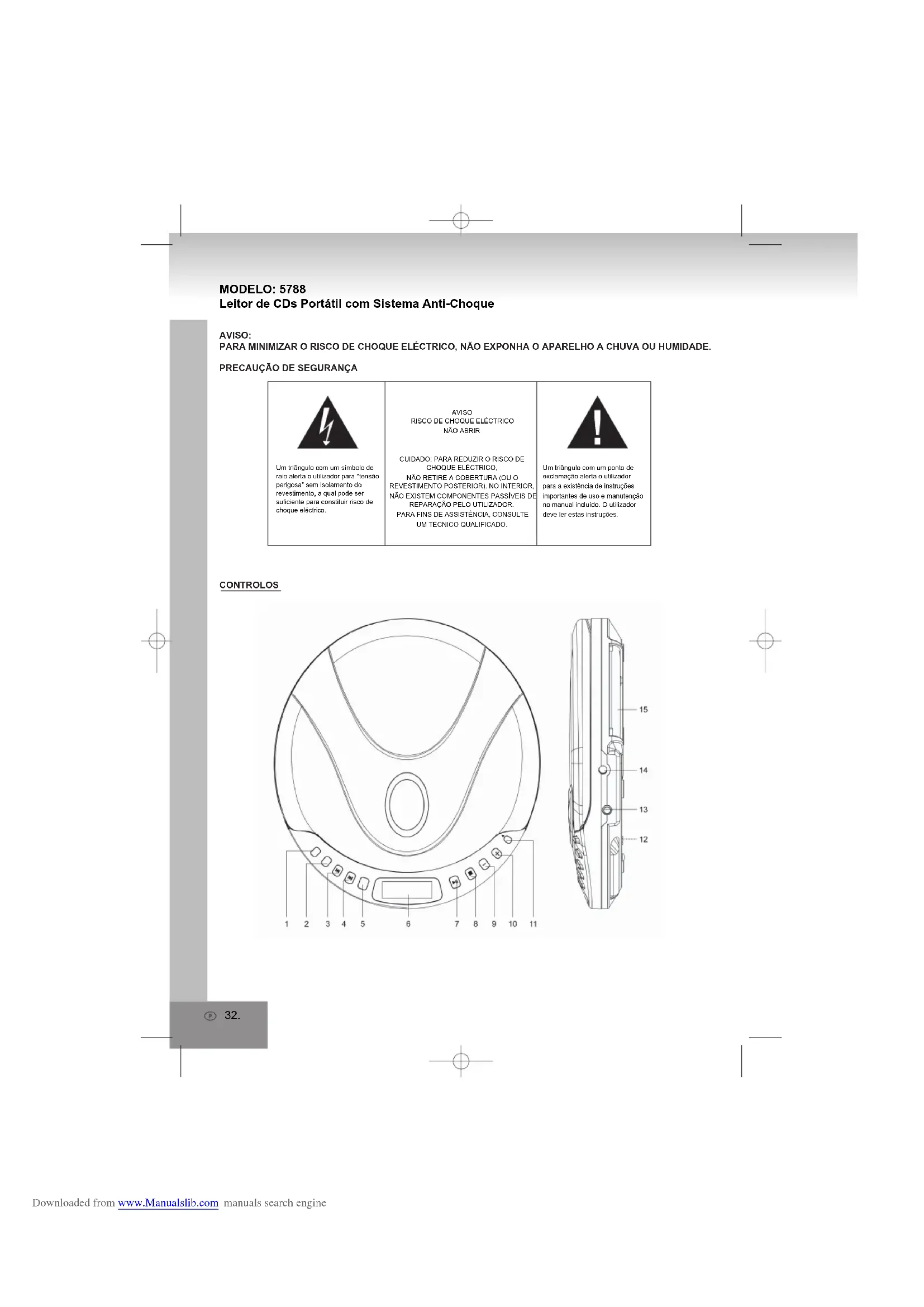A sua saúde é muito importante. Certifique-se de que regula o volume do aparelho de forma a que não possa provocar danos auditivos. Evite um volume demasiado elevado. Se o leitor de CDs for utilizado por crianças, certifique-se igualmente que o volume é adequado. Nunca introduza quaisquer objectos através das ranhuras deste leitor de CDs, na medida em que poderão tocar em pontos de tensão perigosa ou provocar curto-circuito em componentes, o que pode resultar em incêndio ou choque eléctrico. Nunca derrame líquidos de qualquer espécie sobre o produto. Utilize o aparelho apenas para o fim a que se destina. Antes de utilizar o leitor de CDs, leia todas as instruções de segurança e funcionamento. A reciclagem de materiais contribui para a conservação de recursos naturais. Este símbolo, presente no produto ou na respectiva embalagem, indica que o produto não deve ser processado como lixo doméstico. Deverá ser depositado no ponto de recolha de equipamento eléctrico e electrónico, para fins de reciclagem. A deposição adequada deste produto garante a ausência de consequências negativas para o ambiente e para a saúde, as quais poderão ocorrer caso este produto seja depositado em conjunto com o lixo comum. Certifique-se de que é recolhido separadamente para reciclagem adequada, em conformidade com as regulamentações locais. Calor Não exponha o leitor de CDs à luz solar directa ou a fontes de calor, tais como aquecedores ou fogueiras. Certifique-se de que as ranhuras de ventilação não ficam bloqueadas. Este leitor de CDs não é impermeável. Não o coloque em contacto com água. Limpe apenas com um pano ligeiramente humedecido. Não utilize agentes de limpeza que contenham álcool, amoníaco, benzeno ou abrasivos. Deposite as pilhas de forma não prejudicial para o ambiente As pilhas não são detritos domésticos. Por esse motivo, deverão ser depositadas nos pontos de recolha próprios para pilhas usadas. Nunca deite pilhas no fogo. Downloaded from www.Manualslib.com manuals search engine37. Trójkąt z symbolem pioruna to znak odnoszący się do “niebezpiecznego napięcia”, braku izolacji, co może przyczynić się do ryzyka porażenia prądem.OSTRZEZENIERYZYKO PORAŻENIA PRĄDEMNIE OTWIERAJTrójkąt z wykrzyknikiem to znak odnoszący się do ważnych instrukcji użytkowania oraz konserwacji. Znak pojawia się w podręczniku użytkownika. MODEL: 5788 Przenośny odtwarzacz CD z systemem antywstrząsowym KONTROLKI OSTRZEŻENIE: URZĄDZENIE PRZED DESZCZEM LUB WILGOCIĄ. ABY ZMINIMALIZOWAĆ RYZYKO PORAŻENIA PRĄDEM, CHROŃ