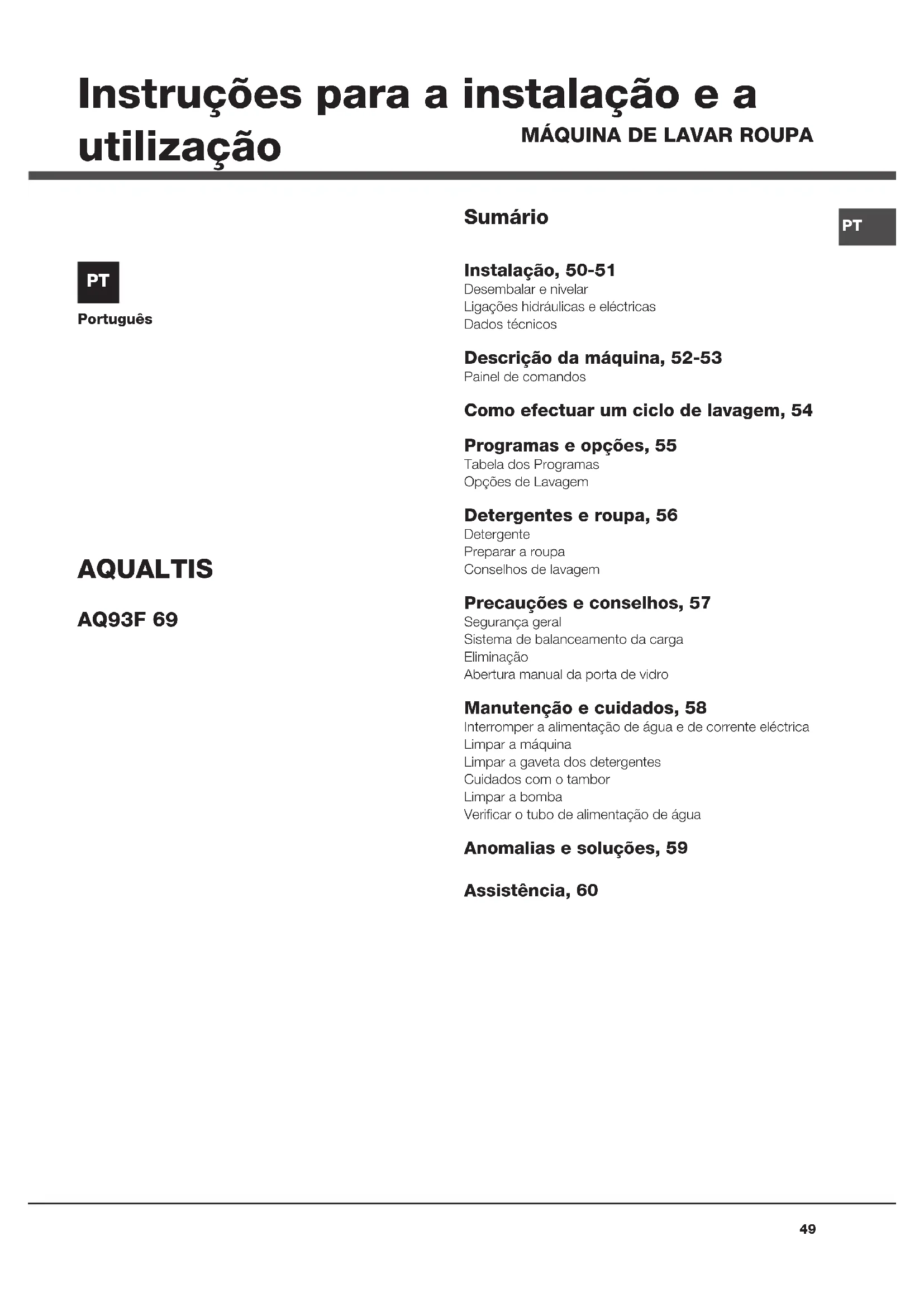 Português Sumário Instalação, 50-51 Desembalar e nivelarLigações hidráulicas e eléctricasDados técnicos Descrição da máquina, 52-53 Painel de comandos Como efectuar um ciclo de lavagem, 54 Programas e opções, 55 Tabela dos ProgramasOpções de Lavagem Detergentes e roupa, 56 DetergentePreparar a roupaConselhos de lavagem Precauções e conselhos, 57 Segurança geralSistema de balanceamento da cargaEliminaçãoAbertura manual da porta de vidro Manutenção e cuidados, 58 Interromper a alimentação de água e de corrente eléctricaLimpar a máquinaLimpar a gaveta dos detergentesCuidados com o tamborLimpar a bombaVerificar o tubo de alimentação de água Anomalias e soluções, 59 Assistência, 60