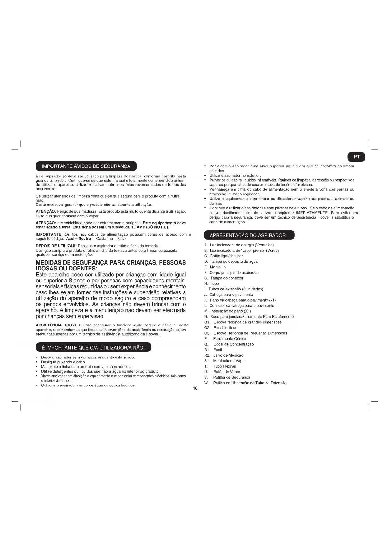 Este aspirador só deve ser utilizado para limpeza doméstica, conforme descrito neste guia do utilizador. Certique-se de que este manual é totalmente compreendido antes de utilizar o aparelho. Utilize exclusivamente acessórios recomendados ou fornecidos pela Hoover Se utilizar utensílios de limpeza certique-se que segura bem o produto com a outra mão. Deste modo, vai garantir que o produto não cai durante a utilização. ATeNÇÃo: Perigo de queimaduras. Este produto está muito quente durante a utilização. Evite qualquer contacto com o vapor. ATeNÇÃo: a electricidade pode ser extremamente perigosa. Este equipamento deve estar ligado à terra. Esta cha possui um fusível dE 13 AMP (Só NO RU). ImpoRTANTe: Os os nos cabos de alimentação possuem cores de acordo com o seguinte código: Azul – Neutro Castanho – Fase DepoIs De uTIlIZAR: Desligue o aspirador e retire a cha da tomada. Desligue sempre o produto e retire a cha da tomada antes de o limpar ou executar qualquer serviço de manutenção. meDIDAs De seGuRANÇA pARA CRIANÇAs, pessoAs IDosAs ou DoeNTes: Este aparelho pode ser utilizado por crianças com idade igual ou superior a 8 anos e por pessoas com capacidades mentais, sensoriais e físicas reduzidas ou sem experiência e conhecimento caso lhes sejam fornecidas instruções e supervisão relativas à utilização do aparelho de modo seguro e caso compreendam os perigos envolvidos. As crianças não devem brincar com o aparelho. A limpeza e a manutenção não devem ser efectuada por crianças sem supervisão. AssIsTÊNCIA HooVeR: Para assegurar o funcionamento seguro e eciente deste aparelho, recomendamos que todas as intervenções de assistência ou reparação sejam efectuadas apenas por um técnico de assistência autorizado da Hoover. É IMPORTANTE QUE O/A UTILIZADOR/A NÃO:
