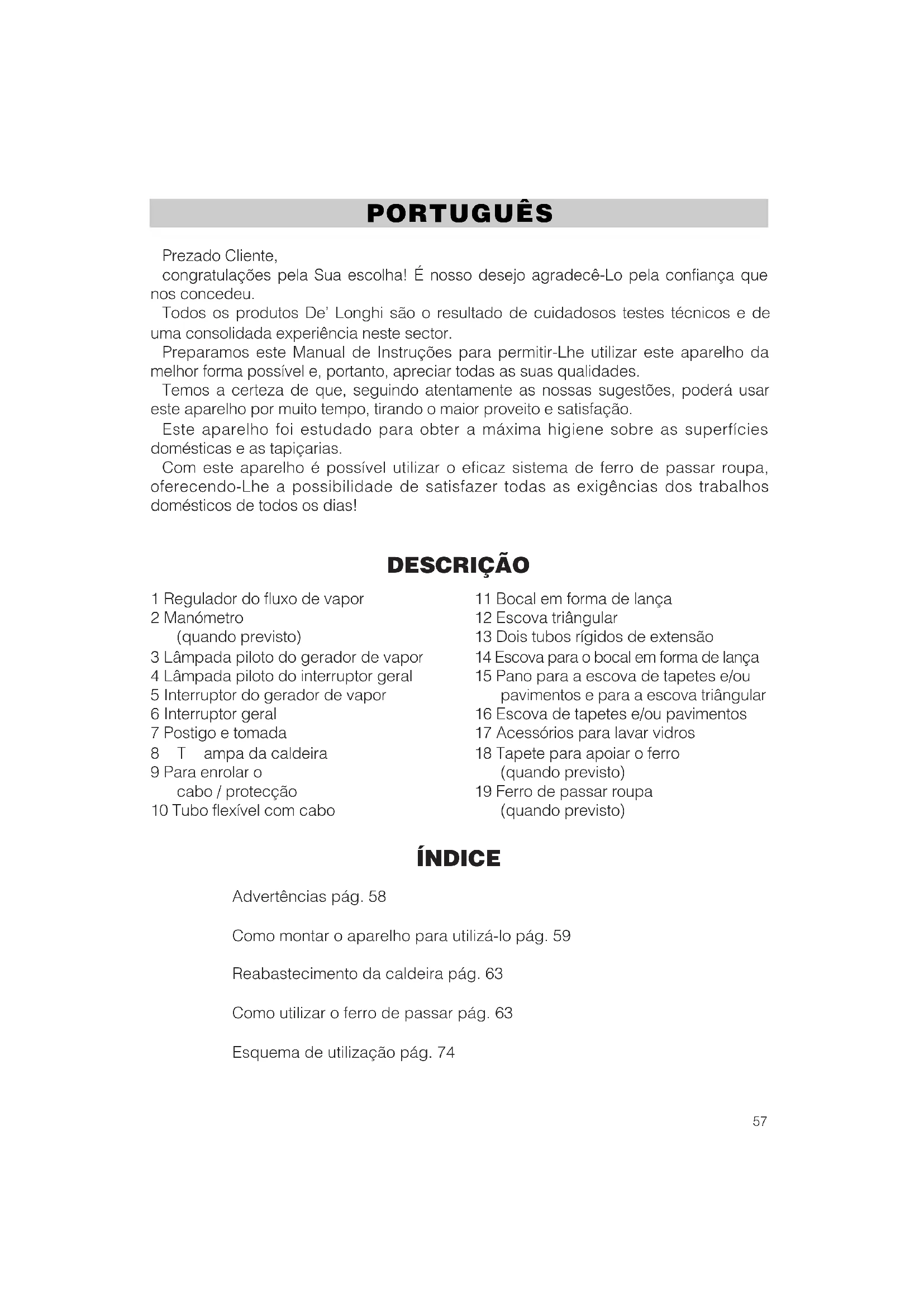 Prezado Cliente, congratulações pela Sua escolha! É nosso desejo agradecê-Lo pela confiança que nos concedeu. Todos os produtos De’ Longhi são o resultado de cuidadosos testes técnicos e de uma consolidada experiência neste sector. Preparamos este Manual de Instruções para permitir-Lhe utilizar este aparelho da melhor forma possível e, portanto, apreciar todas as suas qualidades. Temos a certeza de que, seguindo atentamente as nossas sugestões, poderá usar este aparelho por muito tempo, tirando o maior proveito e satisfação. Este aparelho foi estudado para obter a máxima higiene sobre as superfícies domésticas e as tapiçarias. Com este aparelho é possível utilizar o eficaz sistema de ferro de passar roupa, oferecendo-Lhe a possibilidade de satisfazer todas as exigências dos trabalhos domésticos de todos os dias! DESCRIÇÃO 1 Regulador do fluxo de vapor 2 Manómetro (quando previsto) 3 Lâmpada piloto do gerador de vapor 4 Lâmpada piloto do interruptor geral 5 Interruptor do gerador de vapor 6 Interruptor geral 7 Postigo e tomada 8Tampa da caldeira 9 Para enrolar o cabo / protecção 10 Tubo flexível com cabo ÍNDICE Advertências pág. 58 Como montar o aparelho para utilizá-lo pág. 59 Reabastecimento da caldeira pág. 63 Como utilizar o ferro de passar pág. 63 Esquema de utilização pág. 74 11 Bocal em forma de lança 12 Escova triângular 13 Dois tubos rígidos de extensão 14 Escova para o bocal em forma de lança 15 Pano para a escova de tapetes e/ou pavimentos e para a escova triângular 16 Escova de tapetes e/ou pavimentos 17 Acessórios para lavar vidros 18 Tapete para apoiar o ferro (quando previsto) 19 Ferro de passar roupa (quando previsto) PORTUGUÊS58 ADVERTÊNCIAS