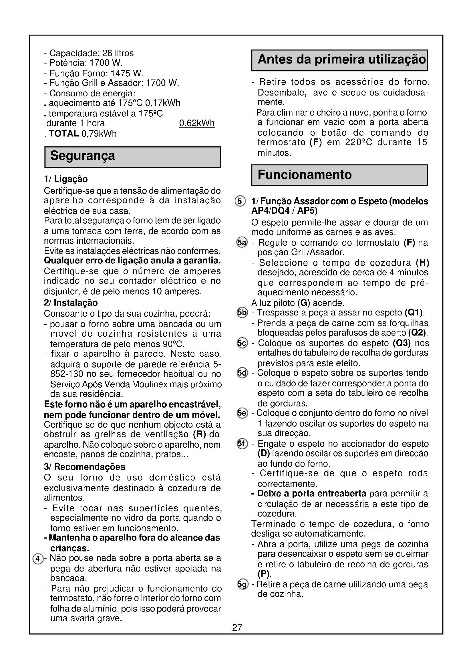 - Capacidade: 26 litros - Potência: 1700 W. - Função Forno: 1475 W. - Função Grill e Assador: 1700 W. - Consumo de energia: . aquecimento até 175ºC 0,17kWh . temperatura estável a 175ºC durante 1 hora 0,62kWh . TOTAL 0,79kWh Segurança 1/ Ligação Certifique-se que a tensão de alimentação do aparelho corresponde à da instalação eléctrica de sua casa. Para total segurança o forno tem de ser ligado a uma tomada com terra, de acordo com as normas internacionais. Evite as instalações eléctricas não conformes. Qualquer erro de ligação anula a garantia. Certifique-se que o número de amperes indicado no seu contador eléctrico e no disjuntor, é de pelo menos 10 amperes. 2/ Instalação Consoante o tipo da sua cozinha, poderá: - pousar o forno sobre uma bancada ou um móvel de cozinha resistentes a uma temperatura de pelo menos 90ºC. - fixar o aparelho à parede. Neste caso, adquira o suporte de parede referência 5- 852-130 no seu fornecedor habitual ou no Serviço Após Venda Moulinex mais próximo da sua residência. Este forno não é um aparelho encastrável, nem pode funcionar dentro de um móvel. Certifique-se de que nenhum objecto está a obstruir as grelhas de ventilação (R) do aparelho. Não coloque sobre o aparelho, nem encoste, panos de cozinha, pratos... 3/ Recomendações O seu forno de uso doméstico está exclusivamente destinado à cozedura de alimentos. - Evite tocar nas superfícies quentes, especialmente no vidro da porta quando o forno estiver em funcionamento. - Mantenha o aparelho fora do alcance das crianças. - Não pouse nada sobre a porta aberta se a pega de abertura não estiver apoiada na bancada. - Para não prejudicar o funcionamento do termostato, não forre o interior do forno com folha de alumínio, pois isso poderá provocar uma avaria grave. Antes da primeira utilização - Retire todos os acessórios do forno. Desembale, lave e seque-os cuidadosa- mente. - Para eliminar o cheiro a novo, ponha o forno a funcionar em vazio com a porta aberta colocando o botão de comando do termostato (F) em 220ºC durante 15 minutos. Funcionamento 1/ Função Assador com o Espeto (modelos AP4/DQ4 / AP5) O espeto permite-lhe assar e dourar de um modo uniforme as carnes e as aves. - Regule o comando do termostato (F) na posição Grill/Assador. - Seleccione o tempo de cozedura (H) desejado, acrescido de cerca de 4 minutos que correspondem ao tempo de pré- aquecimento necessário. A luz piloto (G) acende. - Trespasse a peça a assar no espeto (Q1). - Prenda a peça de carne com as forquilhas bloqueadas pelos parafusos de aperto (Q2). - Coloque os suportes do espeto (Q3) nos entalhes do tabuleiro de recolha de gorduras previstos para este efeito. - Coloque o espeto sobre os suportes tendo o cuidado de fazer corresponder a ponta do espeto com a seta do tabuleiro de recolha de gorduras. - Coloque o conjunto dentro do forno no nível 1 fazendo oscilar os suportes do espeto na sua direcção. - Engate o espeto no accionador do espeto (D) fazendo oscilar os suportes em direcção ao fundo do forno. - Certifique-se de que o espeto roda correctamente. - Deixe a porta entreaberta para permitir a circulação de ar necessária a este tipo de cozedura. Terminado o tempo de cozedura, o forno desliga-se automaticamente. - Abra a porta, utilize uma pega de cozinha para desencaixar o espeto sem se queimar e retire o tabuleiro de recolha de gorduras (P). - Retire a peça de carne utilizando uma pega de cozinha.