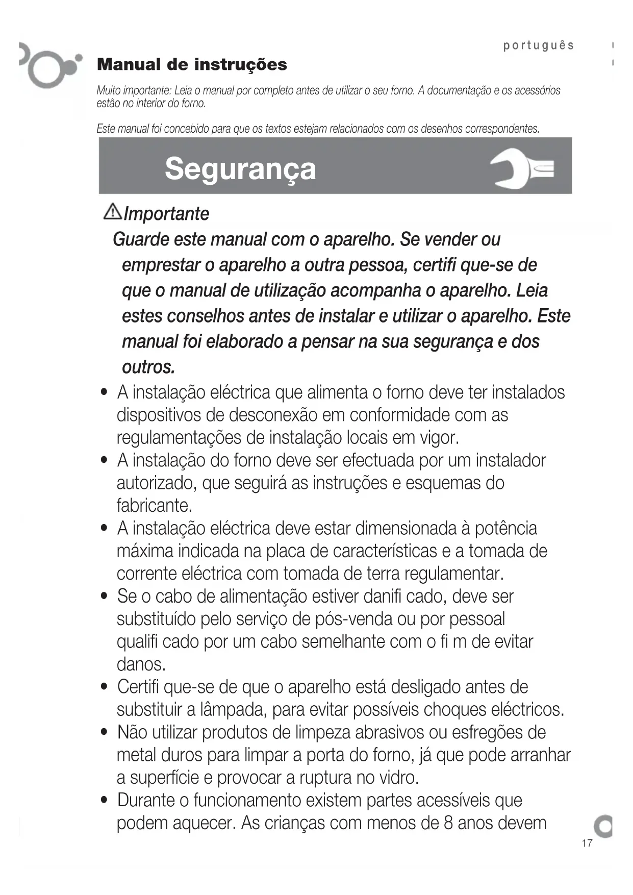 - Durante o funcionamento existem partes acessíveis que podem aquecer. As crianças com menos de 8 anos devem Importante Guarde este manual com o aparelho. Se vender ou emprestar o aparelho a outra pessoa, certifi que-se de que o manual de utilização acompanha o aparelho. Leia estes conselhos antes de instalar e utilizar o aparelho. Este manual foi elaborado a pensar na sua segurança e dos outros. Manual de instruções Muito importante: Leia o manual por completo antes de utilizar o seu forno. A documentação e os acessórios estão no interior do forno. Este manual foi concebido para que os textos estejam relacionados com os desenhos correspondentes.18 português manter-se afastadas, excepto se estiverem sob supervisão permanente.