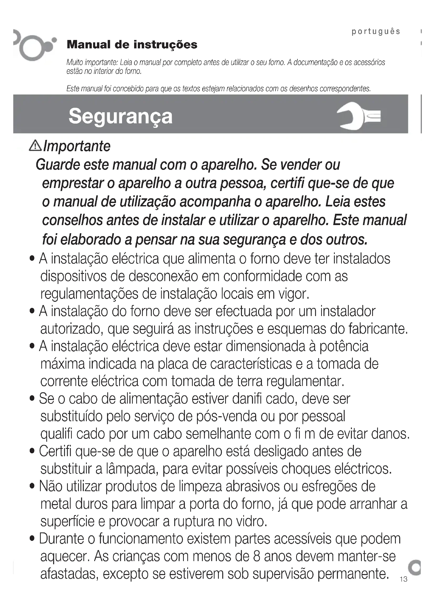 - Durante o funcionamento existem partes acessíveis que podem aquecer. As crianças com menos de 8 anos devem manter-se afastadas, excepto se estiverem sob supervisão permanente. Importante Guarde este manual com o aparelho. Se vender ou emprestar o aparelho a outra pessoa, certifi que-se de que o manual de utilização acompanha o aparelho. Leia estes conselhos antes de instalar e utilizar o aparelho. Este manual foi elaborado a pensar na sua segurança e dos outros. Manual de instruções Muito importante: Leia o manual por completo antes de utilizar o seu forno. A documentação e os acessórios estão no interior do forno. Este manual foi concebido para que os textos estejam relacionados com os desenhos correspondentes.14