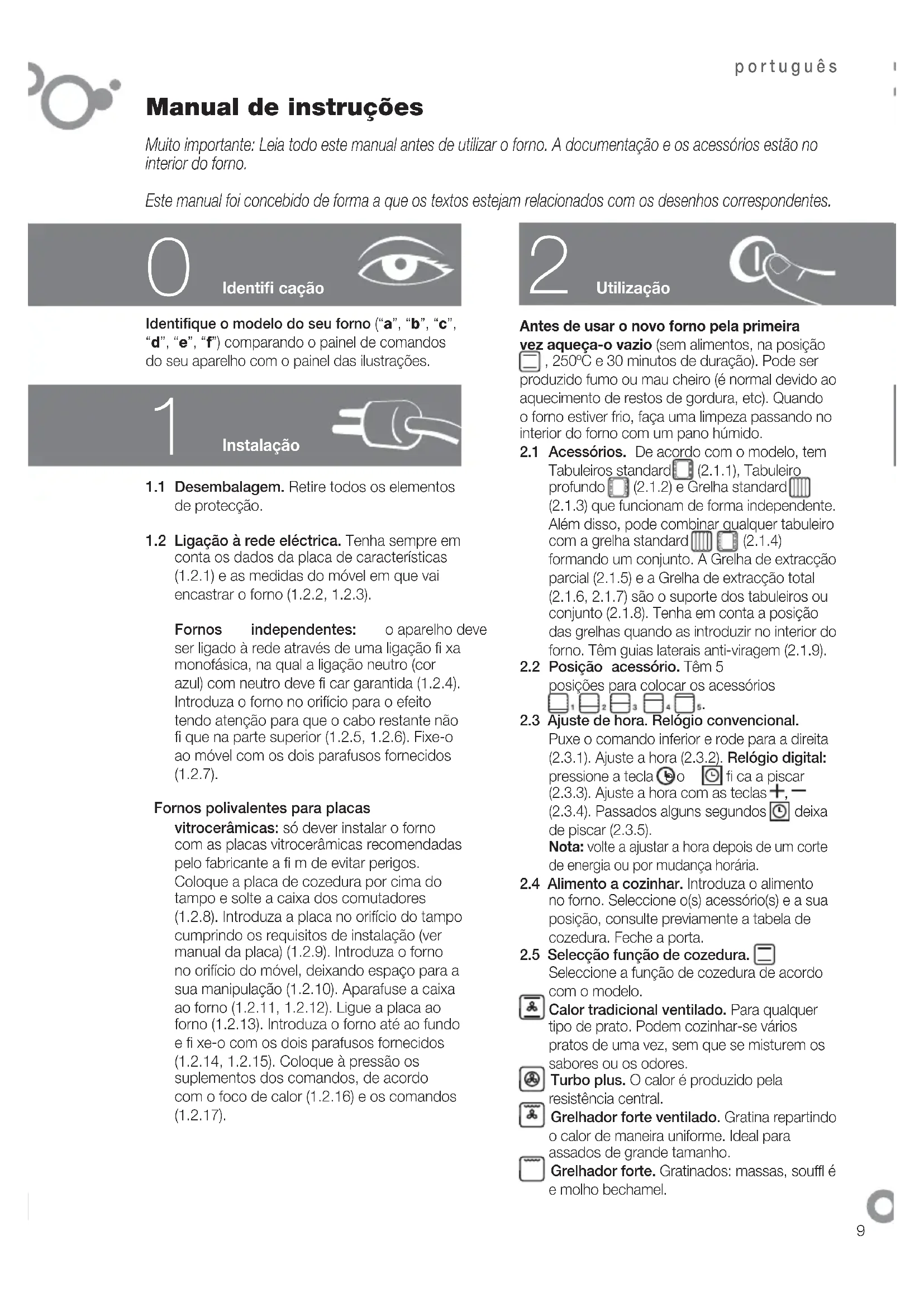 Manual de instruções Muito importante: Leia todo este manual antes de utilizar o forno. A documentação e os acessórios estão no interior do forno. Este manual foi concebido de forma a que os textos estejam relacionados com os desenhos correspondentes.