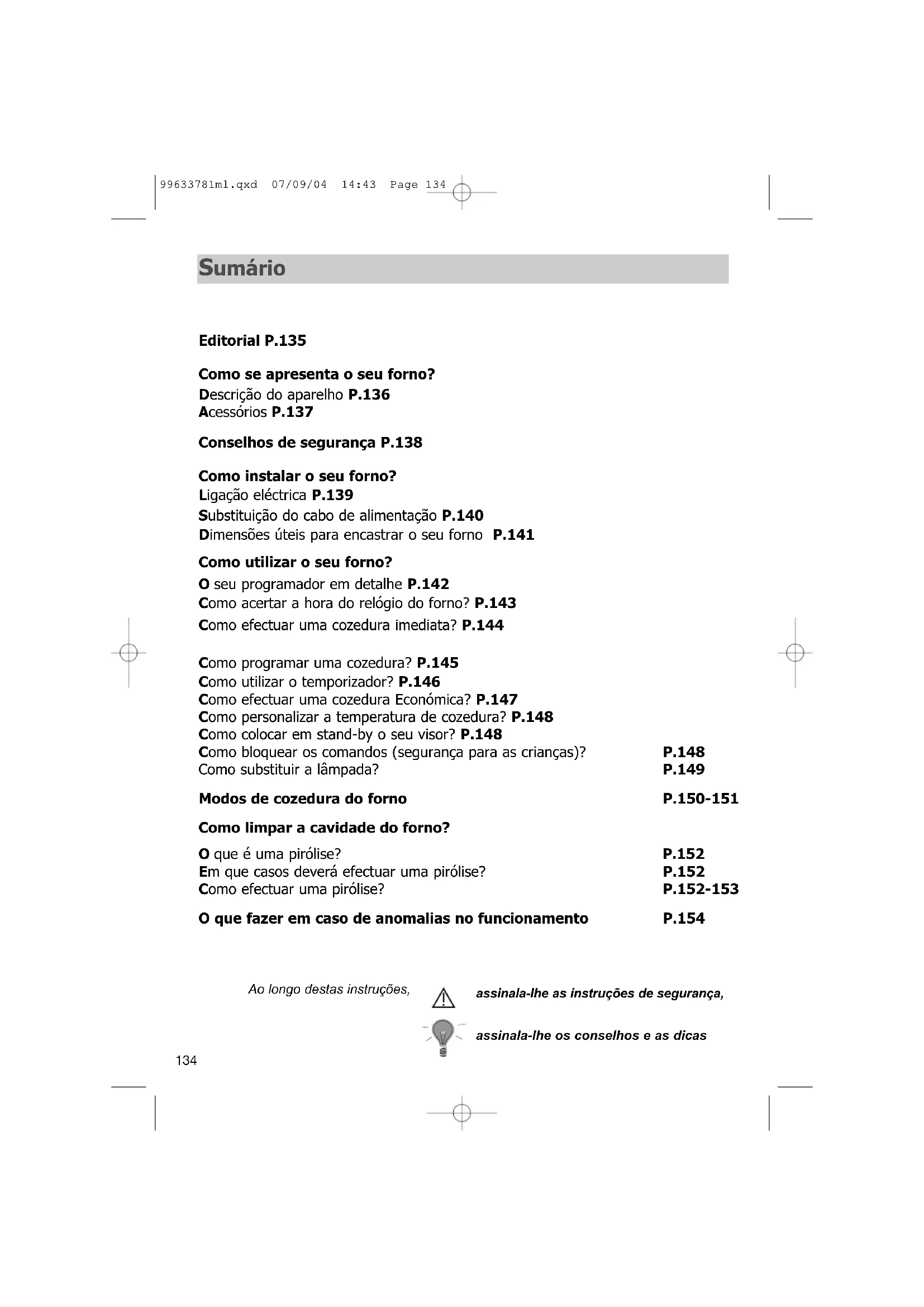 99633781ml.qxd 07/09/04 14:43 Page 132133 99633781ml.qxd 07/09/04 14:43 Page 133134 Ao longo destas instruções, assinala-lhe as instruções de segurança, assinala-lhe os conselhos e as dicas Editorial P.135 Como se apresenta o seu forno? Descrição do aparelho P.136 Acessórios P.137 Conselhos de segurança P.138 Como instalar o seu forno? Ligação eléctrica P.139 Substituição do cabo de alimentação P.140 Dimensões úteis para encastrar o seu forno P.141 Como utilizar o seu forno? O seu programador em detalhe P.142 Como acertar a hora do relógio do forno? P.143 Como efectuar uma cozedura imediata? P.144 Como programar uma cozedura? P.145 Como utilizar o temporizador? P.146 Como efectuar uma cozedura Económica? P.147 Como personalizar a temperatura de cozedura? P.148 Como colocar em stand-by o seu visor? P.148 Como bloquear os comandos (segurança para as crianças)? P.148 Como substituir a lâmpada? P.149 Modos de cozedura do forno P.150-151 Como limpar a cavidade do forno? O que é uma pirólise? P.152 Em que casos deverá efectuar uma pirólise? P.152 Como efectuar uma pirólise? P.152-153 O que fazer em caso de anomalias no funcionamento P.154 Sumário 99633781ml.qxd 07/09/04 14:43 Page 134135