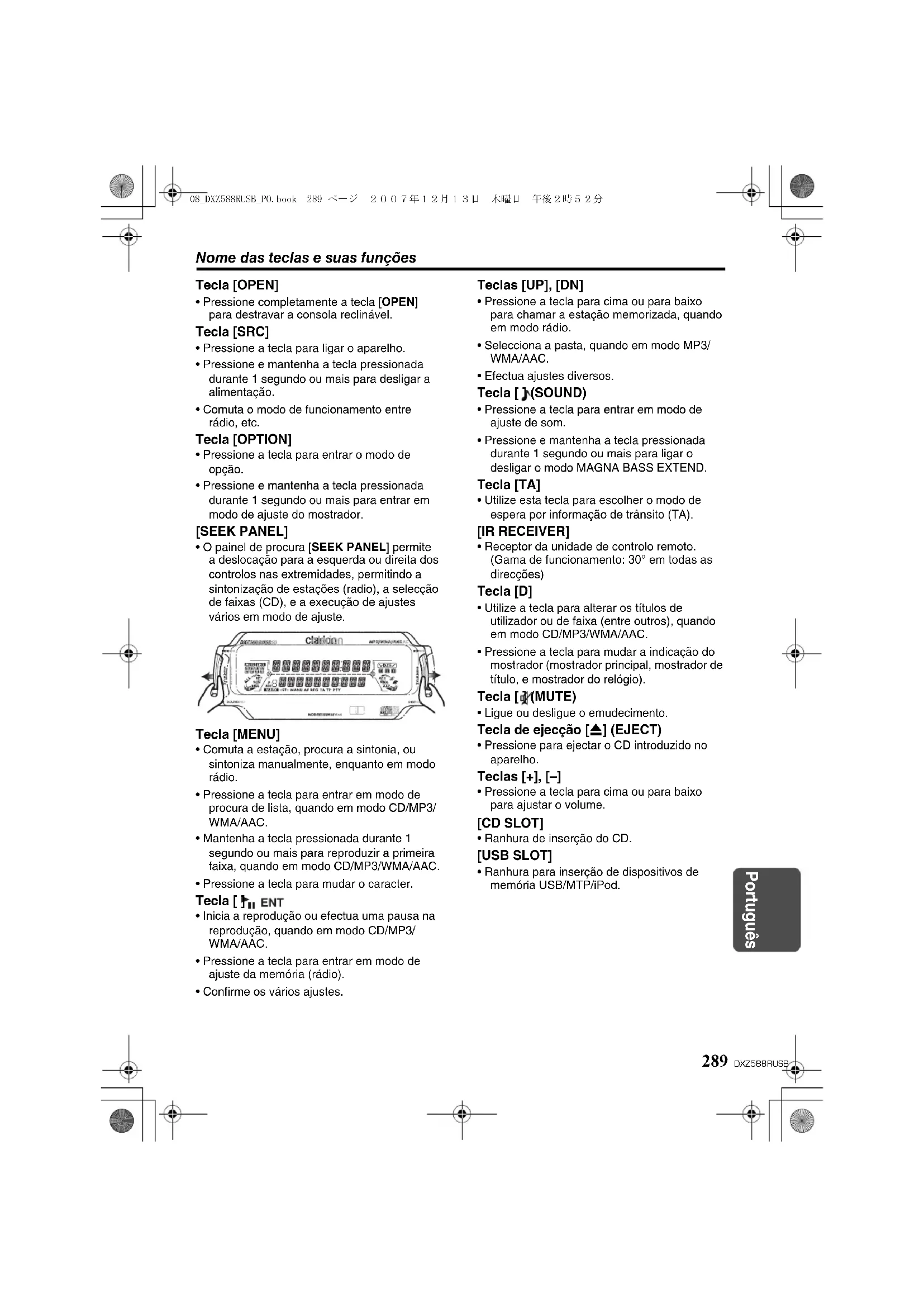 [ ] (EJECT) 08_DXZ588RUSB_PO.book 288 ページ 2007年12月13日 木曜日 午後2時52分Nome das teclas e suas funções 289 DXZ588RUSB Português Tecla [OPEN]