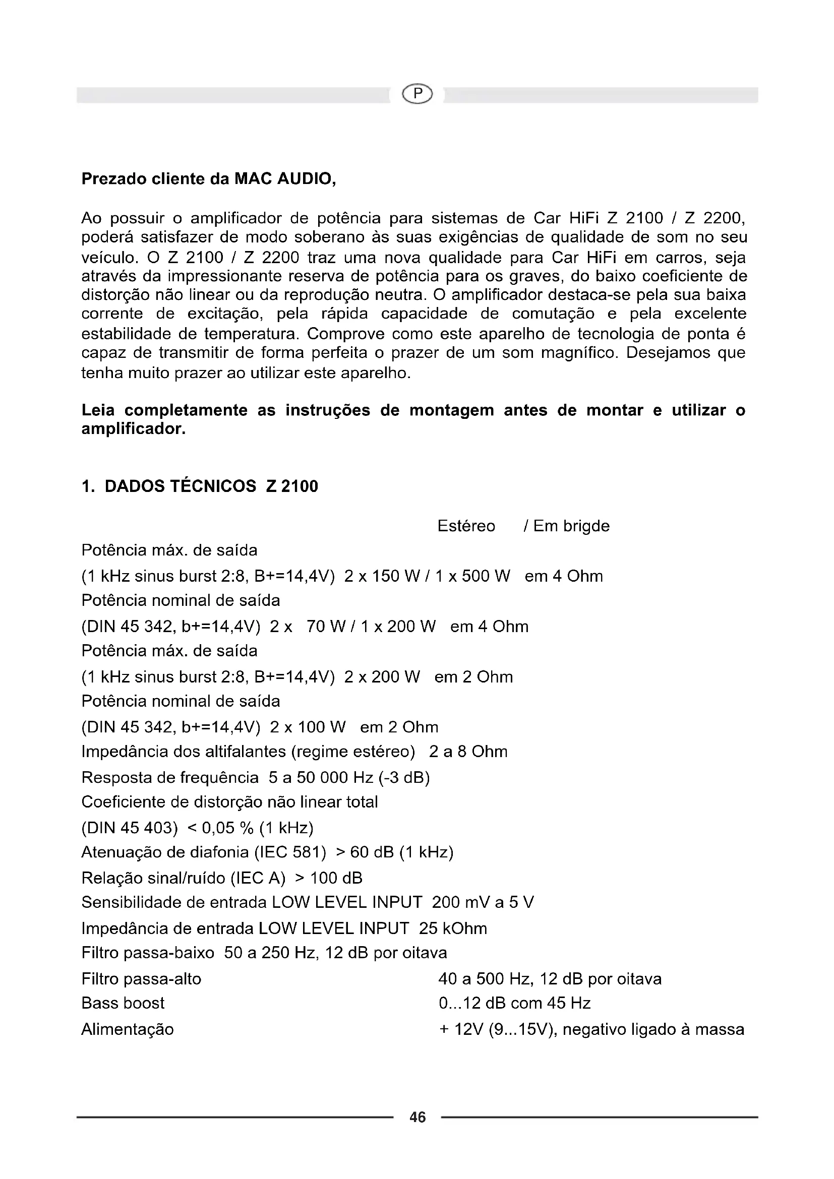 Prezado cliente da MAC AUDIO, Ao possuir o amplificador de potência para sistemas de Car HiFi Z 2100 / Z 2200, poderá satisfazer de modo soberano às suas exigências de qualidade de som no seu veículo. O Z 2100 / Z 2200 traz uma nova qualidade para Car HiFi em carros, seja através da impressionante reserva de potência para os graves, do baixo coeficiente de distorção não linear ou da reprodução neutra. O amplificador destaca-se pela sua baixa corrente de excitação, pela rápida capacidade de comutação e pela excelente estabilidade de temperatura. Comprove como este aparelho de tecnologia de ponta é capaz de transmitir de forma perfeita o prazer de um som magnífico. Desejamos que tenha muito prazer ao utilizar este aparelho. Leia completamente as instruções de montagem antes de montar e utilizar o amplificador.