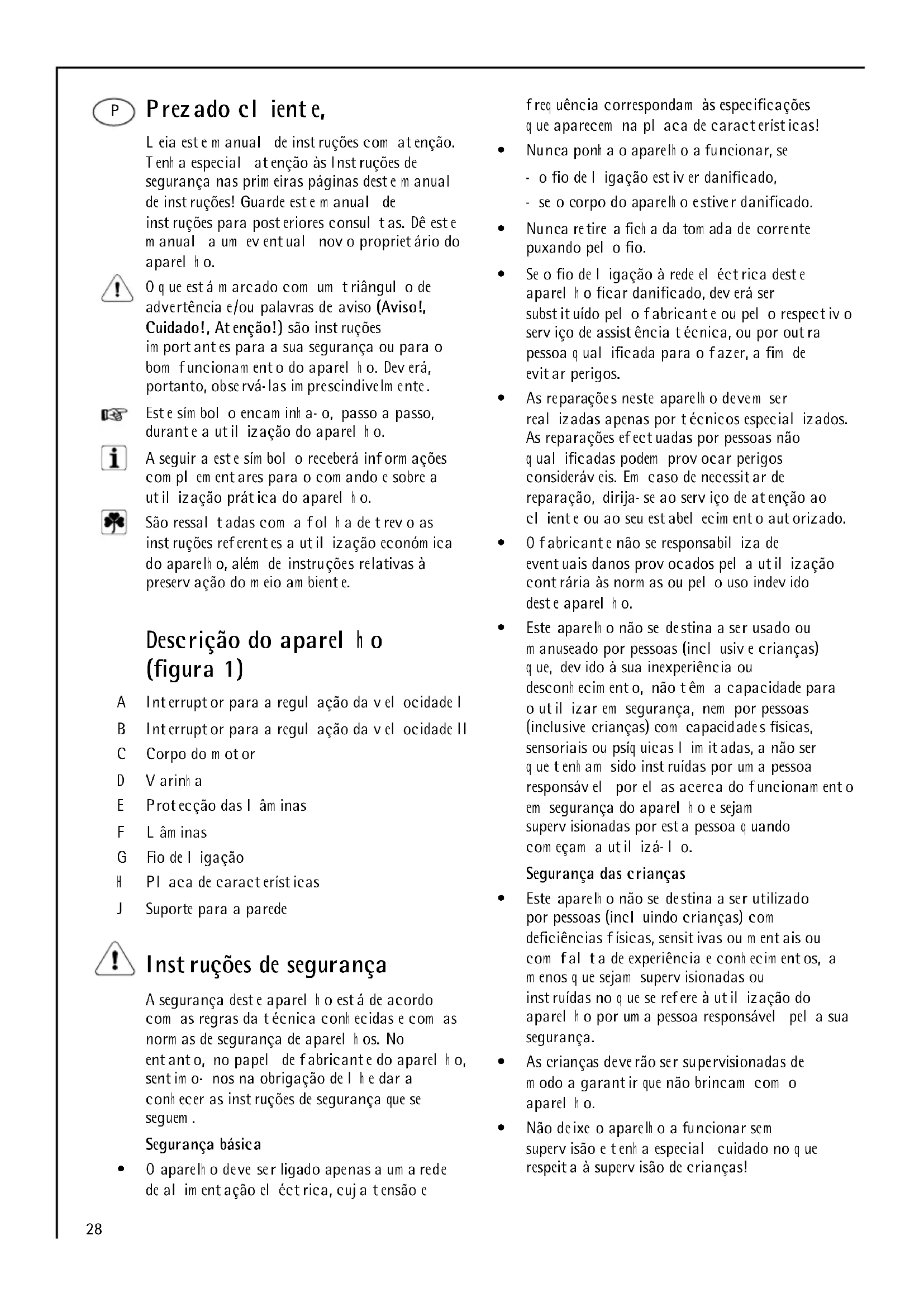 - Directiva EM C (Com patibilildad electrom agnética) 89 /336/CEE con las m odificaciones 9 2/31/CEE y 9 3/68/CEE28 Prezado cliente, Leia este m anual de instruções com atenção. Tenh a especial atenção às Instruções de segurança nas prim eiras páginas deste m anual de instruções! Guarde este m anual de instruções para posteriores consultas. Dê este m anual a um eventual novo proprietário do aparelh o. O q ue está m arcado com um triângulo de advertência e/ou palavras de aviso (Aviso!, Cuidado!, Atenção!) são instruções im portantes para a sua segurança ou para o bom funcionam ento do aparelh o. Deverá, portanto, observá- las im prescindivelm ente. Este sím bolo encam inh a- o, passo a passo, durante a utilização do aparelh o. A seguir a este sím bolo receberá inform ações com plem entares para o com ando e sobre a utilização prática do aparelh o. São ressaltadas com a folh a de trevo as instruções referentes a utilização económ ica do aparelh o, além de instruções relativas à preservação do m eio am biente. Descrição do aparelh o (figura 1) A Interruptor para a regulação da velocidade I B Interruptor para a regulação da velocidade II C Corpo do m otor D Varinh a E Protecção das lâm inas F Lâm inas G Fio de ligação H Placa de características J Suporte para a parede Instruções de segurança A segurança deste aparelh o está de acordo com as regras da técnica conh ecidas e com as norm as de segurança de aparelh os. No entanto, no papel de fabricante do aparelh o, sentim o- nos na obrigação de lh e dar a conh ecer as instruções de segurança que se seguem . Segurança básica