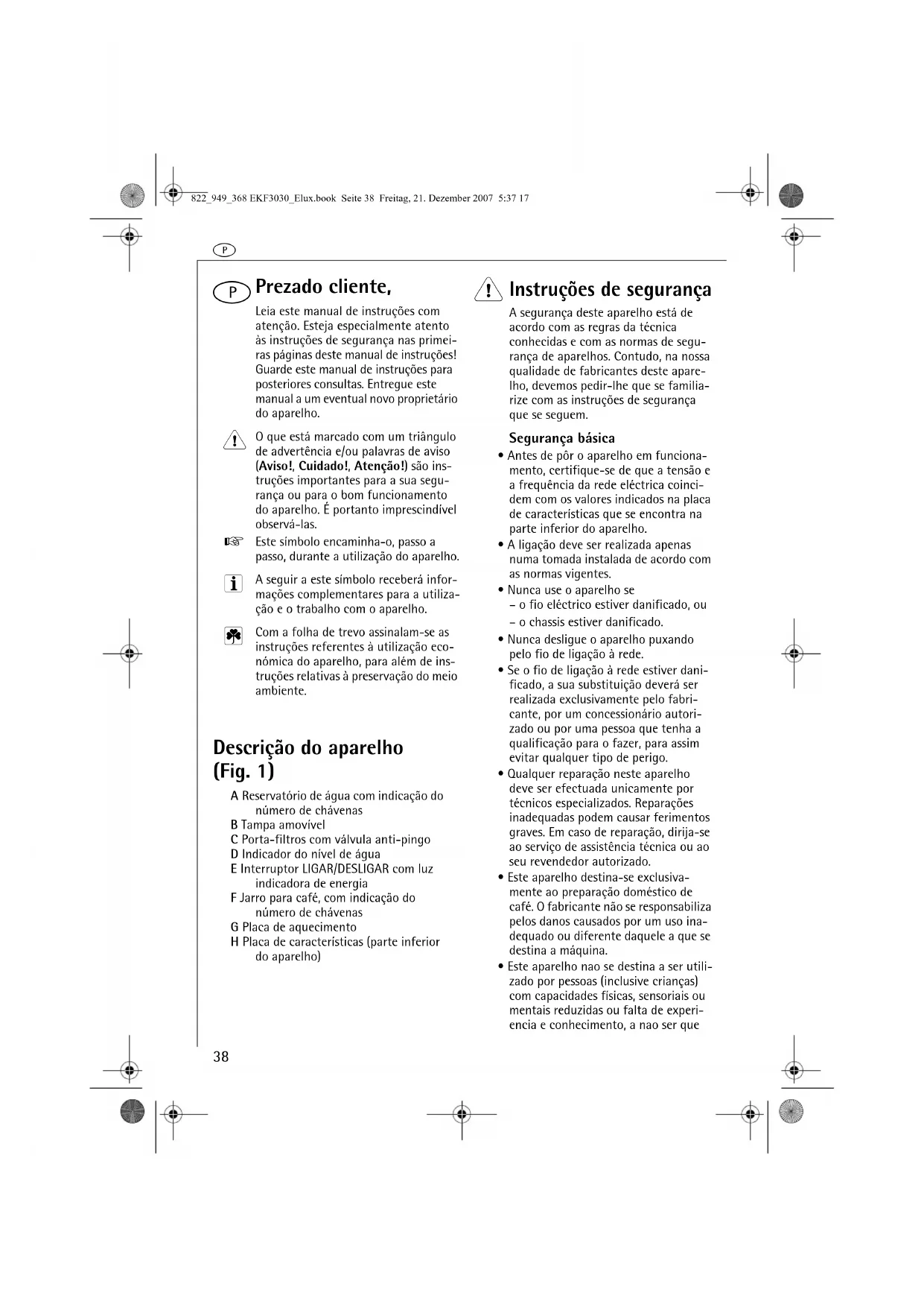 Instruções de segurança A segurança deste aparelho está de acordo com as regras da técnica conhecidas e com as normas de segu-rança de aparelhos. Contudo, na nossa qualidade de fabricantes deste apare-lho, devemos pedir-lhe que se familia-rize com as instruções de segurança que se seguem.Segurança básica• Antes de pôr o aparelho em funciona-mento, certifique-se de que a tensão e a frequência da rede eléctrica coinci-dem com os valores indicados na placa de características que se encontra na parte inferior do aparelho.• A ligação deve ser realizada apenas numa tomada instalada de acordo com as normas vigentes.• Nunca use o aparelho se– o fio eléctrico estiver danificado, ou– o chassis estiver danificado.• Nunca desligue o aparelho puxando pelo fio de ligação à rede.• Se o fio de ligação à rede estiver dani-ficado, a sua substituição deverá ser realizada exclusivamente pelo fabri-cante, por um concessionário autori-zado ou por uma pessoa que tenha a qualificação para o fazer, para assim evitar qualquer tipo de perigo.• Qualquer reparação neste aparelho deve ser efectuada unicamente por técnicos especializados. Reparações inadequadas podem causar ferimentos graves. Em caso de reparação, dirija-se ao serviço de assistência técnica ou ao seu revendedor autorizado. • Este aparelho destina-se exclusiva-mente ao preparação doméstico de café. O fabricante não se responsabiliza pelos danos causados por um uso ina-dequado ou diferente daquele a que se destina a máquina.• Este aparelho nao se destina a ser utili-zado por pessoas (inclusive crianças) com capacidades físicas, sensoriais ou mentais reduzidas ou falta de experi-encia e conhecimento, a nao ser que 822_949_368 EKF3030_Elux.book Seite 38 Freitag, 21. Dezember 2007 5:37 17p
