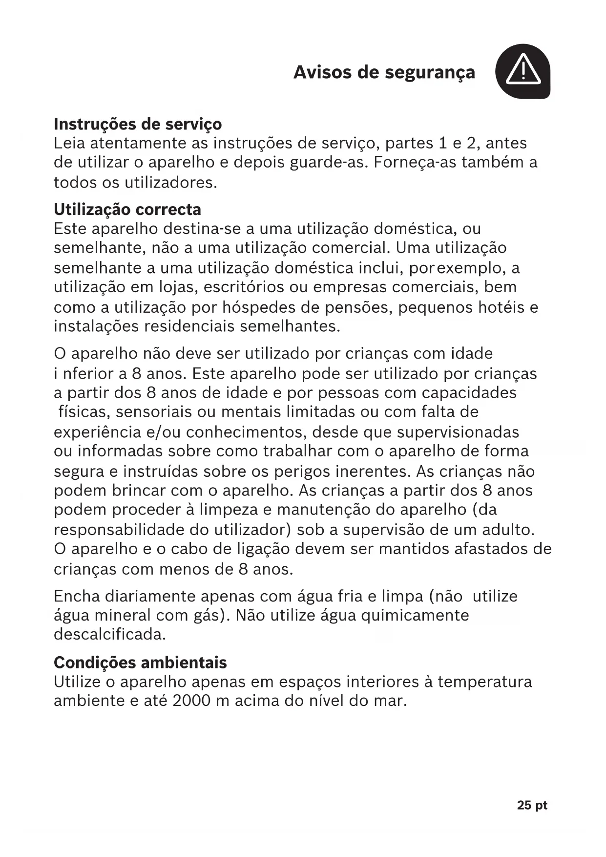 Instruções de serviço Leia atentamente as instruções de serviço, partes1 e 2, antes de utilizar o aparelho e depois guarde-as. Forneça-as também a todos os utilizadores. Utilização correcta Este aparelho destina-se a uma utilização doméstica, ou semelhante, não a uma utilização comercial. Uma utilização semelhante a uma utilização doméstica inclui, por exemplo, a utilização em lojas, escritórios ou empresas comerciais, bem como a utilização por hóspedes de pensões, pequenos hotéis e instalações residenciais semelhantes. O aparelho não deve ser utilizado por crianças com idade i nferior a 8 anos. Este aparelho pode ser utilizado por crianças a partir dos 8 anos de idade e por pessoas com capacidades físicas, sensoriais ou mentais limitadas ou com falta de experiência e/ou conhecimentos, desde que supervisionadas ou informadas sobre como trabalhar com o aparelho de forma segura e instruídas sobre os perigos inerentes. As crianças não podem brincar com o aparelho. As crianças a partir dos 8anos podem proceder à limpeza e manutenção do aparelho (da responsabilidade do utilizador) sob a supervisão de um adulto. O aparelho e o cabo de ligação devem ser mantidos afastados de crianças com menos de 8 anos. Encha diariamente apenas com água fria e limpa (não utilize água mineral com gás). Não utilize água quimicamente descalcificada. Condições ambientais Utilize o aparelho apenas em espaços interiores à temperatura ambiente e até 2000 m acima do nível do mar.26pt Alimentação Opere e conecte o aparelho apenas de acordo com as indicações na placa de características. Utilize a sua máquina TASSIMO apenas se esta e o seu cabo não apresentarem danos. Reparações Em caso de anomalia, desligue imediatamente o aparelho da tomada de corrente. Para prevenir riscos potenciais, as reparações do aparelho, como por exemplo, substituir um cabo danificado, competem exclusivamente aos nossos Serviços de Assistência Técnica. Perigo de queimadura! Nunca tente abrir a unidade de infusão durante o funcionamento. Tenha em conta que os líquidos que saem estão extremamente quentes. As cápsulas TDISC, o elemento de corte e a saída de bebidas podem estar muito quentes imediatamente após o ciclo de preparação. Deixe arrefecer primeiro. Não utilize cápsulas TDISC danificadas. Utilize as cápsulas TDISC apenas uma vez. Perigo de choque eléctrico! Antes de proceder à limpeza, desligue oaparelho com o botão ON / OFF e retire a ficha da tomada. Nunca mergulhe o aparelho ou o cabo de alimentação em água. Perigo de ferimentos! Não ingira, em circunstância alguma, solução de descalcificar. Poupar energia Para economizar energia, convém desligar a máquina TASSIMO após cada utilização.27 pt 1 Botão ON / OFF 2 Botão Start / Stop 3 Indicadores a Standby