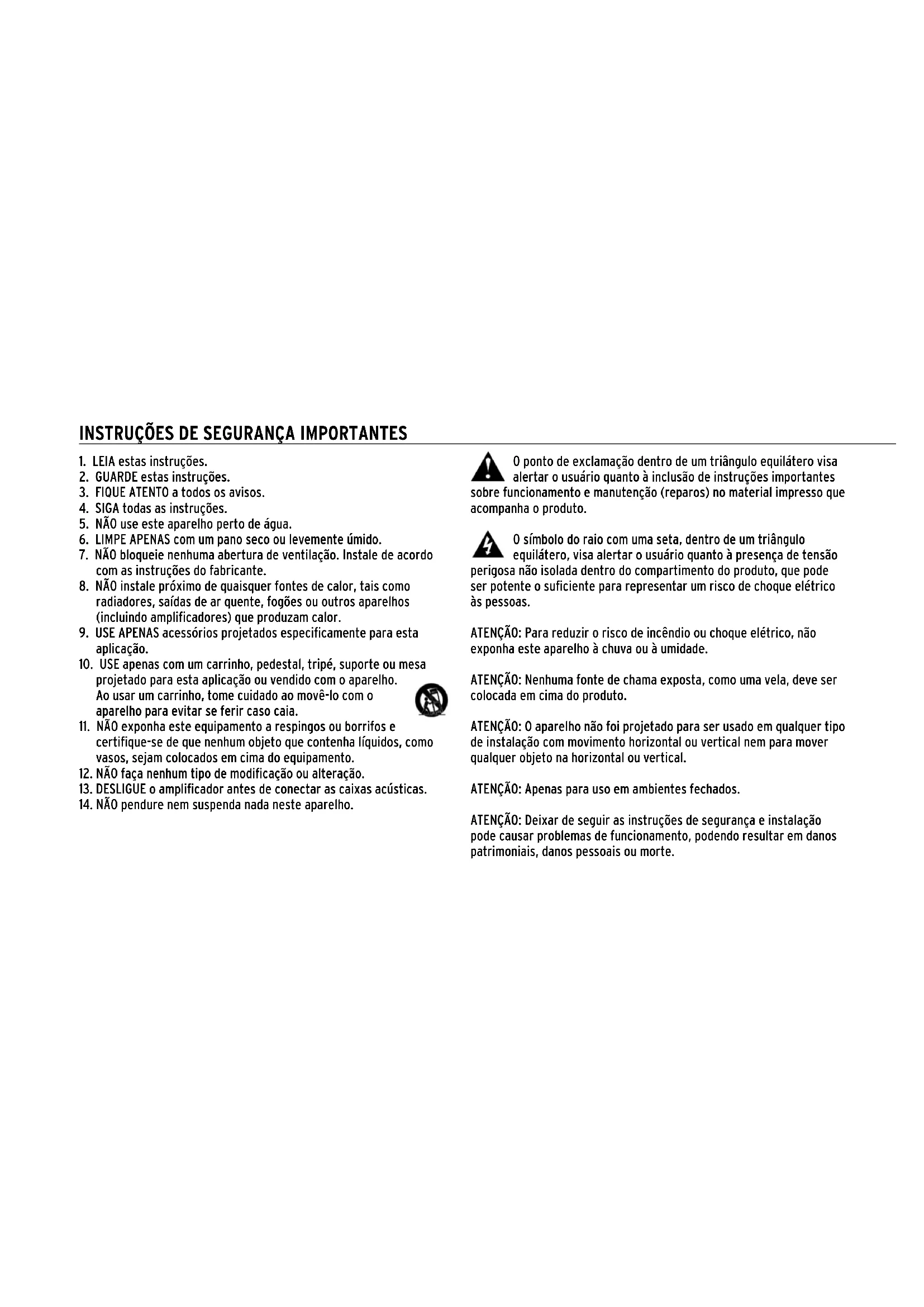 O ponto de exclamação dentro de um triângulo equilátero visa alertar o usuário quanto à inclusão de instruções importantes sobre funcionamento e manutenção (reparos) no material impresso que acompanha o produto. O símbolo do raio com uma seta, dentro de um triângulo equilátero, visa alertar o usuário quanto à presença de tensão perigosa não isolada dentro do compartimento do produto, que pode ser potente o suficiente para representar um risco de choque elétrico às pessoas. ATENÇÃO: Para reduzir o risco de incêndio ou choque elétrico, não exponha este aparelho à chuva ou à umidade. ATENÇÃO: Nenhuma fonte de chama exposta, como uma vela, deve ser colocada em cima do produto. ATENÇÃO: O aparelho não foi projetado para ser usado em qualquer tipo de instalação com movimento horizontal ou vertical nem para mover qualquer objeto na horizontal ou vertical. ATENÇÃO: Apenas para uso em ambientes fechados. ATENÇÃO: Deixar de seguir as instruções de segurança e instalação pode causar problemas de funcionamento, podendo resultar em danos patrimoniais, danos pessoais ou morte. INSTRUÇÕES DE SEGURANÇA IMPORTANTESATENÇÃO: A instalação deve ser feita por pessoal qualificado de acordo com os padrões e/ou códigos de construção apropriados. ATENÇÃO: Não abra! Risco de choque elétrico. As tensões presentes neste equipamento podem causar riscos à vida. Não há peças internas que possam ser reparadas pelo usuário. Toda a manutenção deve ser realizada por pessoal qualificado. INFORMAÇÕES SOBRE CONFORMIDADE COM AS NORMAS DA