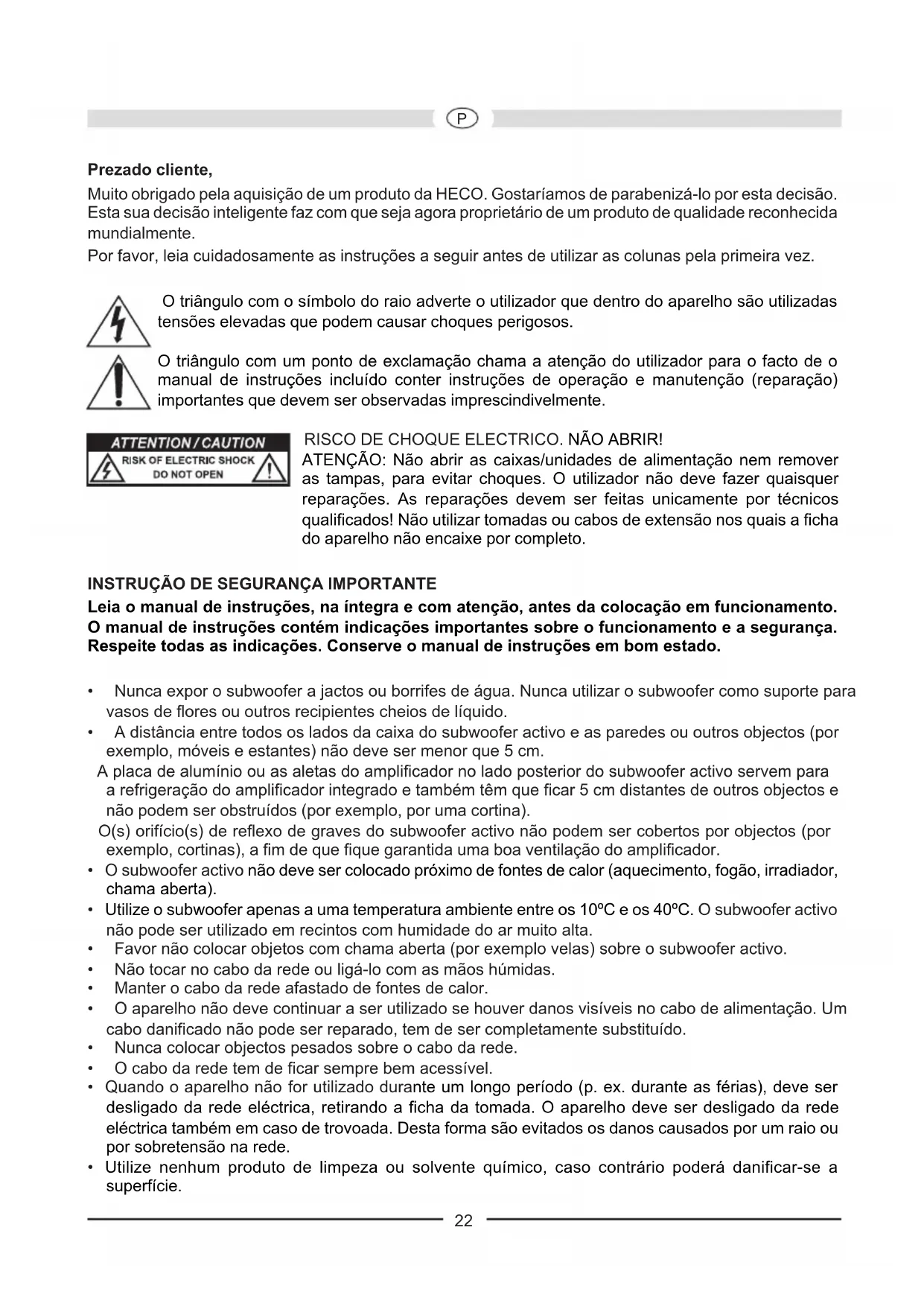 Prezado cliente, Muito obrigado pela aquisição de um produto da HECO. Gostaríamos de parabenizá-lo por esta decisão. Esta sua decisão inteligente faz com que seja agora proprietário de um produto de qualidade reconhecida mundialmente. Por favor, leia cuidadosamente as instruções a seguir antes de utilizar as colunas pela primeira vez. O triângulo com o símbolo do raio adverte o utilizador que dentro do aparelho são utilizadas tensões elevadas que podem causar choques perigosos. O triângulo com um ponto de exclamação chama a atenção do utilizador para o facto de o manual de instruções incluído conter instruções de operação e manutenção (reparação) importantes que devem ser observadas imprescindivelmente. RISCO DE CHOQUE ELECTRICO. NÃO ABRIR! ATENÇÃO: Não abrir as caixas/unidades de alimentação nem remover as tampas, para evitar choques. O utilizador não deve fazer quaisquer reparações. As reparações devem ser feitas unicamente por técnicos qualificados! Não utilizar tomadas ou cabos de extensão nos quais a ficha do aparelho não encaixe por completo.