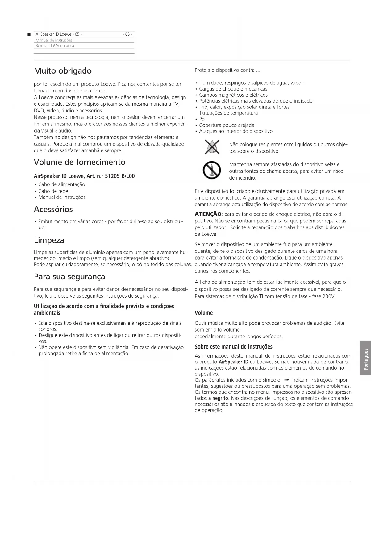 - 65 -Manual de instruçõesBem-vindo! Segurança Muito obrigado por ter escolhido um produto Loewe. Ficamos contentes por se ter tornado num dos nossos clientes. A Loewe congrega as mais elevadas exigências de tecnologia, design e usabilidade. Estes princípios aplicam-se da mesma maneira a TV, DVD, vídeo, áudio e acessórios. Nesse processo, nem a tecnologia, nem o design devem encerrar um m em si mesmo, mas oferecer aos nossos clientes a melhor experiên- cia visual e áudio. Também no design não nos pautamos por tendências efémeras e casuais. Porque anal comprou um dispositivo de elevada qualidade que o deve satisfazer amanhã e sempre. Volume de fornecimento AirSpeaker ID Loewe, Art. n.º 51205-B/L00