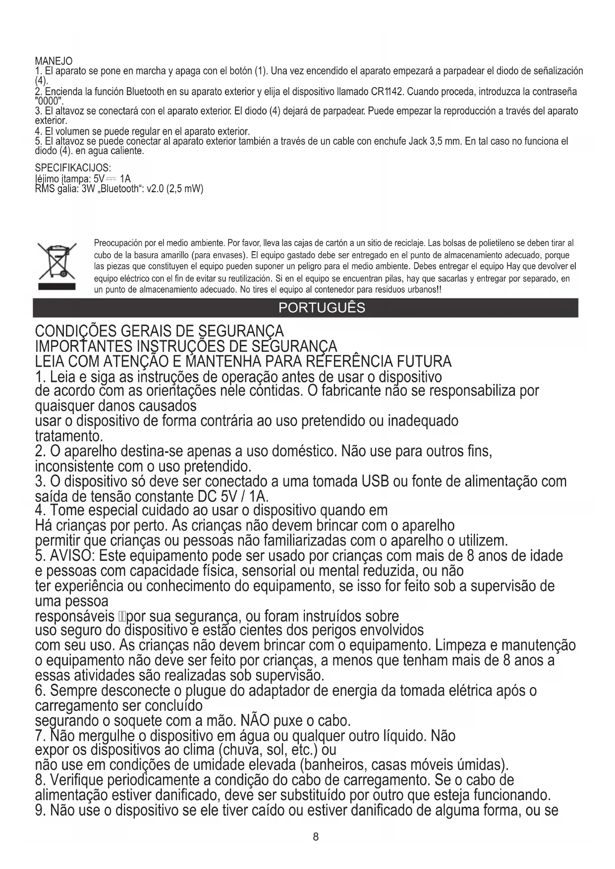 5. O altifalante pode ser também ligado ao dispositivo externo através de um cabo com a ficha Jack 3,5 mm. Neste caso o díodo (4) não vai funcionar. ESPECIFICACIONES: Voltaje de entrada: 5 V 1A Potencia RMS: 3 W Bluetooth:v2.0 (2,5 mW) LIETUVIŲ Protecção do meio ambiente. Rogamos, os embalagens de cartão destinem-se para papéis velhos. Os sacos de polietileno (PE) devem-se colocar em contenedores para material plástico. O dispositivo usado deve-se levar a um ponto de armazenamento adequado porque os componentes perigosos que ficam dentro do dispositivo podem ser perigosos para o meio ambiente. O dispositivo elétrico deve-se entregar de modo que se reduza a sua nova utilização e uso. Se no dispositivo há pilhas, devem-se tirar e levar a um ponto de armazenamento em separado. Não colocar o dispositivo em contenedores para resíduos municipais!!
