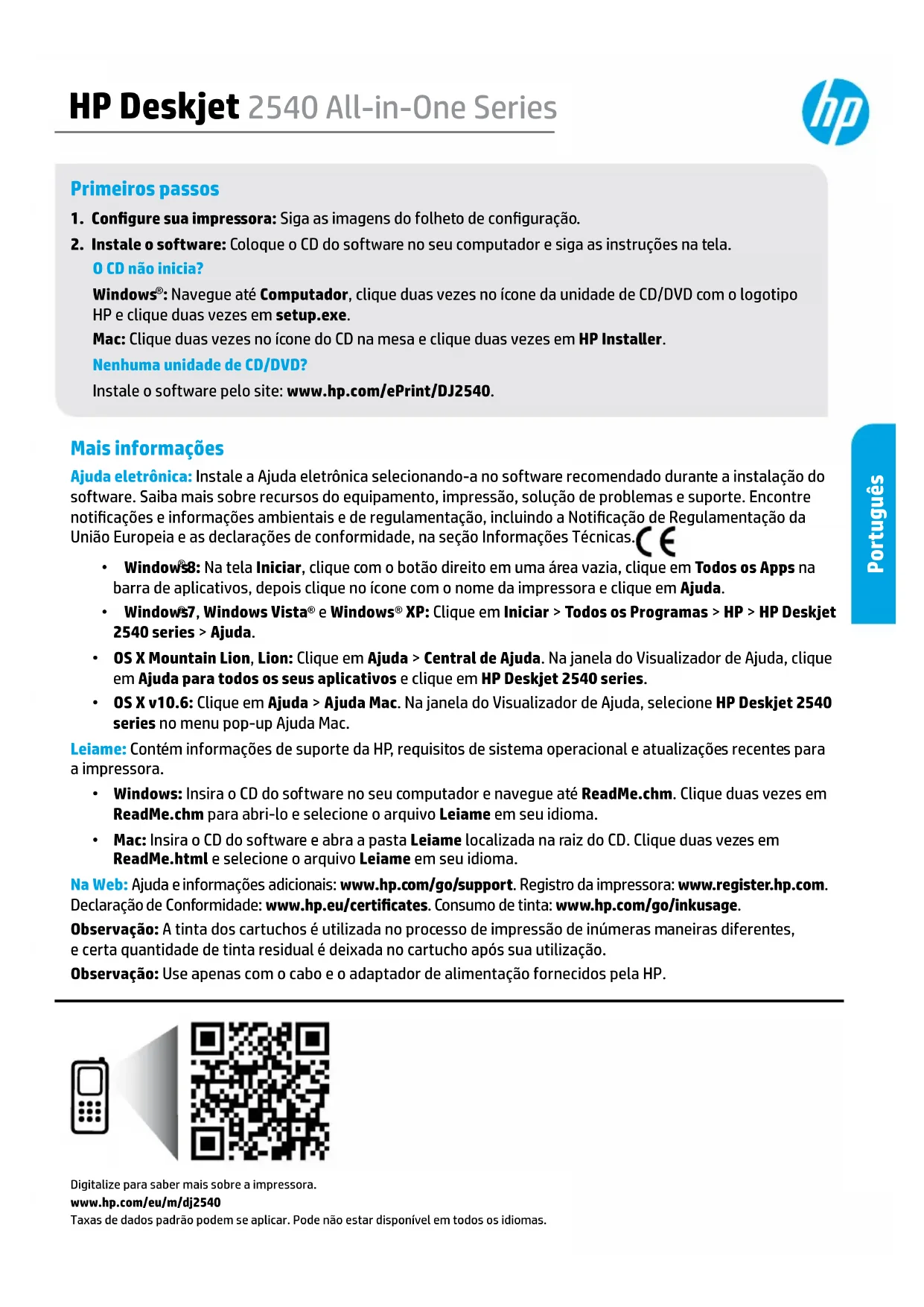 - Mac: Insira o CD do software e abra a pasta Leiame localizada na raiz do CD. Clique duas vezes em ReadMe.html e selecione o arquivo Leiame em seu idioma. Na Web: Ajuda e informações adicionais: www.hp.com/go/support. Registro da impressora: www.register.hp.com. Declaração de Conformidade: www.hp.eu/certicates. Consumo de tinta: www.hp.com/go/inkusage. Observação: A tinta dos cartuchos é utilizada no processo de impressão de inúmeras maneiras diferentes, e certa quantidade de tinta residual é deixada no cartucho após sua utilização. Digitalize para saber mais sobre a impressora.www.hp.com/eu/m/dj2540Taxas de dados padrão podem se aplicar. Pode não estar disponível em todos os idiomas. Observação: Use apenas com o cabo e o adaptador de alimentação fornecidos pela HP. Português32 Painel de Controle
