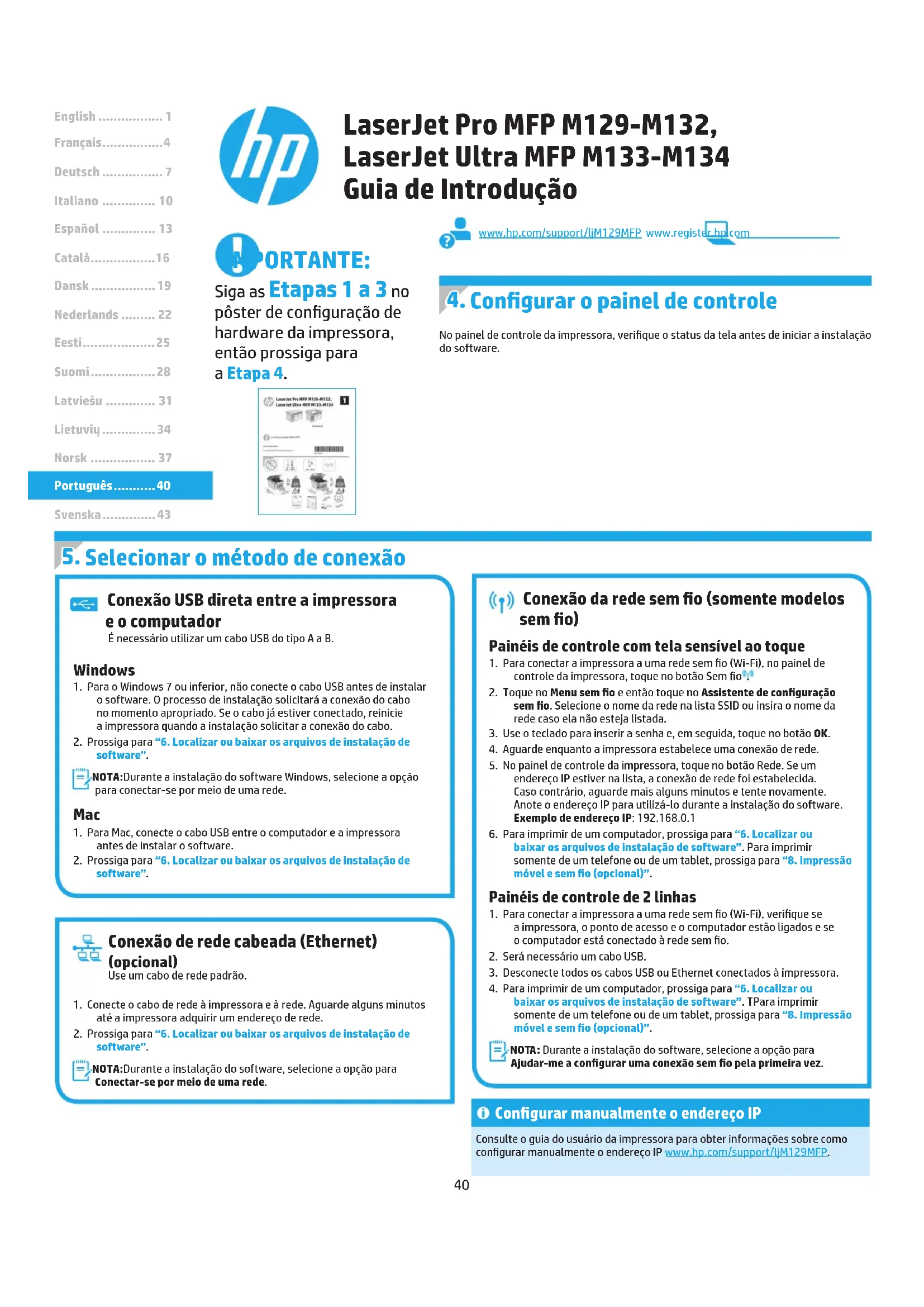 - Português Windows1. Para o Windows 7 ou inferior, não conecte o cabo USB antes de instalar o software. O processo de instalação solicitará a conexão do cabo no momento apropriado. Se o cabo já estiver conectado, reinicie aimpressora quando a instalação solicitar a conexão do cabo.2. Prossiga para “6. Localizar ou baixar os arquivos de instalação de software”. NOTA: Durante a instalação do software Windows, selecione a opção para conectar-se por meio de uma rede. Mac 1. Para Mac, conecte o cabo USB entre o computador e a impressora antes de instalar o software.2. Prossiga para “6. Localizar ou baixar os arquivos de instalação de software”. Conexão da rede sem o (somente modelos sem o) Painéis de controle com tela sensível ao toque1. Para conectar a impressora a uma rede sem o (Wi-Fi), no painel de controle da impressora, toque no botão Sem o .2. Toque no Menu sem o e então toque no Assistente de conguração sem o. Selecione o nome da rede na lista SSID ou insira o nome da rede caso ela não esteja listada.3. Use o teclado para inserir a senha e, em seguida, toque no botão OK.4. Aguarde enquanto a impressora estabelece uma conexão de rede.5. No painel de controle da impressora, toque no botão Rede. Se um endereço IP estiver na lista, a conexão de rede foi estabelecida. Casocontrário, aguarde mais alguns minutos e tente novamente. Anote o endereço IP para utilizá-lo durante a instalação do software. Exemplo de endereço IP: 192.168.0.16. Para imprimir de um computador, prossiga para “6. Localizar ou baixar os arquivos de instalação de software”. Para imprimir somente de um telefone ou de um tablet, prossiga para “8. Impressão móvel e sem o (opcional)”.Painéis de controle de 2 linhas1. Para conectar a impressora a uma rede sem o (Wi-Fi), verique se aimpressora, o ponto de acesso e o computador estão ligados e se ocomputador está conectado à rede sem o.2. Será necessário um cabo USB.3. Desconecte todos os cabos USB ou Ethernet conectados à impressora.4. Para imprimir de um computador, prossiga para “6. Localizar ou baixar os arquivos de instalação de software”. TPara imprimir somente de um telefone ou de um tablet, prossiga para “8. Impressão móvel e sem o (opcional)”. NOTA: Durante a instalação do software, selecione a opção para Ajudar-me a congurar uma conexão sem o pela primeira vez. Conexão de rede cabeada (Ethernet) (opcional)Use um cabo de rede padrão.1. Conecte o cabo de rede à impressora e à rede. Aguarde alguns minutos até a impressora adquirir um endereço de rede.2. Prossiga para “6. Localizar ou baixar os arquivos de instalação de software”. NOTA: Durante a instalação do software, selecione a opção para Conectar-se por meio de uma rede.www.hp.com/support/ljM129MFP www.register.hp.com Conexão USB direta entre a impressora e o computador É necessário utilizar um cabo USB do tipo A a B. IMPORTANTE: Siga as Etapas 1 a 3 no pôster de conguração de hardware da impressora, então prossiga para a Etapa 4. p. 40