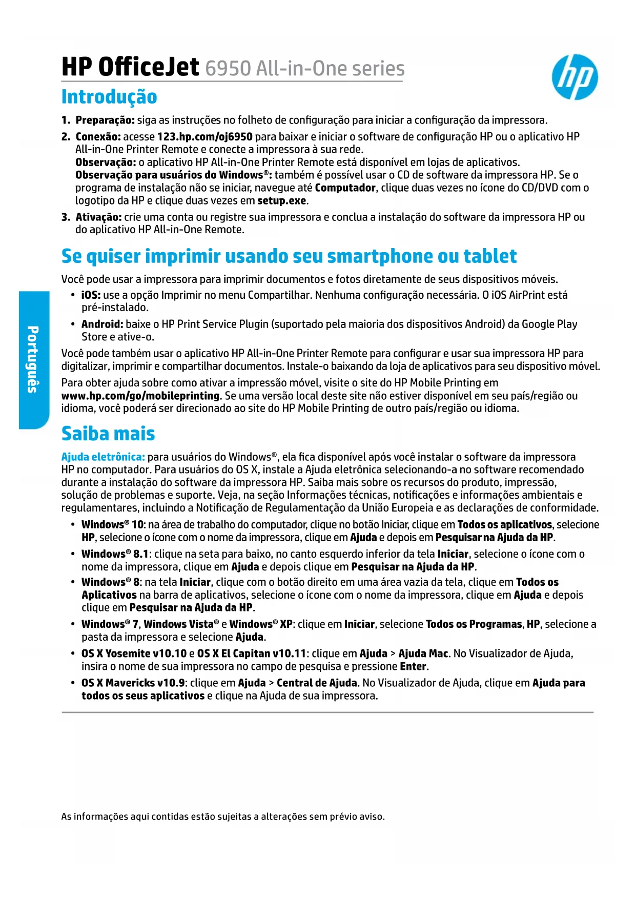s vantagens da Garantia Limitada HP aplicam-se cumulativamente com quaisquer direitos decorrentes da legislação aplicável à garantia de dois anos do vendedor, relativa a defeitos do produto e constante do contrato de venda. Existem, contudo, vários fatores que poderão afetar a sua elegibilidade para beneficiar de tais direitos. Os direitos legalmente atribuídos aos consumidores não são limitados ou afetados de forma alguma pela Garantia Limitada HP. Para mais informações, consulte a ligação seguinte: Garantia legal do consumidor ou visite o Web site da Rede dos Centros Europeus do Consumidor. Os consumidores têm o direito de escolher se pretendem reclamar assistência ao abrigo da Garantia Limitada HP ou contra o vendedor ao abrigo de uma garantia jurídica de dois anos. Para obter mais informações, consulte o link Garantia legal para o consumidor (www.hp.com/go/eu-legal) ou acesse o site dos European Consumer Centres (http://ec.europa.eu/consumers/solving_consumer_disputes/non-judicial_redress/ecc-net/). Produto HP Duração da garantia limitada Impressora Garantia de hardware de 1 ano Cartuchos de impressão ou de tinta Até que a tinta HP acabe ou até a data do “fim da garantia” impressa no cartucho, o que ocorrer primeiro. Esta garantia não cobre produtos de tinta HP que tenham sido reabastecidos, refabricados, recondicionados, adulterados ou utilizados de forma incorreta. Cabeças de impressão (aplicável somente aos produtos 1 ano com cabeças de impressão substituíveis pelo cliente) Acessórios 1 ano, a não ser que haja outra indicaçãoHP OiceJet 6950 All-in-One series De informatie in dit document kan zonder voorafgaande kennisgeving worden gewijzigd. Aan de slag