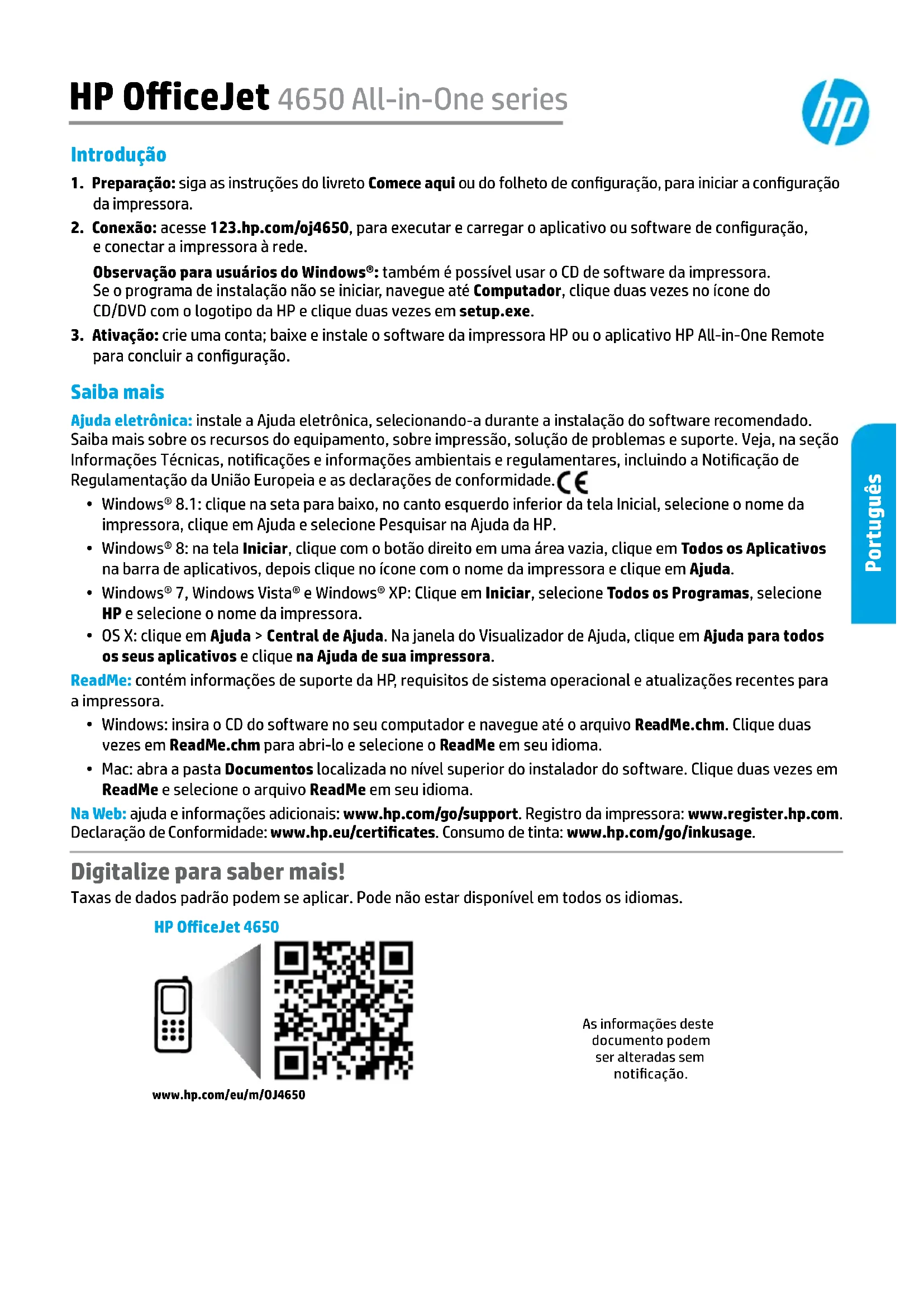para concluir a conguração. HP OiceJet 4650 All-in-One series Português As informações deste documento podem ser alteradas sem noticação.www.hp.com/eu/m/OJ4650HP OiceJet 465052 Informações de segurança Siga sempre as recomendações básicas de segurança ao usar a impressora, reduzindo o risco de incêndio ou choque elétrico.
