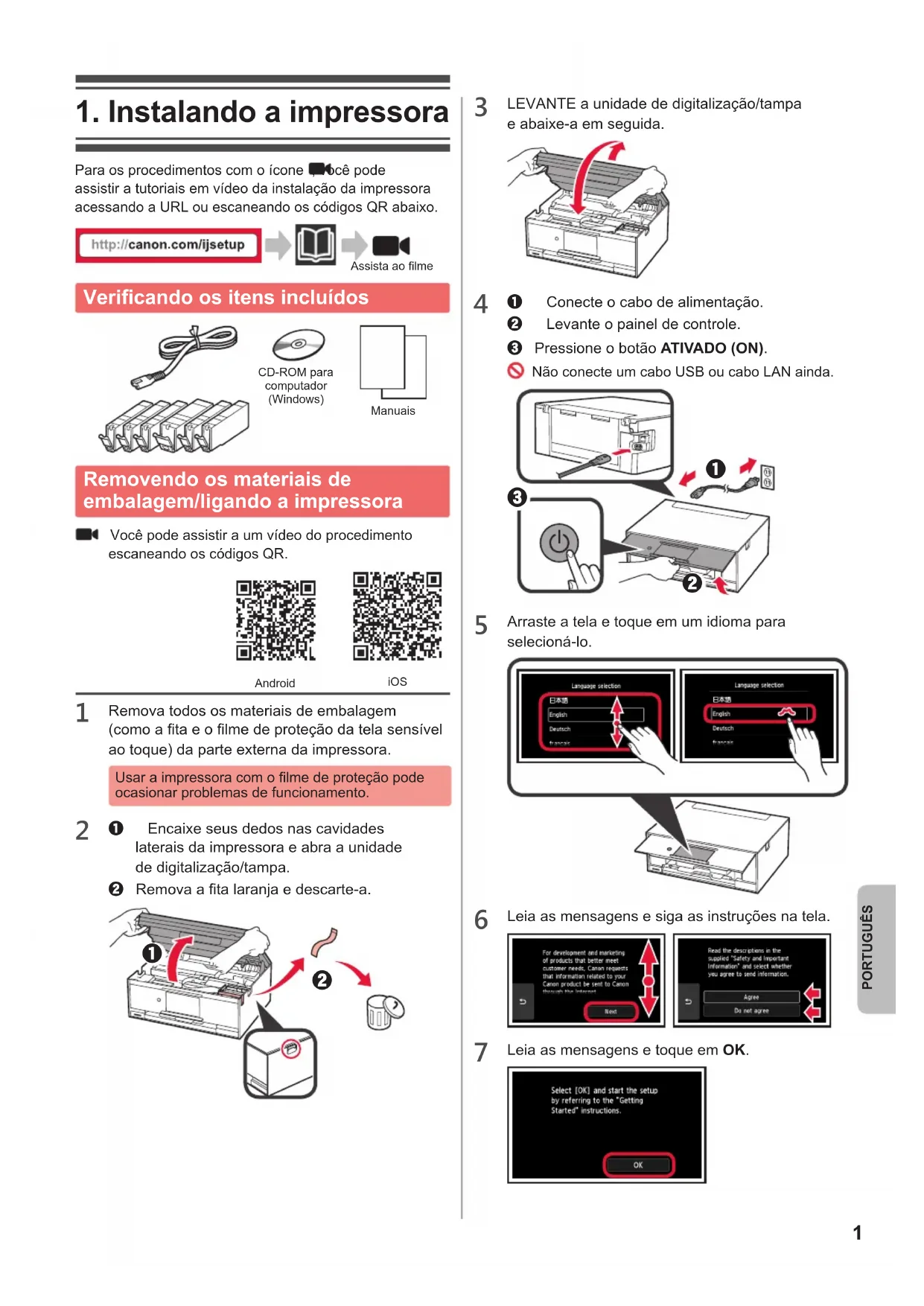 Para os procedimentos com o ícone , você pode assistir a tutoriais em vídeo da instalação da impressora acessando a URL ou escaneando os códigos QR abaixo. Assista ao lme Vericando os itens incluídos CD-ROM para computador (Windows)Manuais Removendo os materiais de embalagem/ligando a impressora Você pode assistir a um vídeo do procedimento escaneando os códigos QR. Android iOS