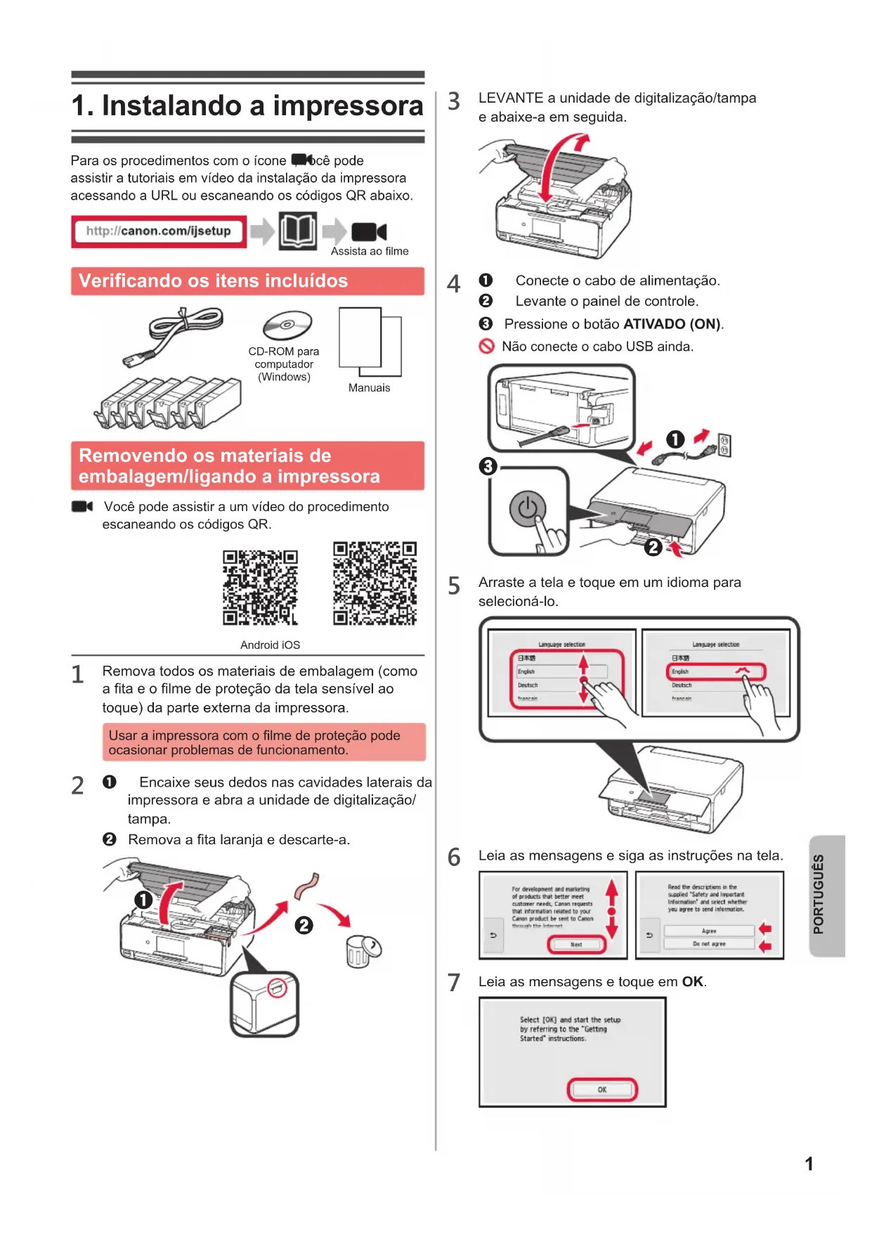 Para os procedimentos com o ícone , você pode assistir a tutoriais em vídeo da instalação da impressora acessando a URL ou escaneando os códigos QR abaixo. Assista ao lme Vericando os itens incluídos CD-ROM para computador (Windows)Manuais Removendo os materiais de embalagem/ligando a impressora Você pode assistir a um vídeo do procedimento escaneando os códigos QR. Android iOS