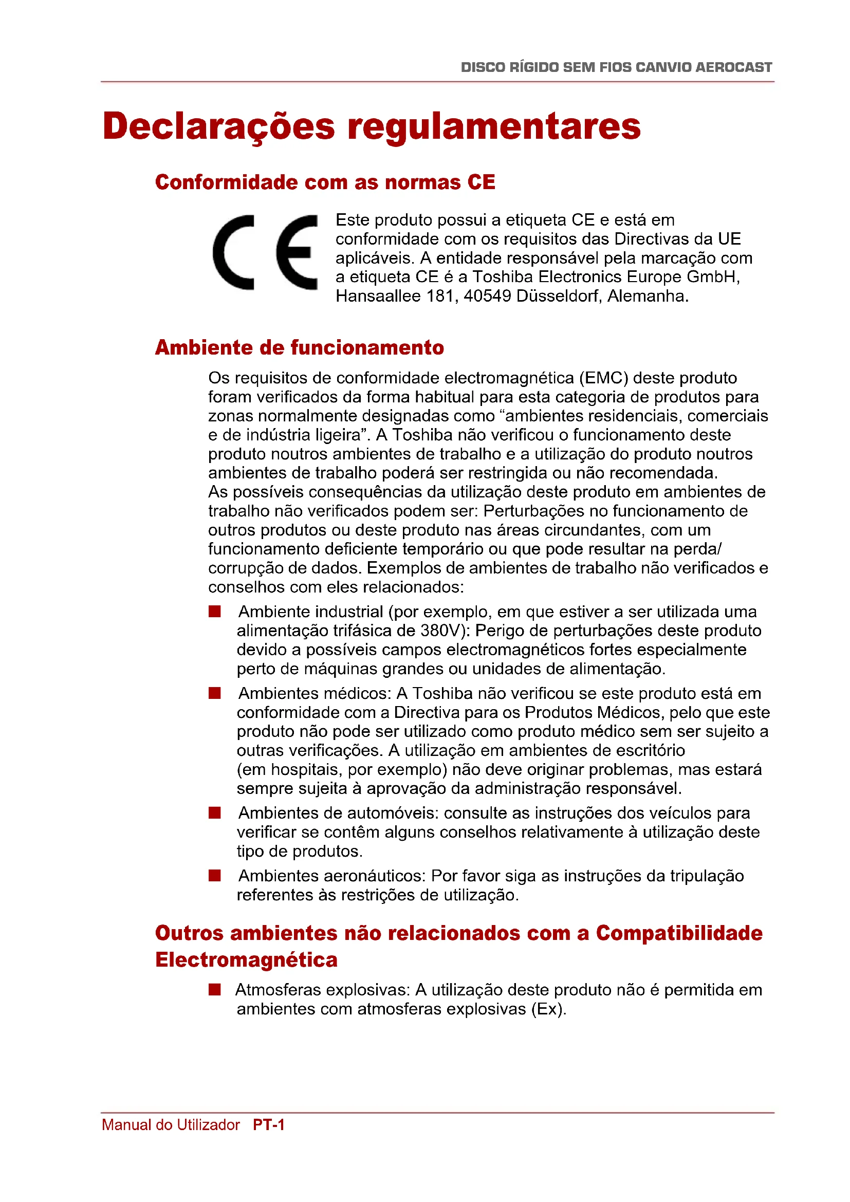 = 1.099.511.627.776 bytes, pelo que pode indicar uma menor capacidade de armazenamento. A capacidade disponível para armazenamento de dados (incluindo exemplo de diversos ficheiros de media) varia com base na dimensão dos ficheiros, formatação, configuração, software e sistema operativo, além de outros factores. NOTA Utilize apenas os acessórios fornecidos pelo fabricante. NOTA Esta unidade necessita de uma alimentação eléctrica pelo adaptador de alimentação de CA fornecido pelo fabricante. NOTA As especificações do produto estão sujeitas a alterações sem aviso prévio. NOTAManual do Utilizador PT-9 DISCO RÍGIDO SEM FIOS CANVIO AEROCAST Informações de segurança e Regras e Regulamentos para redes LAN sem fios Os dispositivos de LAN sem fios podem causar interferências em equipamentos médicos tais como pacemakers cardíacos. Se utiliza equipamentos médicos pessoais, consulte o seu médico e as instruções do equipamento médico antes de utilizar este Produto. O Produto não deve ser utilizado em ambientes em que existam equipamentos médicos tais como hospitais, consultórios médicos ou perto de utilizadores de equipamentos médicos uma vez que a utilização deste Produto pode ser prejudicial e causar danos nesses ambientes. CUIDADO Desligue sempre as comunicações sem fios se o computador se encontrar perto de equipamento ou dispositivos de controlo automático, como portas automáticas ou detectores de incêndio. As ondas de rádio podem ocasionar avarias nesses equipamentos de que poderão resultar danos físicos. CUIDADO Não utilize a funcionalidade de LAN sem fios perto de um forno de microondas ou em áreas sujeitas a interferências de rádio ou campos magnéticos. As interferências causadas por um forno de microondas ou outras fontes podem interromper o funcionamento da LAN sem fios. NOTA A velocidade de transmissão através da rede LAN sem fios, e o alcance da rede LAN sem fios, pode variar dependendo do ambiente electromagnético envolvente, dos obstáculos, da concepção e configuração do ponto de acesso, da concepção do cliente e das configurações do software/hardware. A velocidade de transmissão indicada é a velocidade máxima teórica tal como especificada pelas normas adequadas - a velocidade de transmissão real será inferior à velocidade máxima teórica. NOTAManual do Utilizador PT-10 DISCO RÍGIDO SEM FIOS CANVIO AEROCAST Imunidade de responsabilidade ■ A Toshiba não poderá ser responsabilizada pela corrupção ou perda de dados. (A Toshiba não fará qualquer recuperação de dados nem pagará os custos de qualquer recuperação de dados.) ■ A Toshiba não poderá ser responsabilizada por quaisquer danos causados por falha ou negligência dos utilizadores, incêndio, tremores de terra ou outros acidentes que estejam fora do controlo da Toshiba. ■ A Toshiba não poderá ser responsabilizada em quaisquer circunstâncias se o utilizador não seguir as directivas contidas neste manual do utilizador. ■ A Toshiba não poderá ser responsabilizada em quaisquer circunstância pela utilização indevida do dispositivo de ligação e do software. ■ O suporte para este produto só está disponível no país em que o produto foi originalmente adquirido. Restrições de utilização Esta unidade destina-se a ser utilizada em aplicações standard como trabalhos de escritório, unidade pessoal e com dispositivos de utilização doméstica. A Toshiba Corporation não poderá ser responsabilizada por qualquer utilização diferente das indicadas. Não utilizar para finalidades especiais (controlo de sistemas atómicos, sistemas aeronáuticos ou espaciais, controlos operacionais de veículos de transporte de massas, dispositivos médicos de suporte de vida ou controlos de disparo de armas) em que existam requisitos especialmente elevados de fiabilidade, em que não estejam garantidos os níveis de segurança adequados ou quando uma falha ou erro de operação possa ameaçar a vida ou causar danos físicos.Manual do Utilizador PT-11 DISCO RÍGIDO SEM FIOS CANVIO AEROCAST Aviso A informação contida neste manual, incluindo, mas não se limitando a quaisquer especificações de produtos, está sujeita a alteração sem aviso prévio. A TOSHIBA ELECTRONICS EUROPE GMBH NÃO DÁ QUAISQUER GARANTIAS NO QUE DIZ RESPEITO A ESTE MANUAL OU A QUALQUER OUTRA INFORMAÇÃO NELE CONTIDA E REJEITA