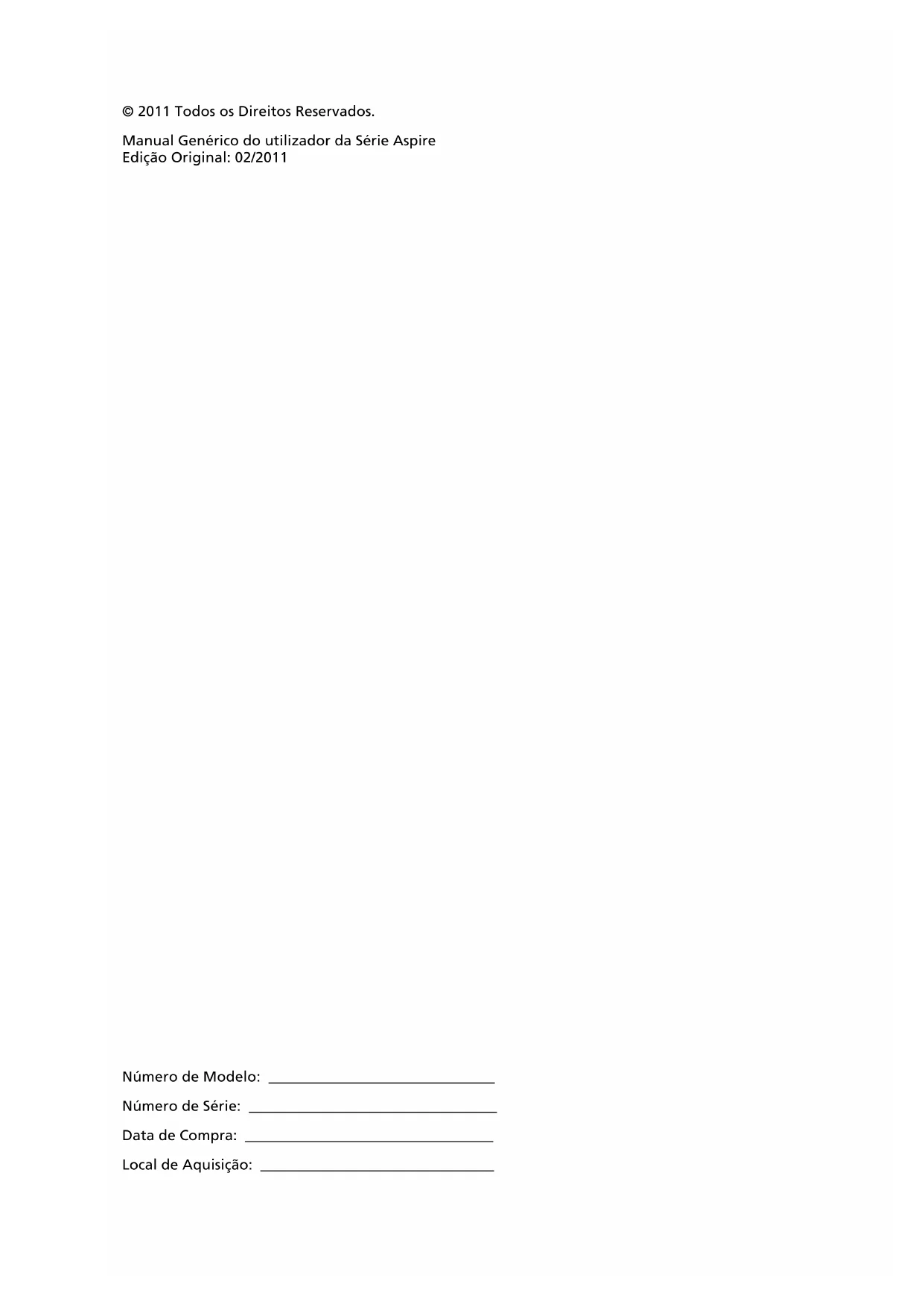 - v'n Pixel fault class Class IISérie Aspire Manual Genérico do utilizadorNúmero de Modelo: _______________________________ Número de Série: __________________________________ Data de Compra: __________________________________ Local de Aquisição: ________________________________ Poderá haver alterações periódicas às informações contidas na presente publicação sem qualquer obrigação de notificação sobre tais revisões ou alterações. As eventuais alterações serão incorporadas nas novas edições deste manual ou de documentos e publicações suplementares. A empresa não faz quaisquer afirmações nem garantias, sejam elas expressas ou implícitas, relativamente aos conteúdos da presente, e rejeita especificamente as garantias implícitas relativamente à comercialidade e à aptidão para um fim específico. Escreva o número de modelo, número de série, data e local de aquisição no espaço em baixo. O número de série e o número de modelo encontram-se na etiqueta afixada no computador. Toda a correspondência relativa à sua unidade deve incluir o número de série, o número de modelo e as informações relativas à aquisição. Nenhuma parte da presente publicação pode ser reproduzida, guardada em sistemas de armazenamento de dados ou transmitida, de alguma forma ou através de qualquer meio, seja ele electrónico, mecânico, por fotocópia, gravação ou de outra forma, sem a autorização prévia e por escrito da Acer Incorporated. © 2011 Todos os Direitos Reservados. Manual Genérico do utilizador da Série Aspire Edição Original: 02/2011iii Informações relativas à sua segurança e conforto Instruções de segurança Leia este manual com atenção. Guarde este documento para futuras consultas. Siga todas as advertências e instruções marcadas no produto. Desligar o produto antes de limpar Desligue este produto da tomada de parede antes de limpá-lo. Não use produtos de limpeza líquidos nem aerossóis. Para limpeza, utilize um tecido humedecido com água. CUIDADO com a tomada ao desconectar do dispositivo Siga as seguintes orientações ao conectar e desconectar o aparelho na fonte de alimentação: Instale a fonte de alimentação antes de conectar o cabo de alimentação à tomada CA. Desconecte o cabo de alimentação antes de remover a fonte de alimentação do computador. Se o sistema tiver várias fontes de alimentação, desconecte a alimentação do sistema retirando todos os cabos de alimentação das respectivas fontes. CUIDADO com Acessibilidade Certifique-se de que a tomada em que conecta o cabo seja de fácil acesso e localizada o mais próximo possível do operador do equipamento. Quando precisar desconectar a alimentação do equipamento, certifique-se de retirar o cabo da tomada elétrica. ATENÇÃO à(s) protecção(ões) de plástico incluídas (apenas para determinados modelos) O seu computador foi enviado com uma protecção plástica instalada nas ranhuras de cartões. Elas protegem os slots não usados contra poeira, objetos metálicos e outras partículas. Guarde as protecções para usar quando não houver cartões nas ranhuras. CUIDADO a ter quando está a ouvir Para proteger a sua audição, siga estas instruções.