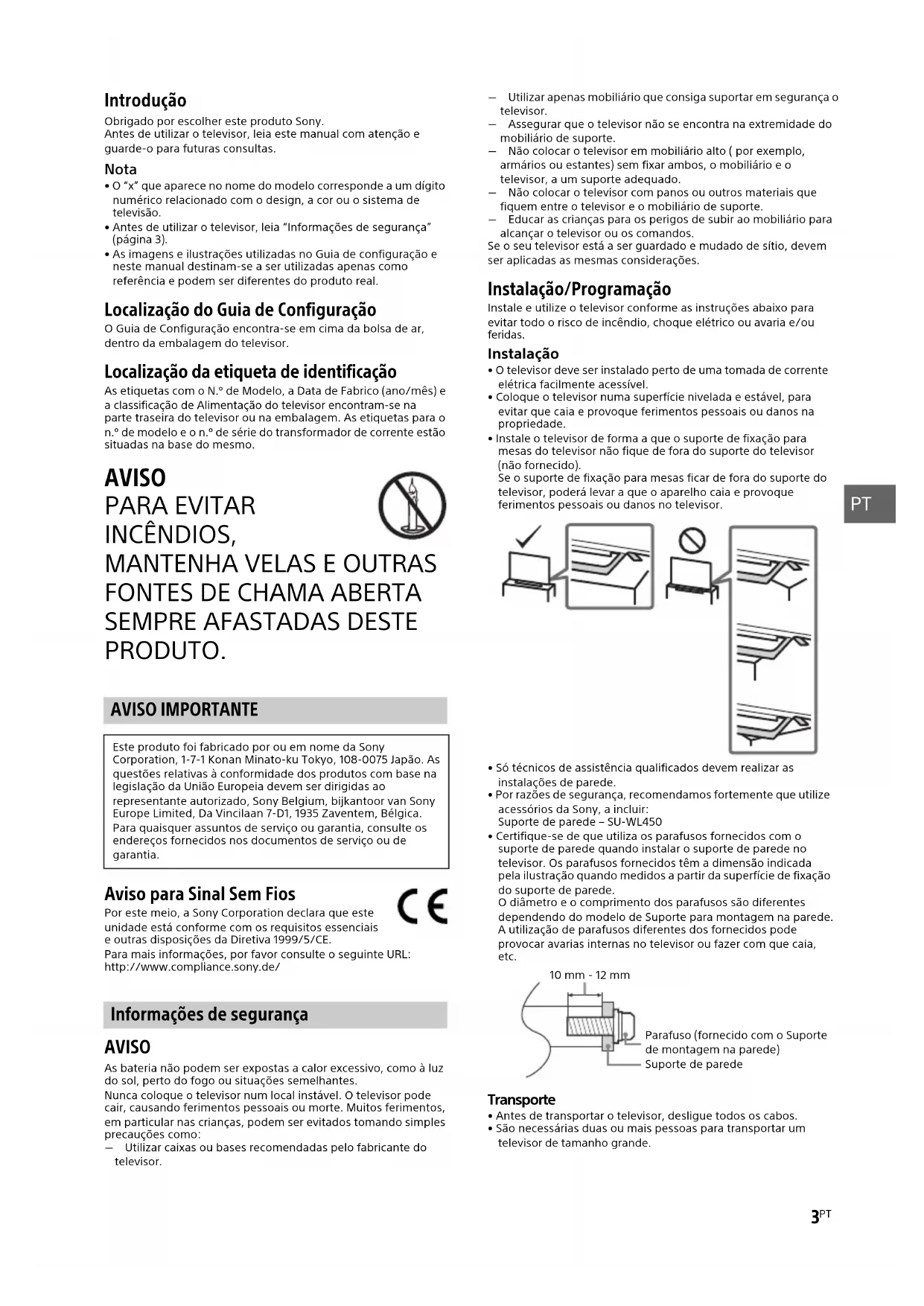 PRODUTO. Aviso para Sinal Sem Fios Por este meio, a Sony Corporation declara que este unidade está conforme com os requisitos essenciais e outras disposições da Diretiva 1999/5/CE. Para mais informações, por favor consulte o seguinte URL: http://www.compliance.sony.de/ AVISO As bateria não podem ser expostas a calor excessivo, como à luz do sol, perto do fogo ou situações semelhantes. Nunca coloque o televisor num local instável. O televisor pode cair, causando ferimentos pessoais ou morte. Muitos ferimentos, em particular nas crianças, podem ser evitados tomando simples precauções como: Utilizar caixas ou bases recomendadas pelo fabricante do televisor. Utilizar apenas mobiliário que consiga suportar em segurança o televisor. Assegurar que o televisor não se encontra na extremidade do mobiliário de suporte. Não colocar o televisor em mobiliário alto ( por exemplo, armários ou estantes) sem fixar ambos, o mobiliário e o televisor, a um suporte adequado. Não colocar o televisor com panos ou outros materiais que fiquem entre o televisor e o mobiliário de suporte. Educar as crianças para os perigos de subir ao mobiliário para alcançar o televisor ou os comandos. Se o seu televisor está a ser guardado e mudado de sítio, devem ser aplicadas as mesmas considerações. Instalação/Programação Instale e utilize o televisor conforme as instruções abaixo para evitar todo o risco de incêndio, choque elétrico ou avaria e/ou feridas. Instalação