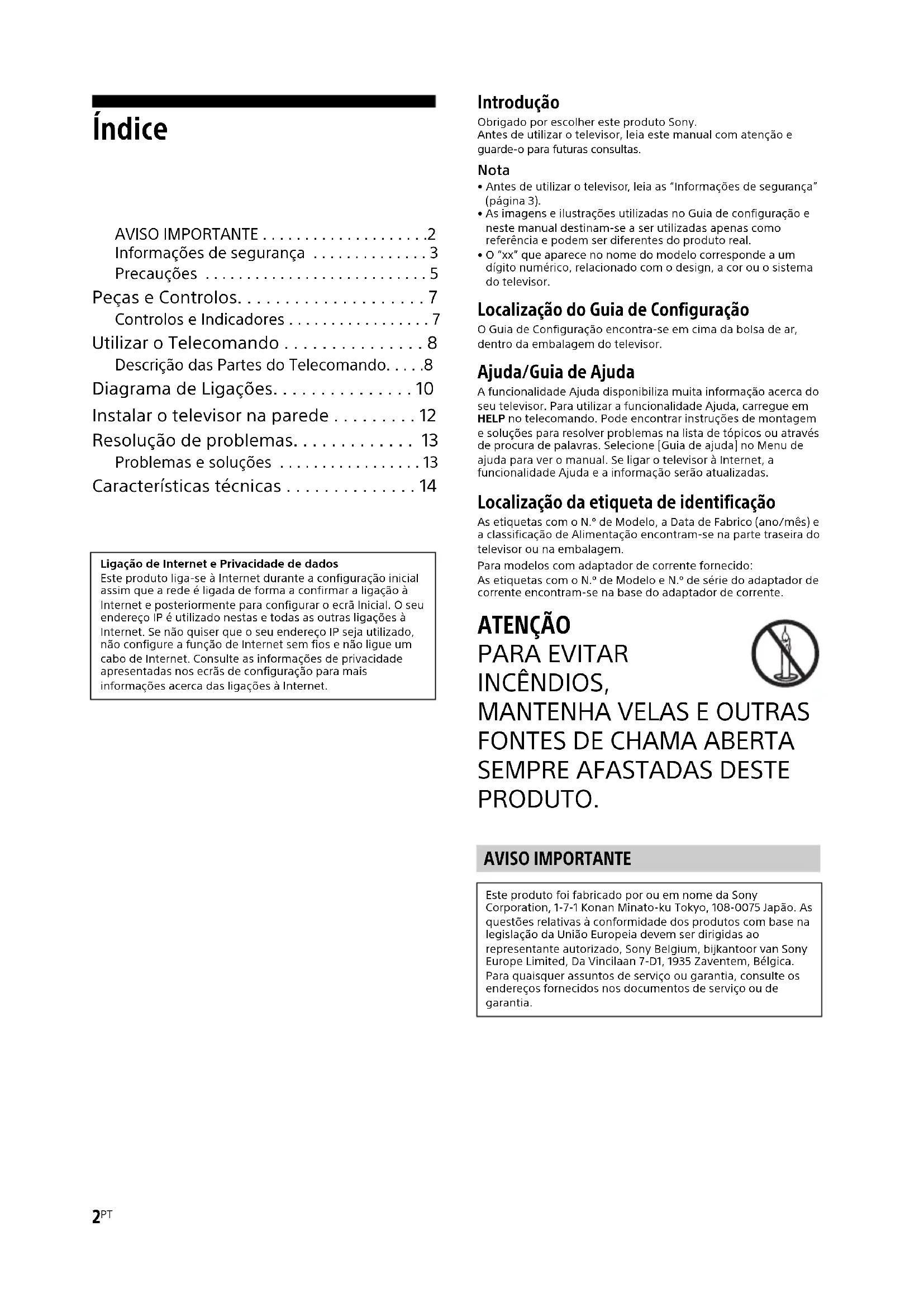 - Antes de utilizar o televisor, leia as “Informações de segurança” (página 3).• As imagens e ilustrações utilizadas no Guia de configuração e neste manual destinam-se a ser utilizadas apenas como referência e podem ser diferentes do produto real.• O “xx” que aparece no nome do modelo corresponde a um dígito numérico, relacionado com o design, a cor ou o sistema do televisor. Localização do Guia de Configuração O Guia de Configuração encontra-se em cima da bolsa de ar, dentro da embalagem do televisor. Ajuda/Guia de Ajuda A funcionalidade Ajuda disponibiliza muita informação acerca do seu televisor. Para utilizar a funcionalidade Ajuda, carregue em HELP no telecomando. Pode encontrar instruções de montagem e soluções para resolver problemas na lista de tópicos ou através de procura de palavras. Selecione [Guia de ajuda] no Menu de ajuda para ver o manual. Se ligar o televisor à Internet, a funcionalidade Ajuda e a informação serão atualizadas. Localização da etiqueta de identificação As etiquetas com o N.º de Modelo, a Data de Fabrico (ano/mês) e a classificação de Alimentação encontram-se na parte traseira do televisor ou na embalagem.Para modelos com adaptador de corrente fornecido:As etiquetas com o N.º de Modelo e N.º de série do adaptador de corrente encontram-se na base do adaptador de corrente. ATENÇÃO PARA EVITAR INCÊNDIOS,