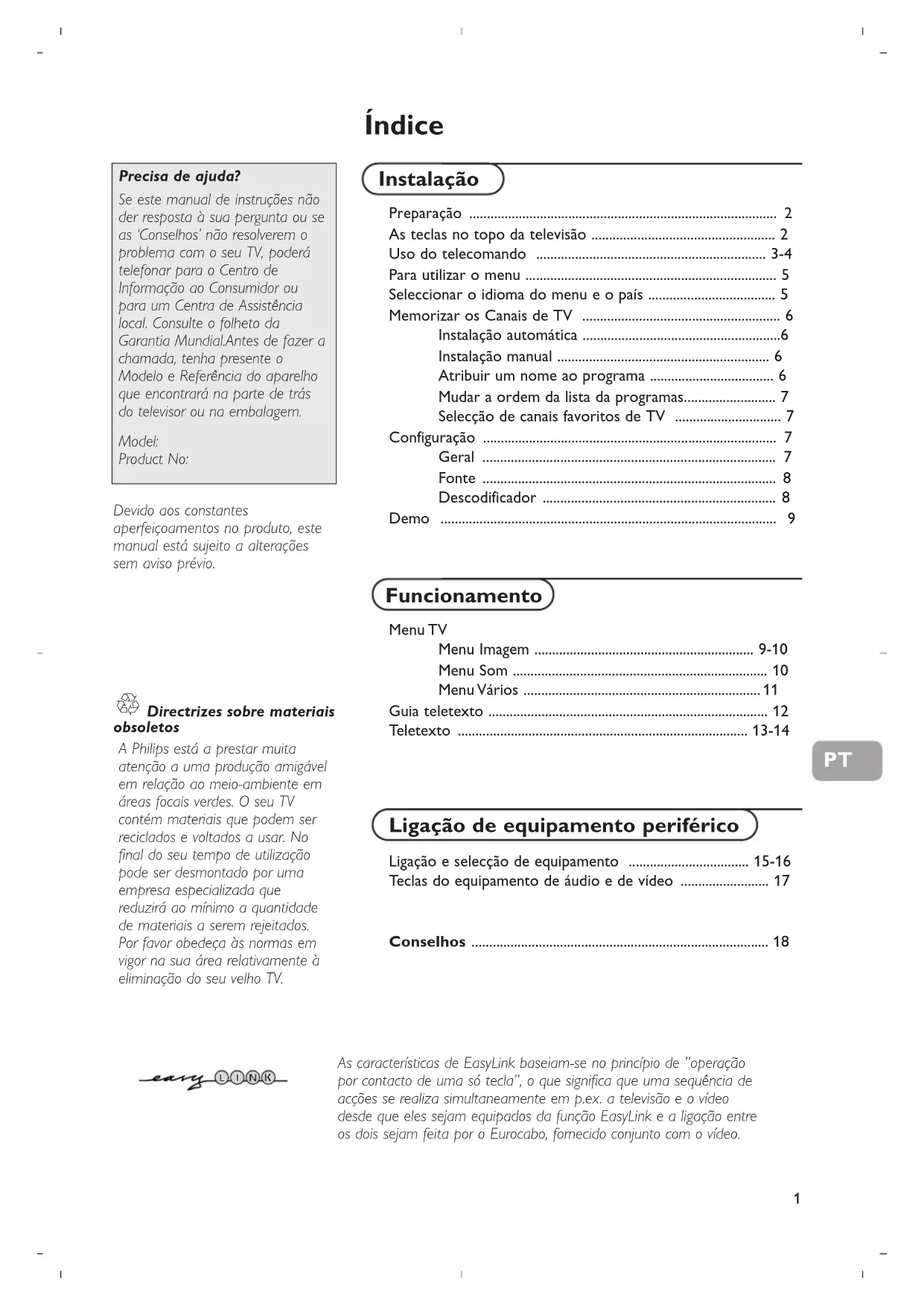 Directrizes sobre materiais obsoletos A Philips está a prestar muita atenção a uma produção amigável em relação ao meio-ambiente em áreas focais verdes. O seu TV contém materiais que podem ser reciclados e voltados a usar. No final do seu tempo de utilização pode ser desmontado por uma empresa especializada que reduzirá ao mínimo a quantidade de materiais a serem rejeitados. Por favor obedeça às normas em vigor na sua área relativamente à eliminação do seu velho TV. Precisa de ajuda? Se este manual de instruções não der resposta à sua pergunta ou se as ‘Conselhos’ não resolverem o problema com o seu TV, poderá telefonar para o Centro de Informação ao Consumidor ou para um Centra de Assistência local. Consulte o folheto da Garantia Mundial.Antes de fazer a chamada, tenha presente o Modelo e Referência do aparelho que encontrará na parte de trás do televisor ou na embalagem. Model: Product No: Devido aos constantes aperfeiçoamentos no produto, este manual está sujeito a alterações sem aviso prévio. PT2 & Coloque o TV numa superfície sólida. Para obter uma boa ventilação, deixe um espaço com pelo menos 5 cm em redor do aparelho. Não coloque o TV sobre superfícies alcatifadas. Para evitar quaisquer falhas e situações de insegurança, convém não colocar objectos sobre o aparelho. Evite qualquer fonte de calor e de luz solar directa e a exposição directa à chuva ou à água. é Introduza com firmeza a ficha da antena na respectiva tomada x situada na parte de trás do TV. “ Introduza a ficha do cabo de alimentação na tomada da parede que tenha uma voltagem de 220V-240V. ‘ Telecomando: Introduza as 2 pilhas que são fornecidas (tipo R6 - 1.5 V). As pilhas fornecidas não contêm os metais pesados de mercúrio e de cádmio. Informe-se acerca das disposições locais sobre o destino de pilhas gastas. ( Ligar o TV: Carregue no comutador de ligação A.A na frente do seu aparelho. Iluminar-se-ão um indicador azul na frente do seu TV e o ecrã. Se o TV estiver no modo de espera (indicador vermelha), carregue nas teclas -P+ ou B no telecomandono telecomando. Preparação