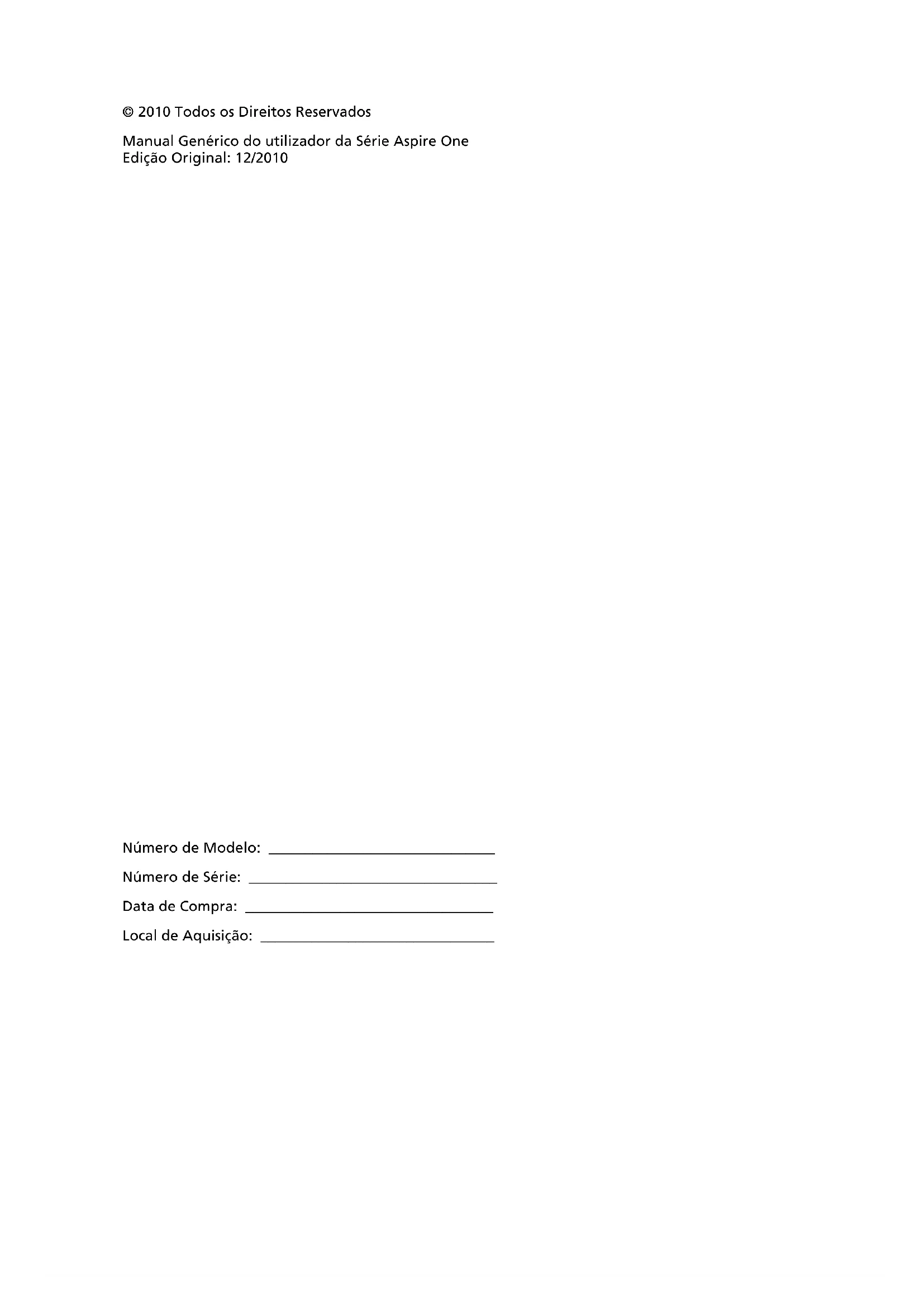 - v'n Pixel fault class Class IISérie Aspire One Manual Genérico do utilizadorNúmero de Modelo: _______________________________ Número de Série: __________________________________ Data de Compra: __________________________________ Local de Aquisição: ________________________________ © 2010 Todos os Direitos Reservados Manual Genérico do utilizador da Série Aspire One Edição Original: 12/2010iii Informações relativas à sua segurança e conforto Instruções de segurança Leia este manual com atenção. Guarde este documento para futuras consultas. Siga todas as advertências e instruções marcadas no produto. Desligar o produto antes de limpar Desligue este produto da tomada de parede antes de limpá-lo. Não use produtos de limpeza líquidos nem aerossóis. Para limpeza, utilize um tecido humedecido com água. CUIDADO com a tomada ao desconectar do dispositivo Siga as seguintes orientações ao conectar e desconectar o aparelho na fonte de alimentação: Instale a fonte de alimentação antes de conectar o cabo de alimentação à tomada CA. Desconecte o cabo de alimentação antes de remover a fonte de alimentação do computador. Se o sistema tiver várias fontes de alimentação, desconecte a alimentação do sistema retirando todos os cabos de alimentação das respectivas fontes. CUIDADO com Acessibilidade Certifique-se de que a tomada em que conecta o cabo seja de fácil acesso e localizada o mais próximo possível do operador do equipamento. Quando precisar desconectar a alimentação do equipamento, certifique-se de retirar o cabo da tomada elétrica. ATENÇÃO à(s) protecção(ões) de plástico incluídas (apenas para determinados modelos) O seu computador foi enviado com uma protecção plástica instalada nas ranhuras de cartões. Elas protegem os slots não usados contra poeira, objetos metálicos e outras partículas. Guarde as protecções para usar quando não houver cartões nas ranhuras. CUIDADO a ter quando está a ouvir Para proteger a sua audição, siga estas instruções.