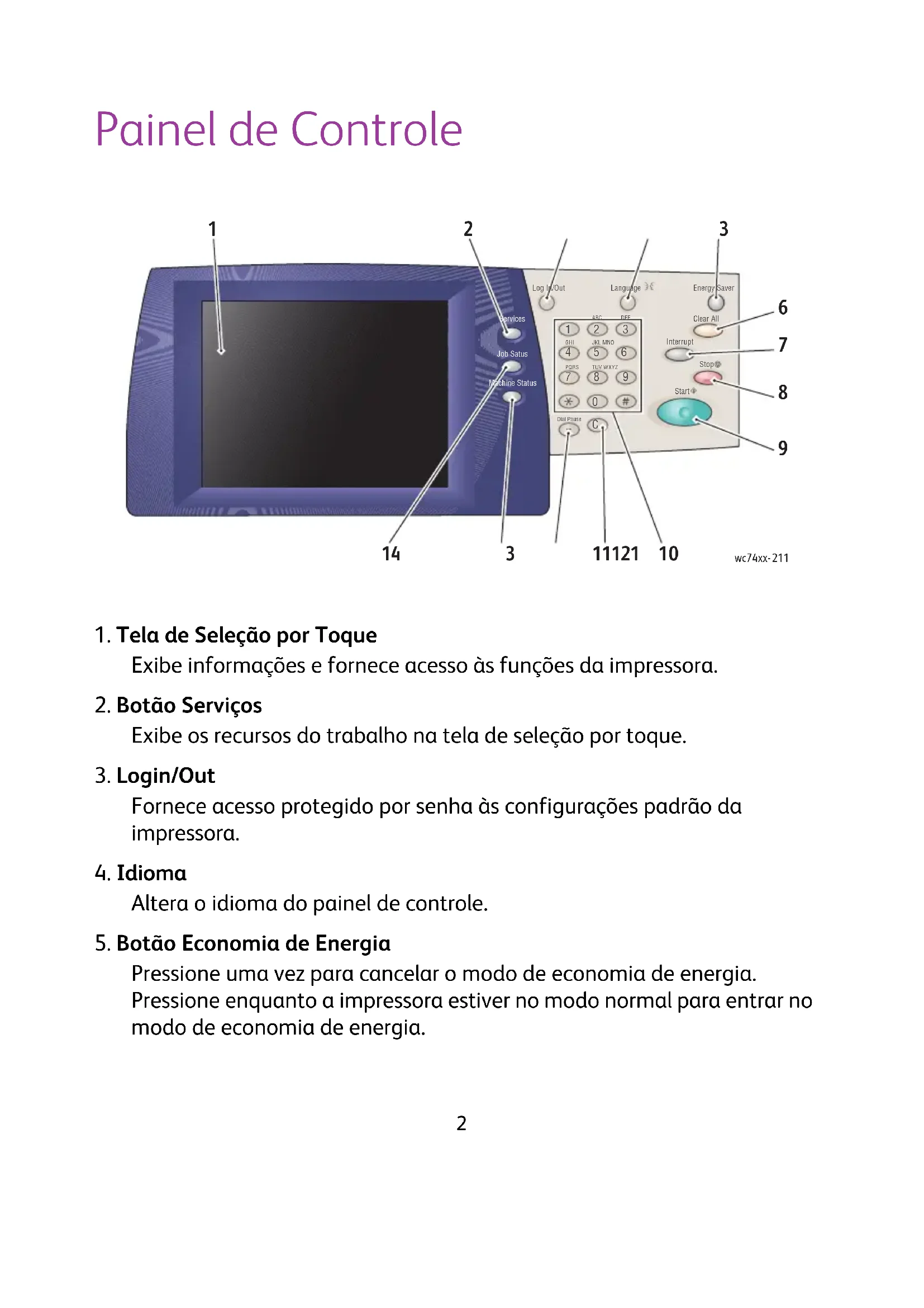 - , a Xerox Corporation determinou que este produto atende às diretrizes da E NERGY STAR em termos de eficiência no consumo de energia. O nome e o logotipo E NERGY STAR são marcas registradas nos EUA.1 Conteúdo Painel de Controle p. 2