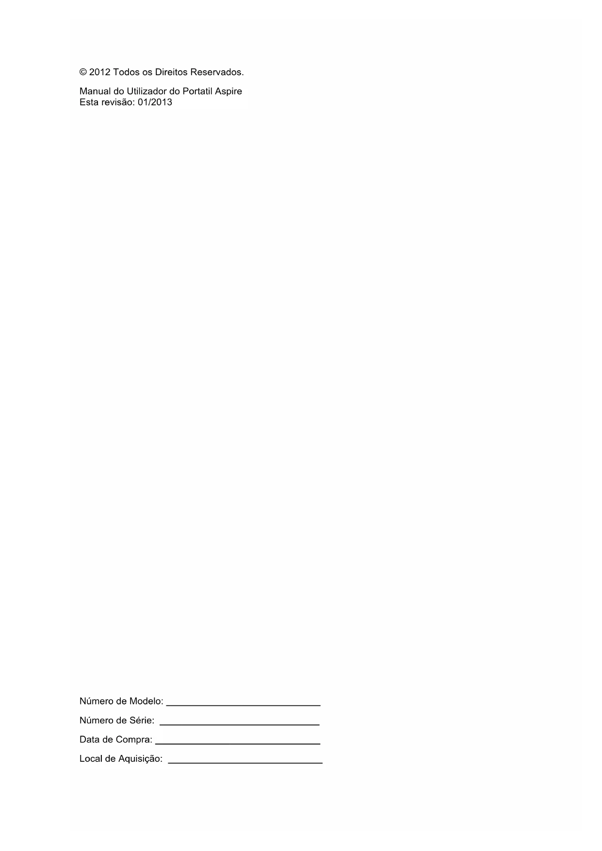- v'n Pixel fault class Class II Part no.: Ver.: 01.01.06Portátil Aspire Manual do UtilizadorNúmero de Modelo: _____________________________ Número de Série: ______________________________ Data de Compra: _______________________________ Local de Aquisição: _____________________________ Poderá haver alterações periódicas às informações contidas na presente publicação sem qualquer obrigação de notificação sobre tais revisões ou alterações. As eventuais alterações serão incorporadas nas novas edições deste manual ou de documentos e publicações suplementares. A empresa não faz quaisquer afirmações nem garantias, sejam elas expressas ou implícitas, relativamente aos conteúdos da presente, e rejeita especificamente as garantias implícitas relativamente à comercialidade e à aptidão para um fim específico. Escreva o número de modelo, número de série, data e local de aquisição no espaço em baixo. O número de série e o número de modelo encontram-se na etiqueta afixada no computador. Toda a correspondência relativa à sua unidade deve incluir o número de série, o número de modelo e as informações relativas à aquisição. Nenhuma parte da presente publicação pode ser reproduzida, guardada em sistemas de armazenamento de dados ou transmitida, de alguma forma ou através de qualquer meio, seja ele electrónico, mecânico, por fotocópia, gravação ou de outra forma, sem a autorização prévia e por escrito da Acer Incorporated. © 2012 Todos os Direitos Reservados. Manual do Utilizador do Portatil Aspire Esta revisão: 01/2013iii Português Português Informações relativas à sua segurança e conforto Instruções de segurança Leia este manual com atenção. Guarde este documento para futuras consultas. Siga todas as advertências e instruções marcadas no produto. Desligar o produto antes de limpar Desligue este produto da tomada de parede antes de limpá-lo. Não use produtos de limpeza líquidos nem aerossóis. Para limpeza, utilize um tecido humedecido com água. CUIDADO com a tomada ao desconectar do dispositivo Siga as seguintes orientações ao conectar e desconectar o aparelho na fonte de alimentação: Instale a fonte de alimentação antes de conectar o cabo de alimentação à tomada CA. Desconecte o cabo de alimentação antes de remover a fonte de alimentação do computador. Se o sistema tiver várias fontes de alimentação, desconecte a alimentação do sistema retirando todos os cabos de alimentação das respectivas fontes. CUIDADO com Acessibilidade Certifique-se de que a tomada em que conecta o cabo seja de fácil acesso e localizada o mais próximo possível do operador do equipamento. Quando precisar desconectar a alimentação do equipamento, certifique-se de retirar o cabo da tomada elétrica. ATENÇÃO à(s) protecção(ões) de plástico incluídas (apenas para determinados modelos) O seu computador foi enviado com uma protecção plástica instalada nas ranhuras de cartões. Elas protegem os slots não usados contra poeira, objetos metálicos e outras partículas. Guarde as protecções para usar quando não houver cartões nas ranhuras.iv Português Português Avisos