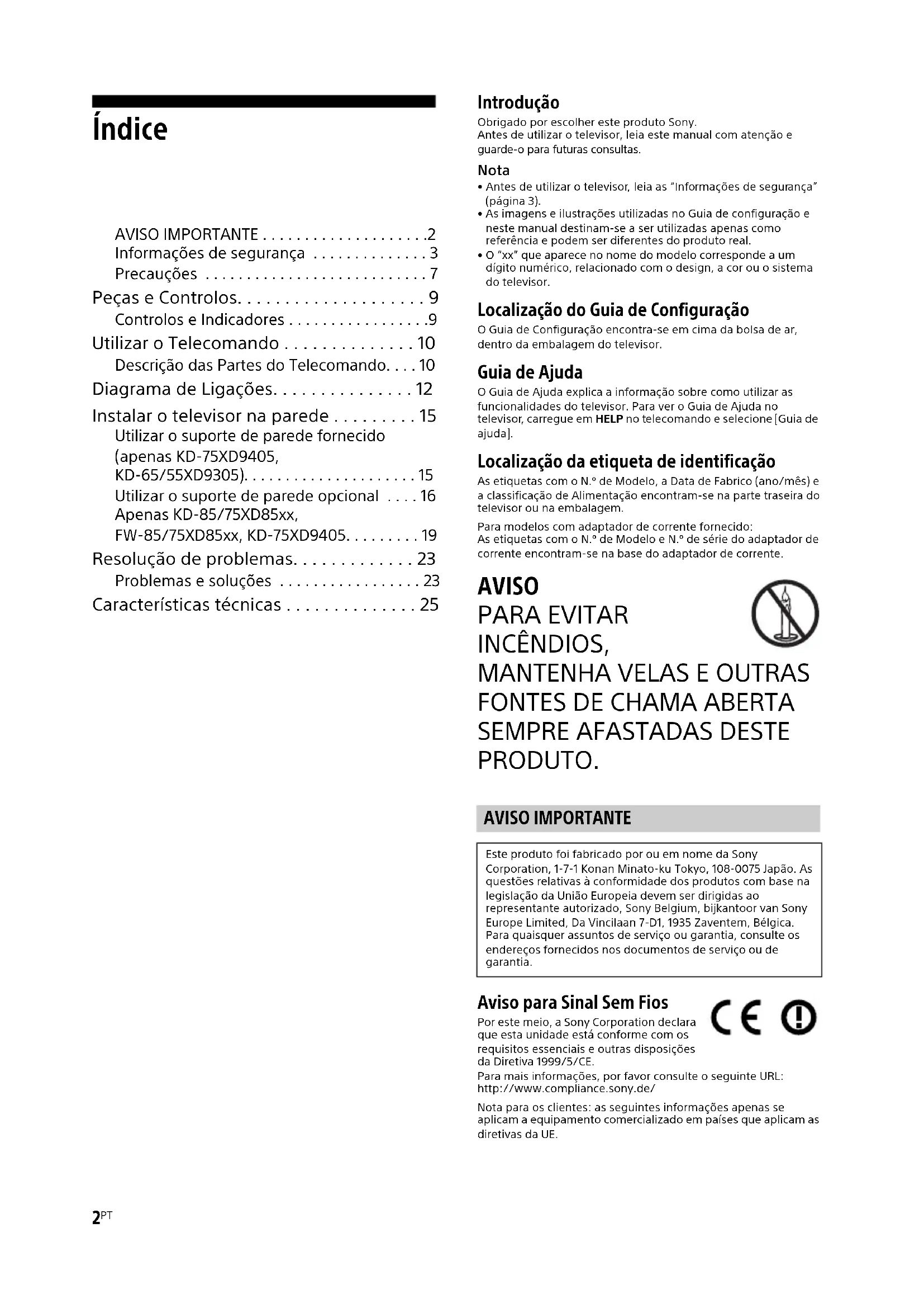 D:\_SONY TV\SY150217_QH 85 EU RG\4584644151\06_4584644151_PT\010COVTOC_PT.fm masterpage: Right KD-85XD85xx / 75XD9405 / 75XD85xx / 65XD9305 / 65XD85xx / 55XD9305 / 55XD85xx / FW-85XD85xx / 75XD85xx / 65XD85xx / 55XD85xx 4-584-644-15(1) O sistema sem fios de televisor pode ser utilizado nos seguintes países: AT, BE, HR, CY, CZ, DK, EE, FI, FR, DE, GR, HU, IE, IT, LV, LT, LU, MT, NL, PL, PT, SK, SI, ES, SE, GB, IS, LI, NO, CH, BG, RO, TR, AL, BA, MK, MD, RS, ME, Kosovo Este equipamento pode ser utilizado noutros países não europeus. ATENÇÃO As bateria não podem ser expostas a calor excessivo, como à luz do sol, perto do fogo ou situações semelhantes. Nunca coloque o televisor num local instável. O televisor pode cair, causando ferimentos pessoais ou morte. Muitos ferimentos, em particular nas crianças, podem ser evitados tomando simples precauções como: Utilizar caixas ou bases recomendadas pelo fabricante do televisor. Utilizar apenas mobiliário que consiga suportar em segurança o televisor. Assegurar que o televisor não se encontra na extremidade do mobiliário de suporte. Não colocar o televisor em mobiliário alto ( por exemplo, armários ou estantes) sem fixar ambos, o mobiliário e o televisor, a um suporte adequado. Não colocar o televisor com panos ou outros materiais que fiquem entre o televisor e o mobiliário de suporte. Educar as crianças para os perigos de subir ao mobiliário para alcançar o televisor ou os comandos. Se o seu televisor está a ser guardado e mudado de sítio, devem ser aplicadas as mesmas considerações. Instalação/Programação Instale e utilize o televisor conforme as instruções abaixo para evitar todo o risco de incêndio, choque elétrico ou avaria e/ou feridas. Instalação